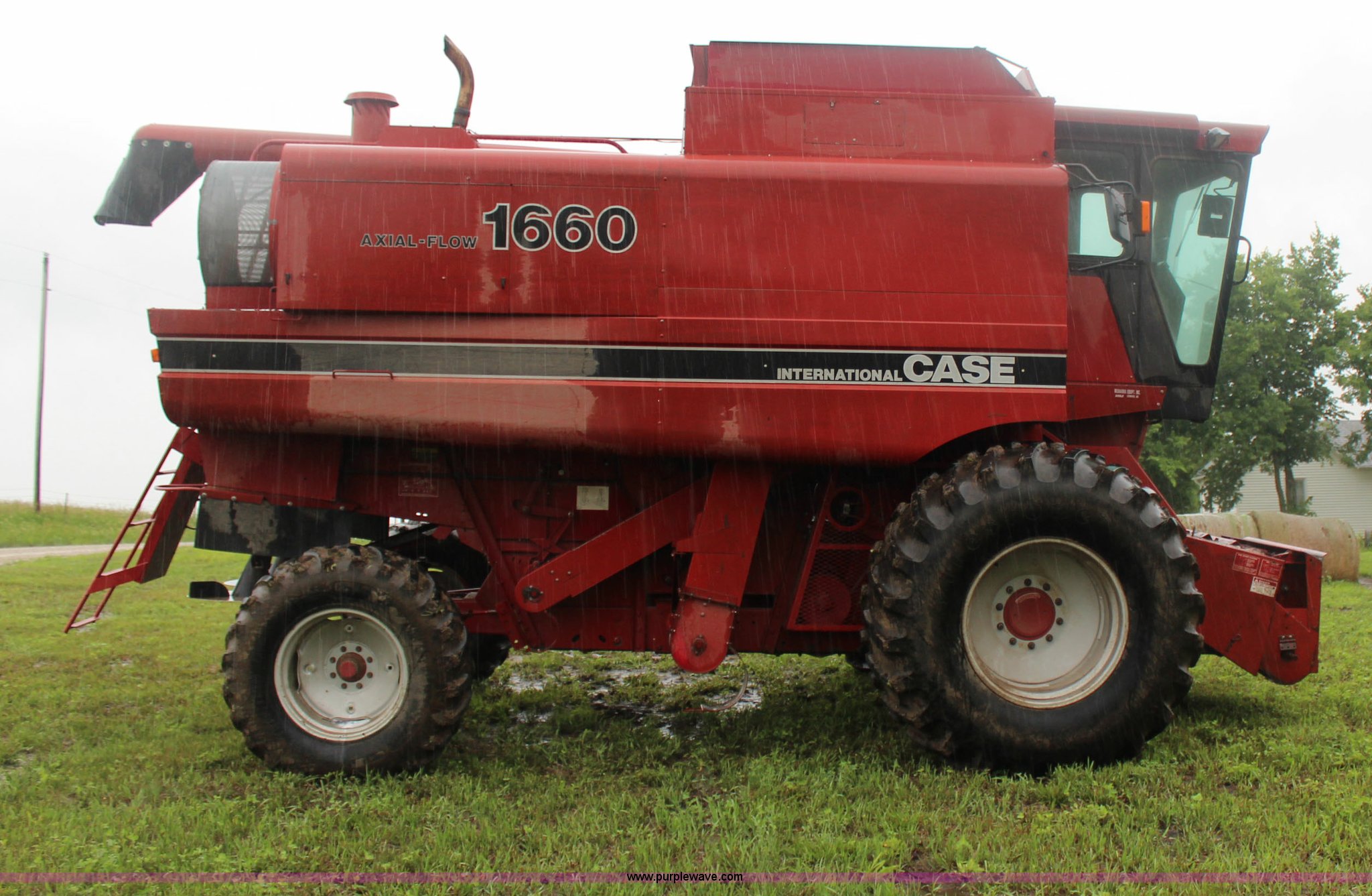 Purple Wave is selling a used Combine in Kansas. This item is a 1987 Case IH 1660 Axial-Flow combine with the following: 3,523 engine hours on meter, International 466 six cylinder diesel engine, 180 HP, Hydrostatic transmission, 3F gears, AC and heat, AM/FM, Spring suspension seat, Instructor's seat, Tilt steering wheel, Grain scan monitor, Work lights, Straw spreader, Standard rotor, Fall concaves, 24.5-32 front tires, 14.9-24 rear tires, Operator's manual, Serial 027106