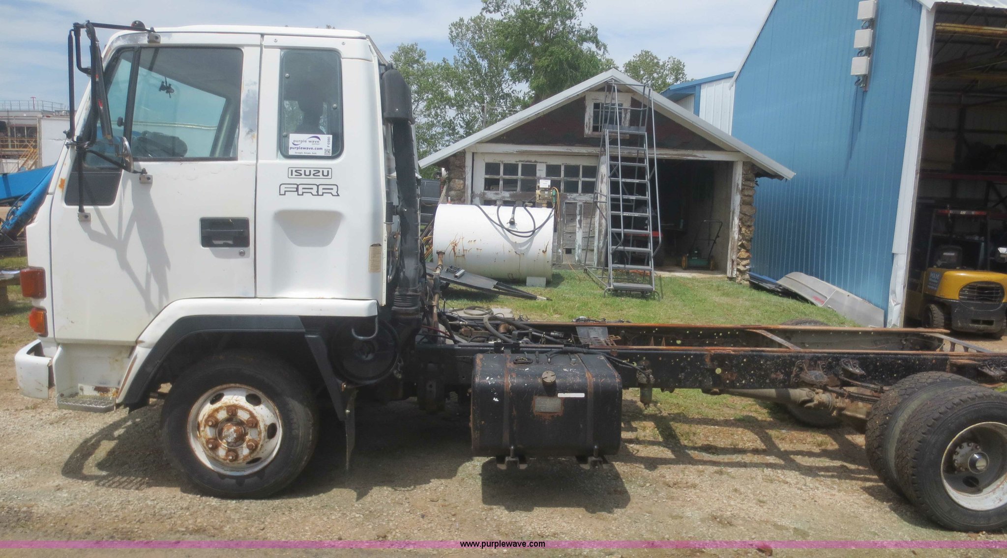 Purple Wave is selling a used Truck Chassis in Missouri. This item is a 1997 Isuzu FRR truck cab and chassis with the following: 185,947 miles on odometer, 4,463 hours on meter, Isuzu 7.1L L6 diesel engine, Four speed automatic transmission, Heat, AM/FM/cassette, Manual windows and locks, Battery disconnect switch, Chelsea PTO, Spring suspension, Air over hydraulic brakes, 150" wheelbase, 215/75R17.5 tires, GVWR 19,500 lbs, FAWR 7,060 lbs, RAWR 13,860 lbs