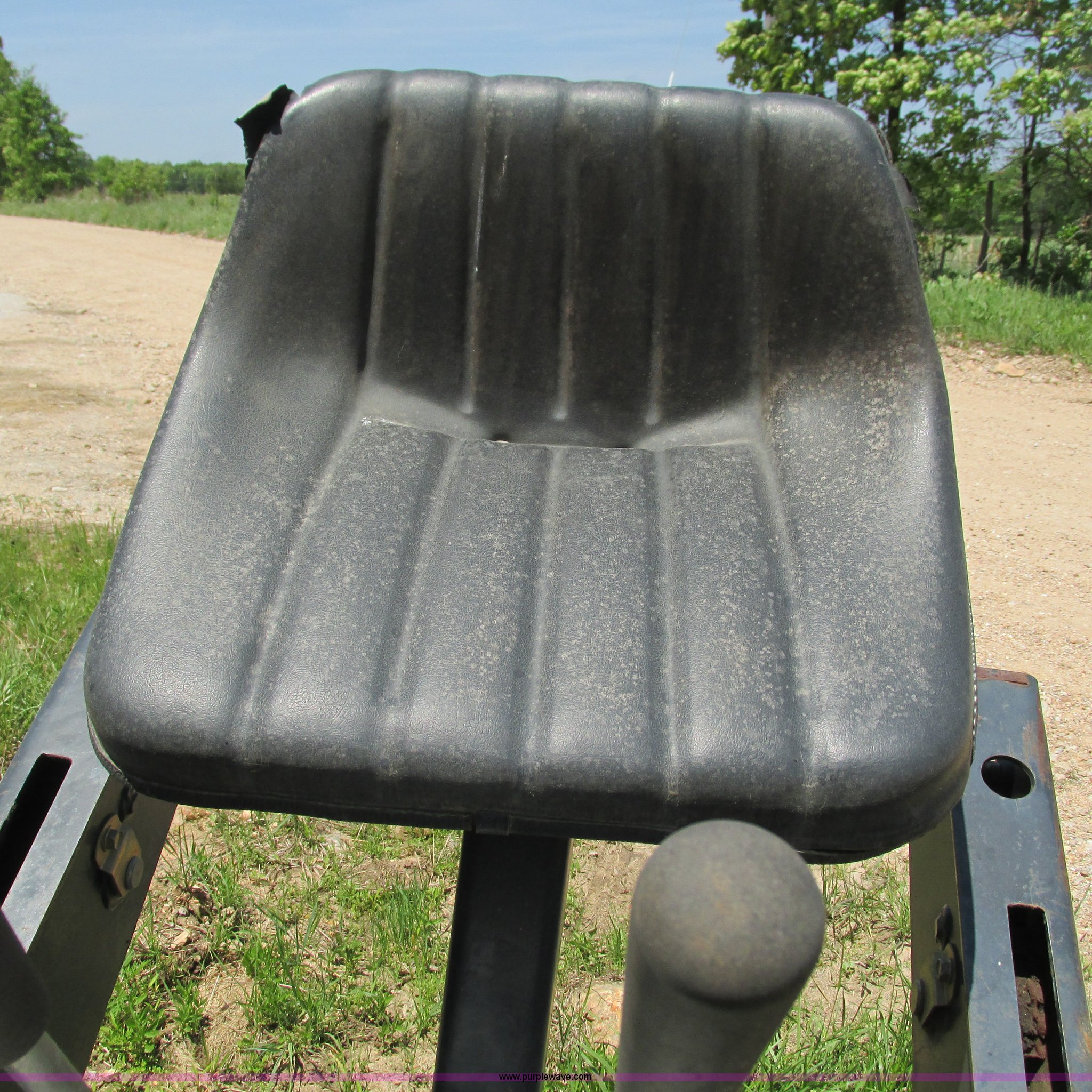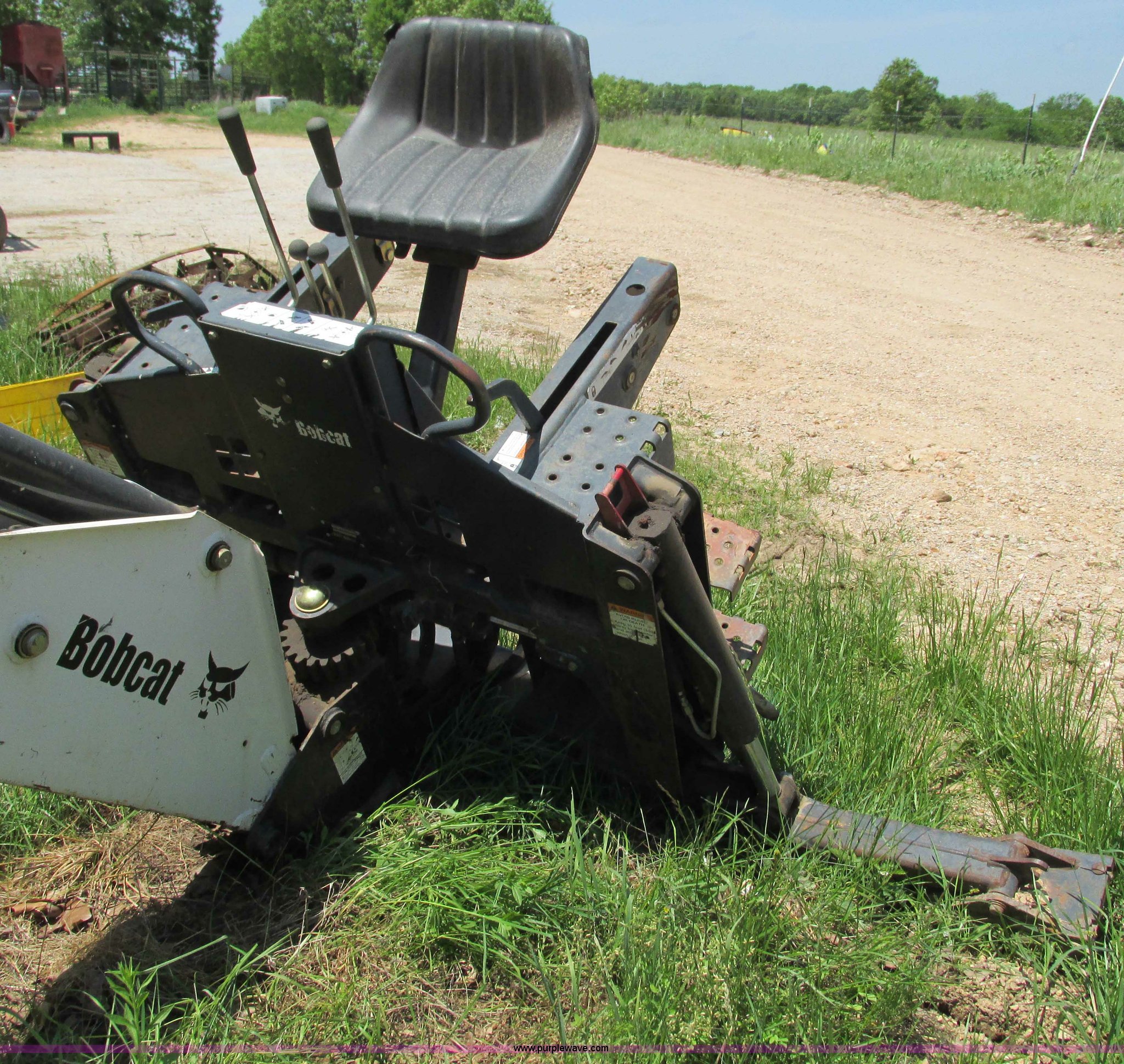 Bobcat 8709 skid steer backhoe attachment. Quick attach 17"W bucket (4) bolt-on teeth, Hydraulic stabilizers, Seat torn, Serial 880000954. Barclay Farms. Traw Hollow Road. Montreal, MO 65591