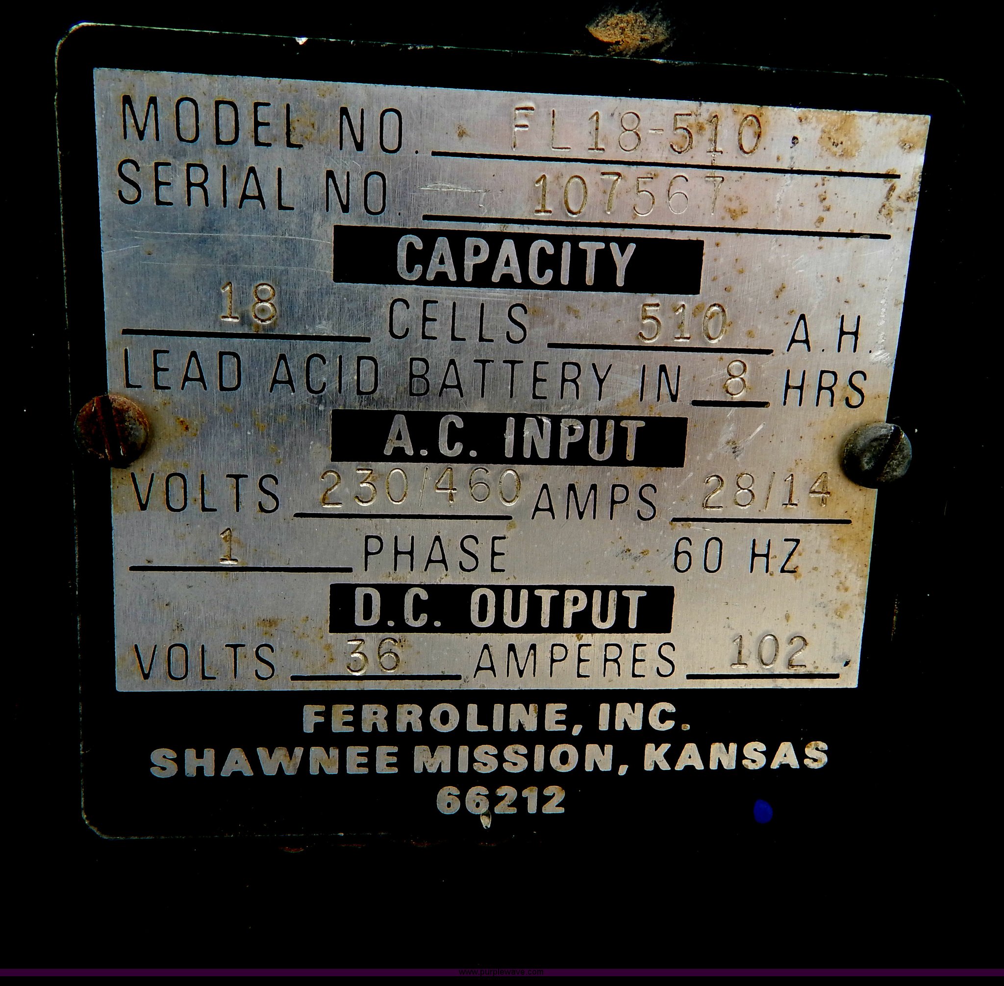 Purple Wave is selling a used Warehouse Forklift in Missouri. This item is a Forklift battery charger with the following: Model FL18-510, 36V, 230/460V, Three phase, Serial 107567