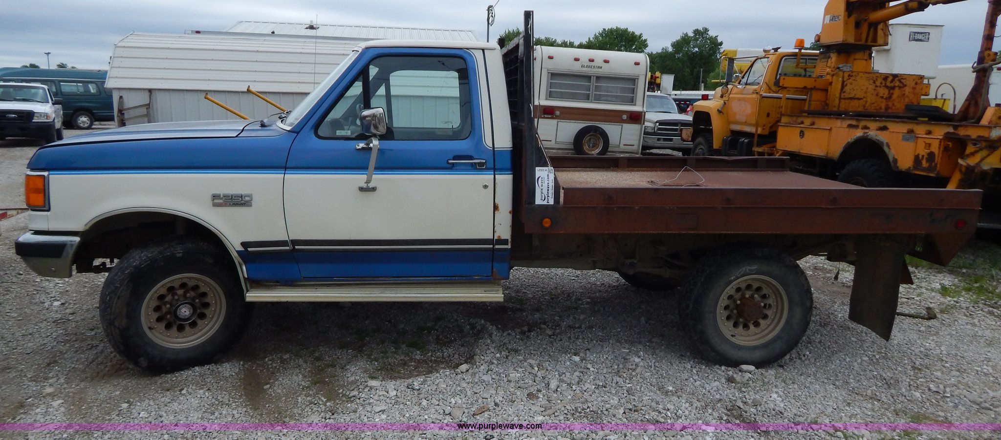 Purple Wave is selling a used 3/4 or 1 Ton Pickup or Van in Missouri. This item is a 1988 Ford F250 flatbed truck with the following: 62,466 miles on odometer, 7.5L V8 VIH 16V gas engine, Automatic transmission, Heat, Tilt, Cruise, AM/FM, Manual windows and locks, Cloth interior, Receiver hitch, Trailer wiring, 133" wheelbase, 235/85R16 tires, Interior/exterior cosmetic damage
