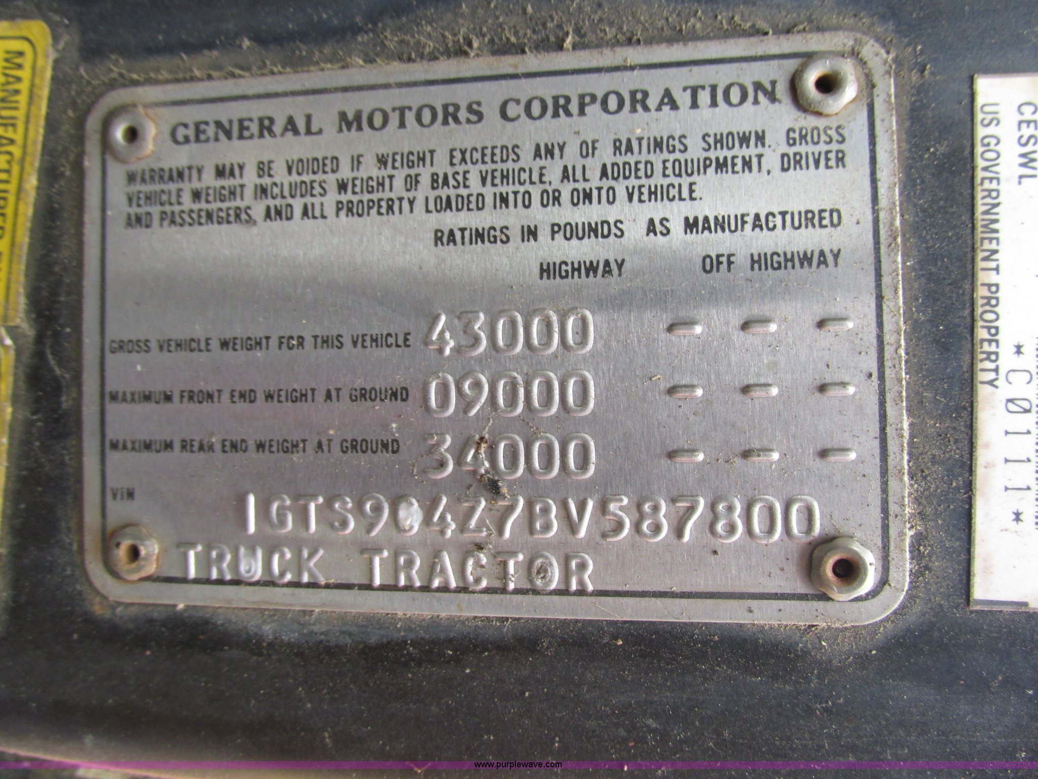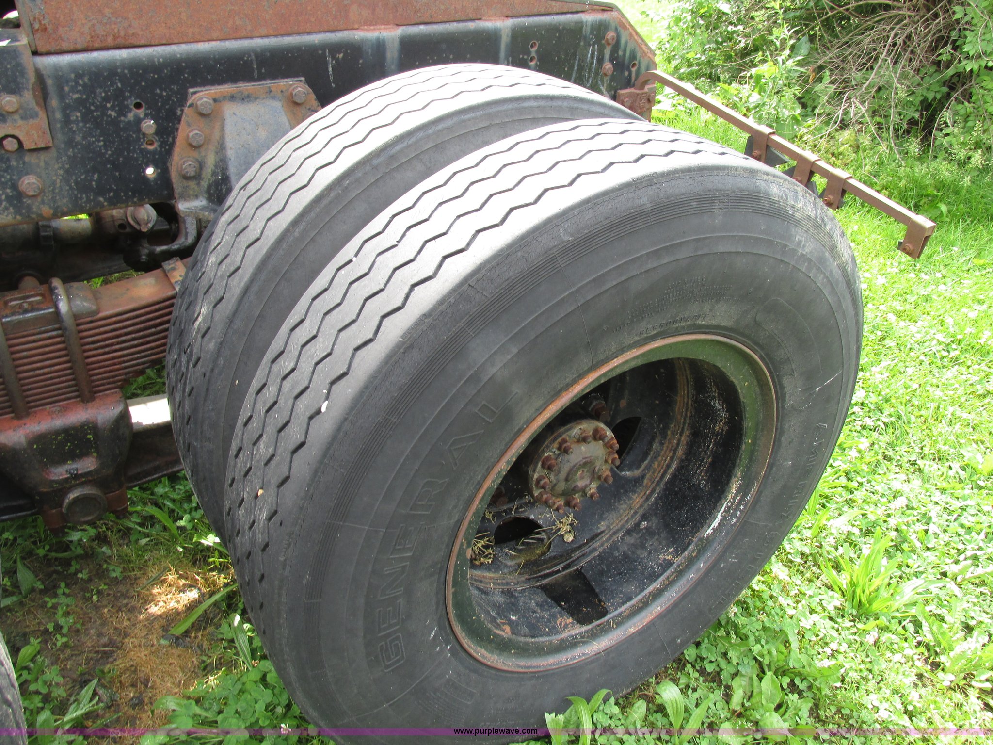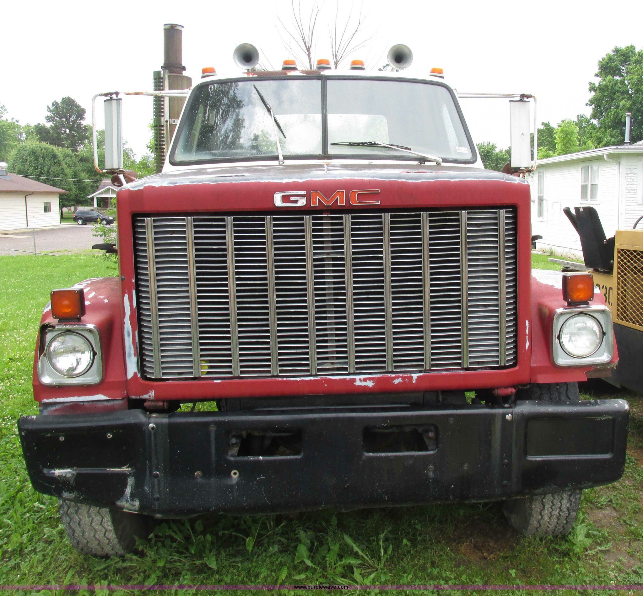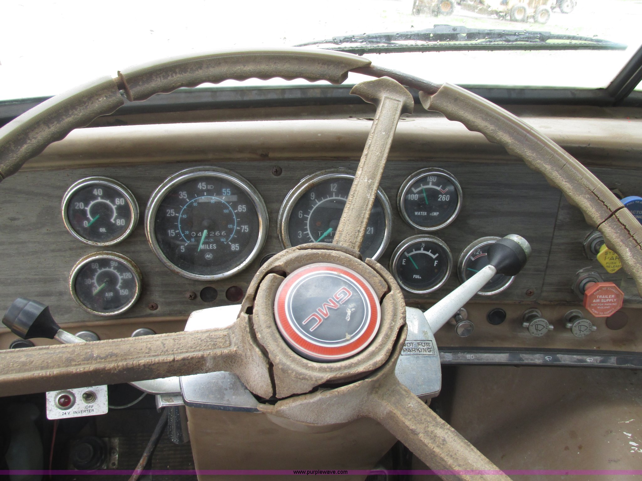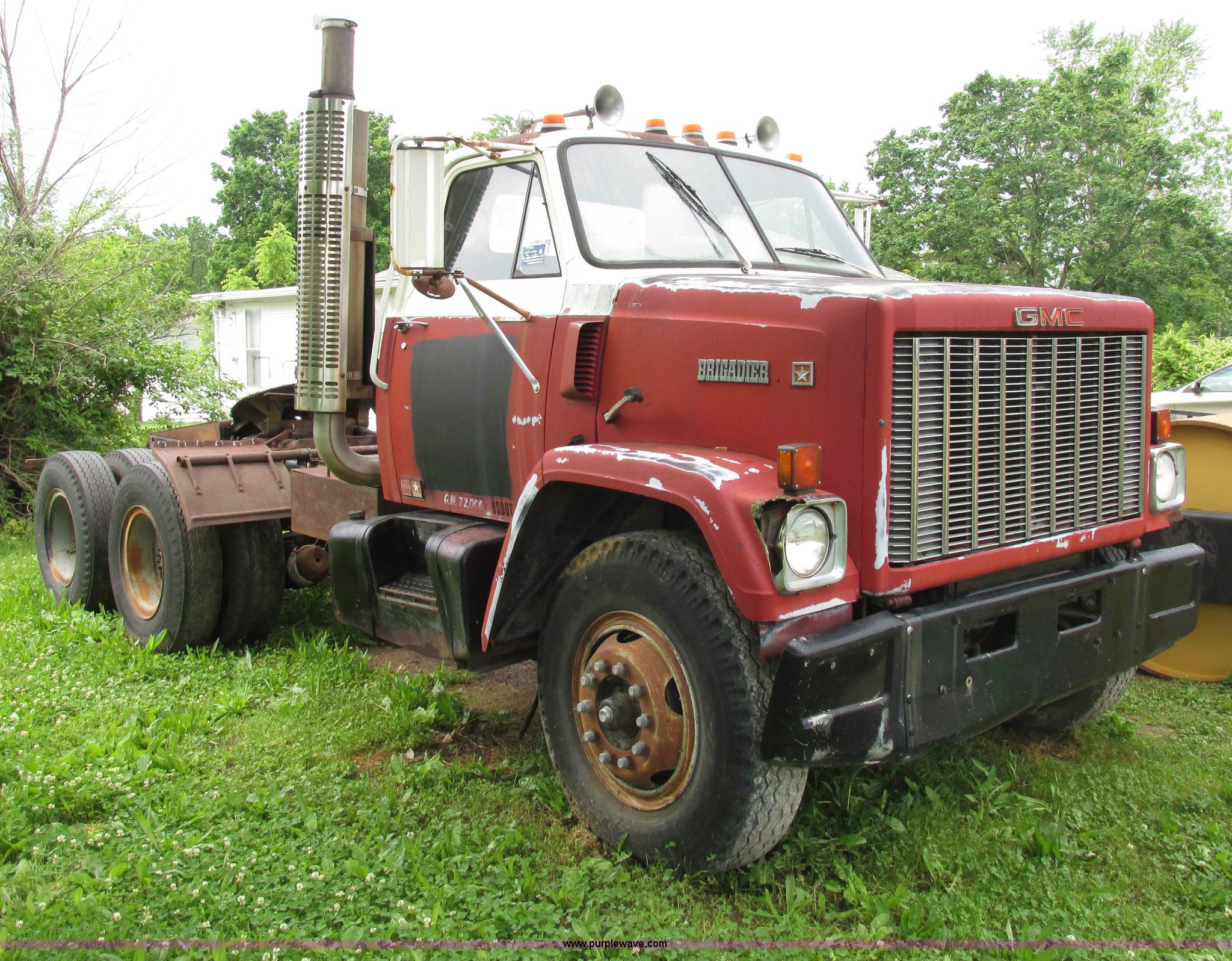 Purple Wave is selling a used Truck Tractor in Missouri. This item is a 1981 GMC Brigadier semi truck with the following: 42,266 miles on odometer, Detroit Diesel six cylinder diesel engine, 10 speed manual transmission, Auxiliary toolbox, Fifth wheel plate, Quarter fenders, Dual 40 gallon fuel tanks, Spring over walking beam suspension, Air brakes, Bud wheels, 10.00-20 tires, GVW 43,000 lbs, Recently replaced batteries, Recently replaced fuel filter, Truck will not currently prime, Unit operational prior to replacement of fuel filter and fuel
