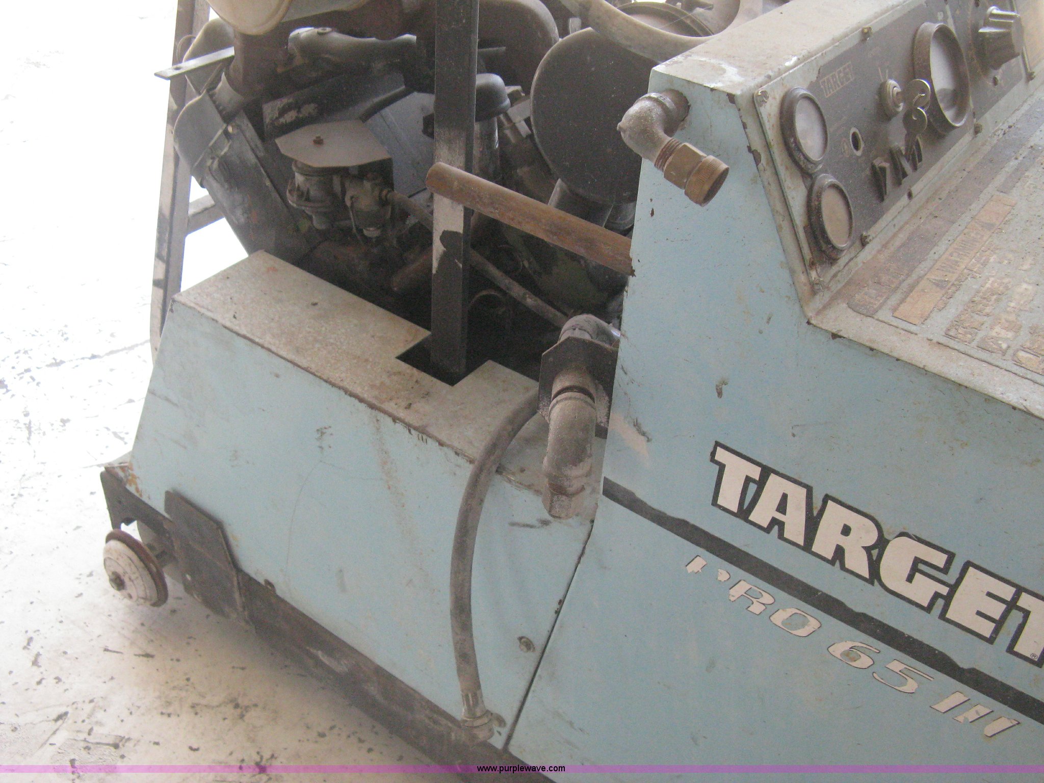 Target Pro 65III30 concrete saw. 2,197 hours on meter, Wisconsin V465D gas engine Serial 406732/6153839, Hydrostatic forward and reverse, Toggle switch blade height adjustment, Water line, Guide wheel, Hard tire idler and drive wheels, Serial 232937. Snodgrass and Sons Construction. 2700 George Washington Blvd. Wichita, KS 67210