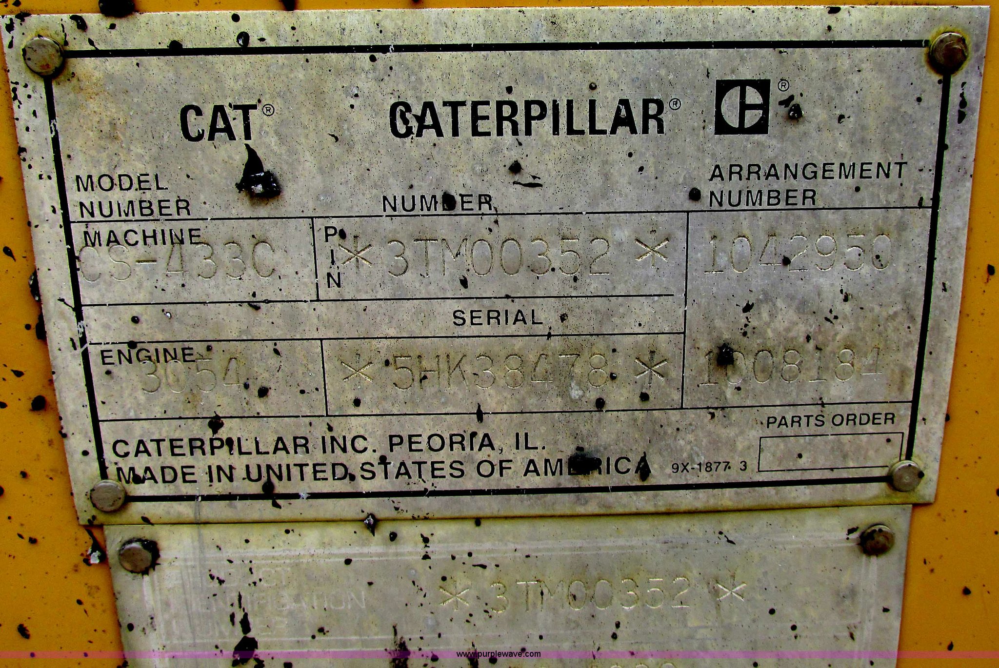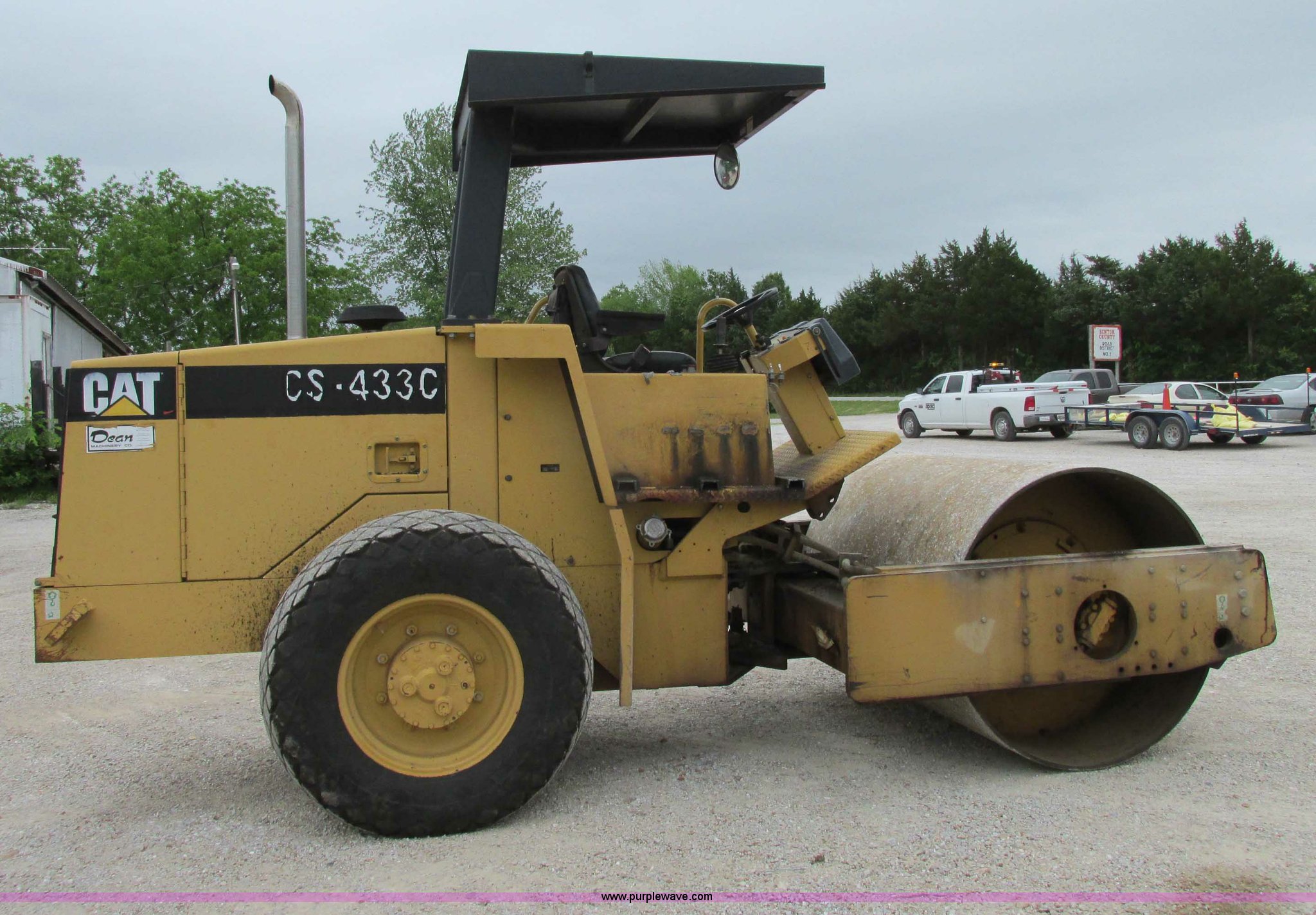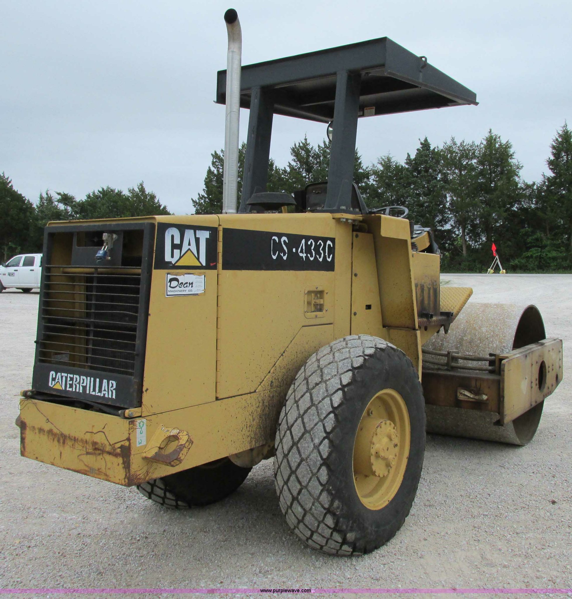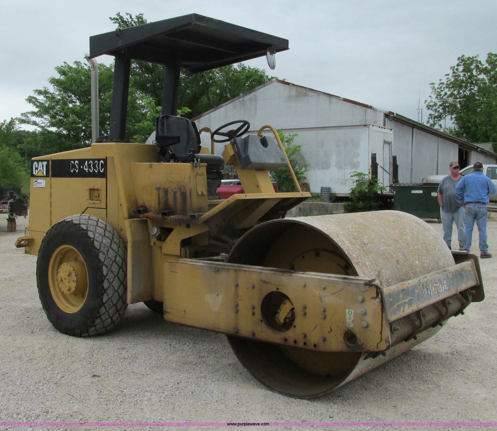Purple Wave is selling a used Single Drum Roller Compactor in Missouri. This item is a 1996 Caterpillar CS-433C vibratory roller with the following: 1,403 hours on meter, Caterpillar 3054 turbo diesel engine, 100 HP, Hydrostatic transmission, Hi-Lo, OROPS, Spring suspension seat, 66"W x 48" diameter drum, 14.9 x 24 tires, Service records available, One owner, Serial 5HK38478