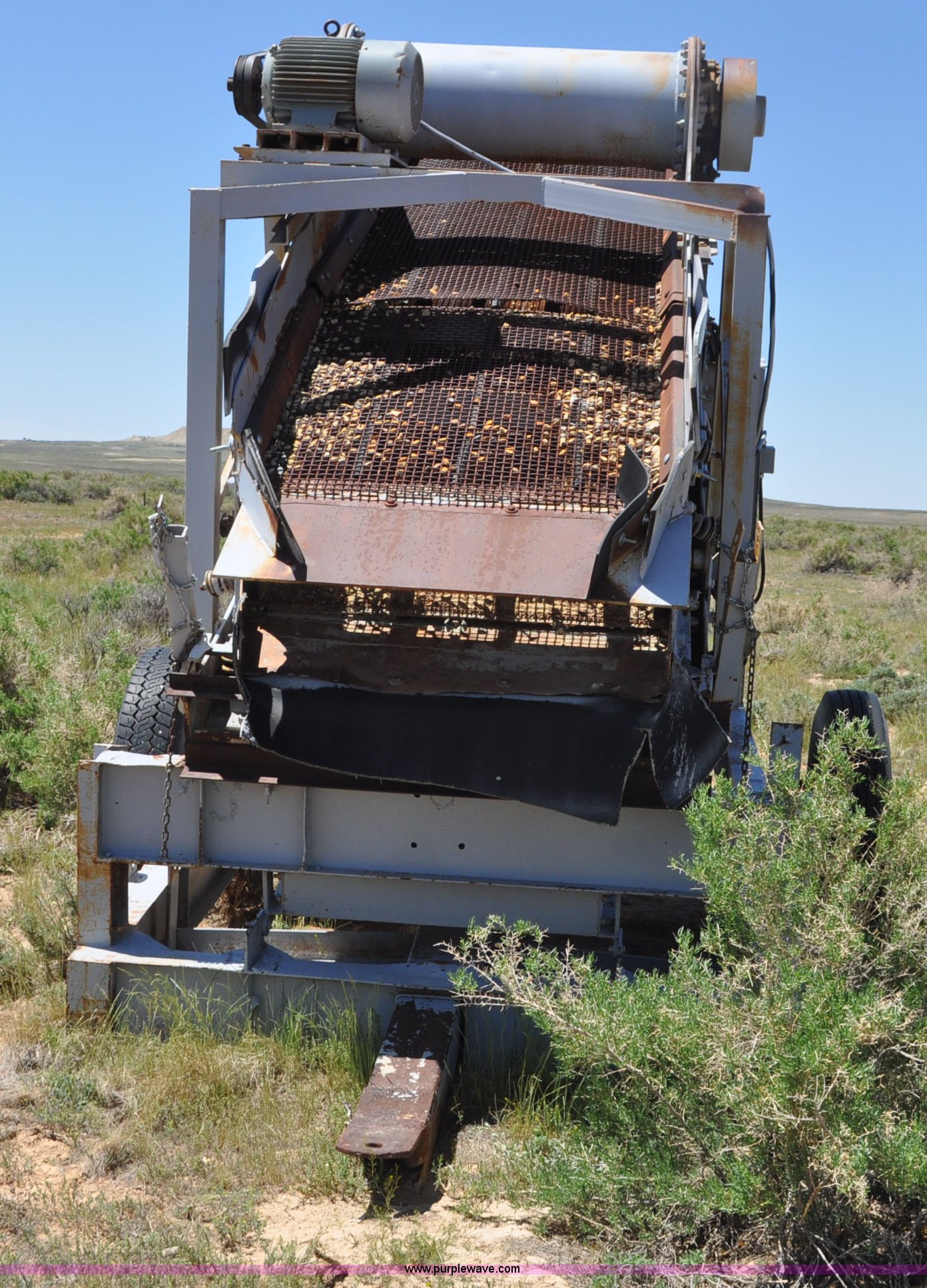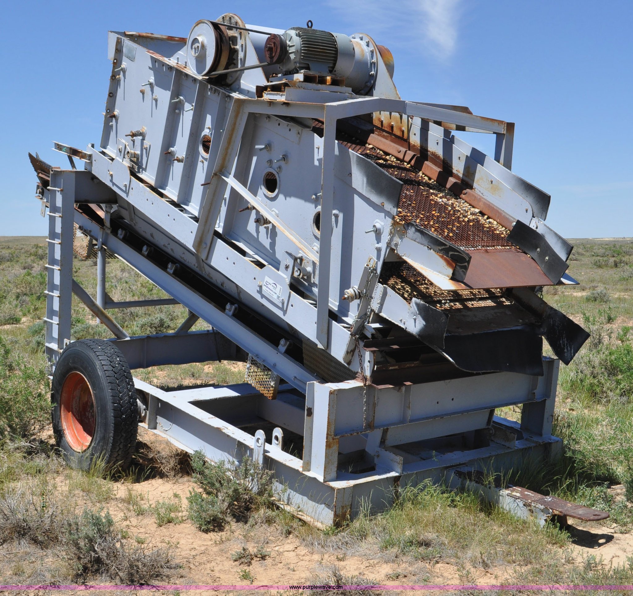 Purple Wave is selling a used Screen or Screening Plant in Wyoming. This item is a Deister vibrating screen with the following: Three phase 5 HP electric motor, Type UH2412, No. 902, Double deck screen, 12'L x 4'W screens, 3/4" and 1/8" screens, 17'L x 32"W conveyor, 22'L x 9'9"W overall dimensions, 11R22.5 tires