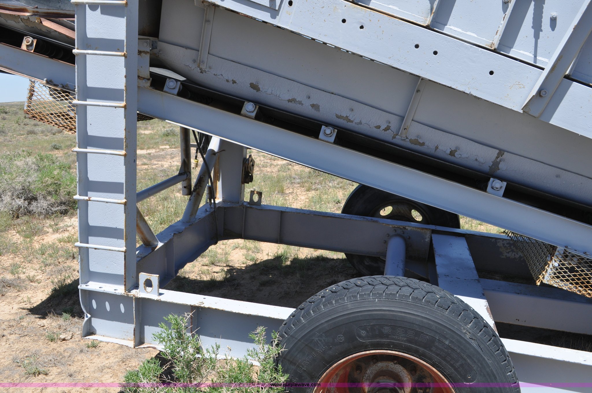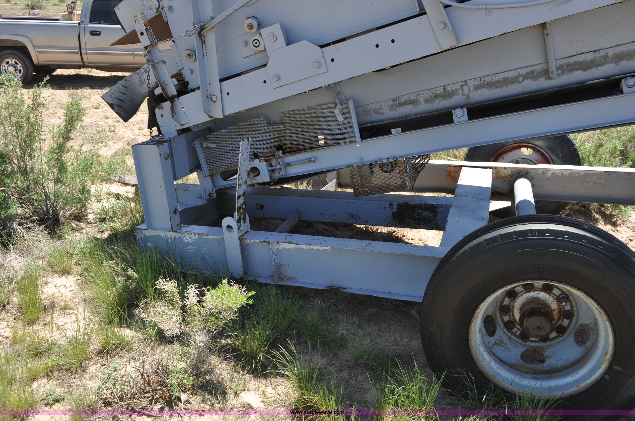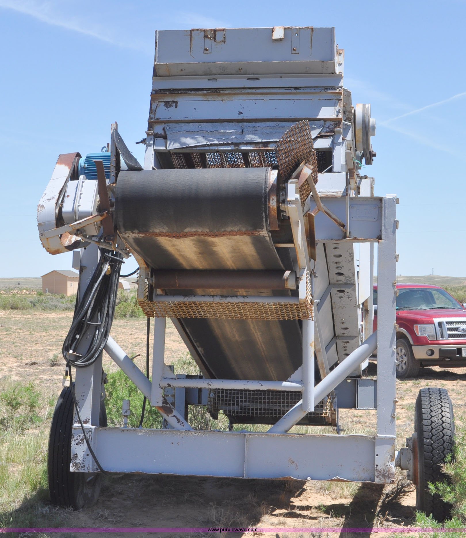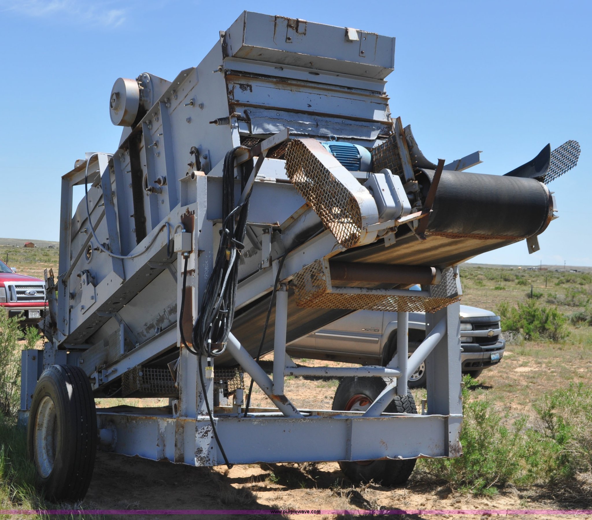 Deister vibrating screen. Three phase 5 HP electric motor, Type UH2412, No. 902, Double deck screen, 12'L x 4'W screens, 3/4" and 1/8" screens, 17'L x 32"W conveyor, 22'L x 9'9"W overall dimensions, 11R22.5 tires. Red Desert Basin, WY 82336