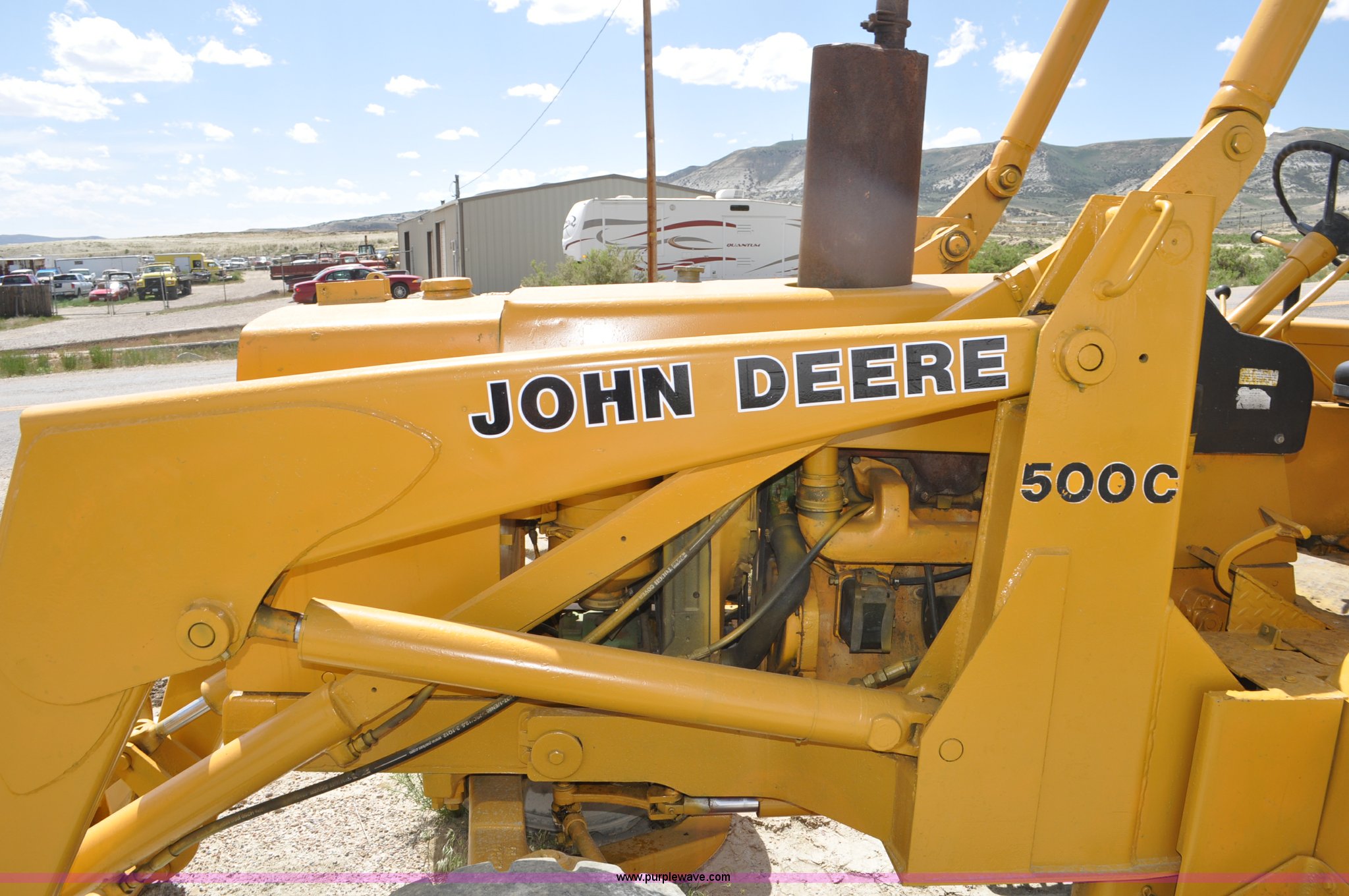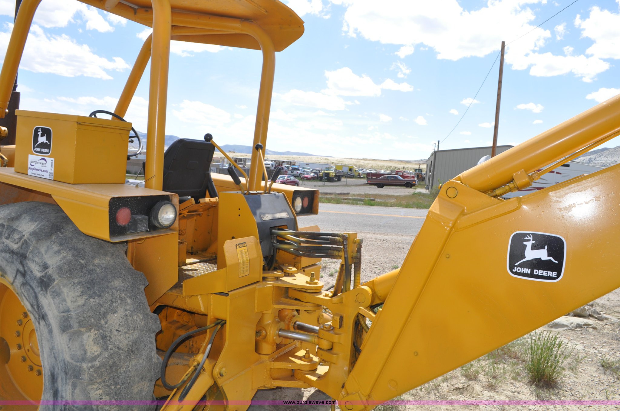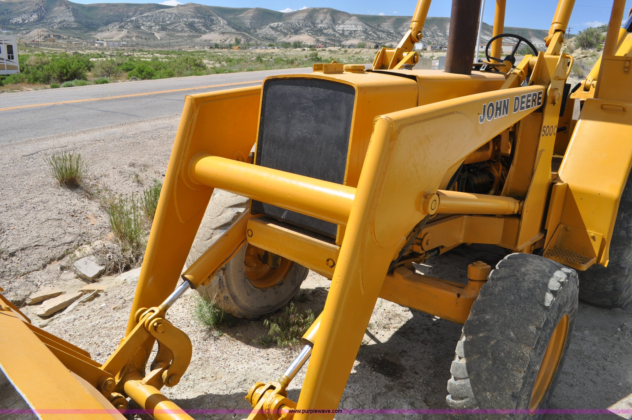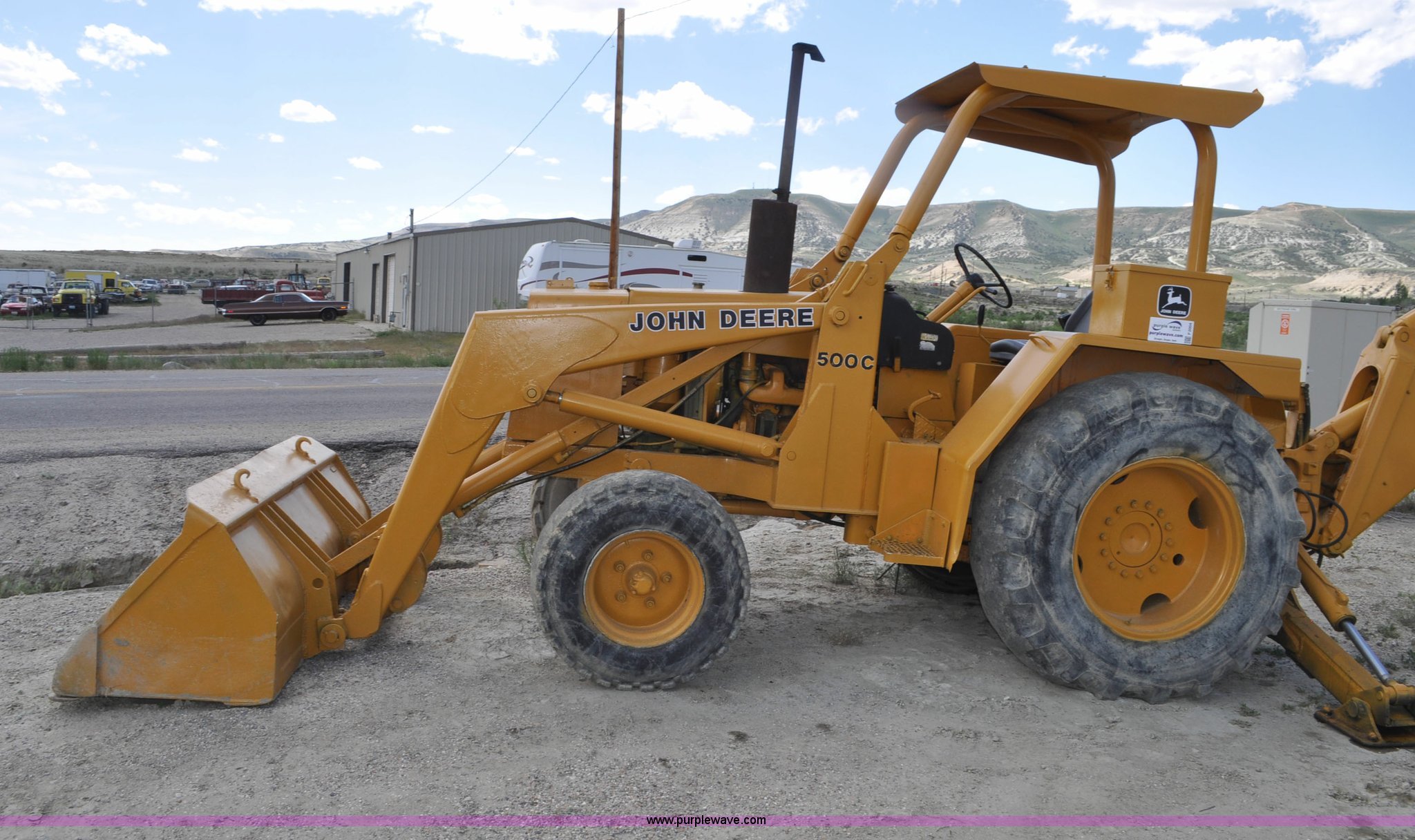 Purple Wave is selling a used Tractor Loader Backhoe in Wyoming. This item is a John Deere 500C backhoe with the following: John Deere four cylinder diesel engine, Serial 284355R, Powershift transmission, 8F-4R gears, Canopy, Spring suspension seat, Wobble stick backhoe controls, 24"W toothed backhoe bucket, 88"W loader bucket, Bolt-on cutting edge, 14-17.5 front tires, Denman 18.4-28 rear tires, Serial 154869B