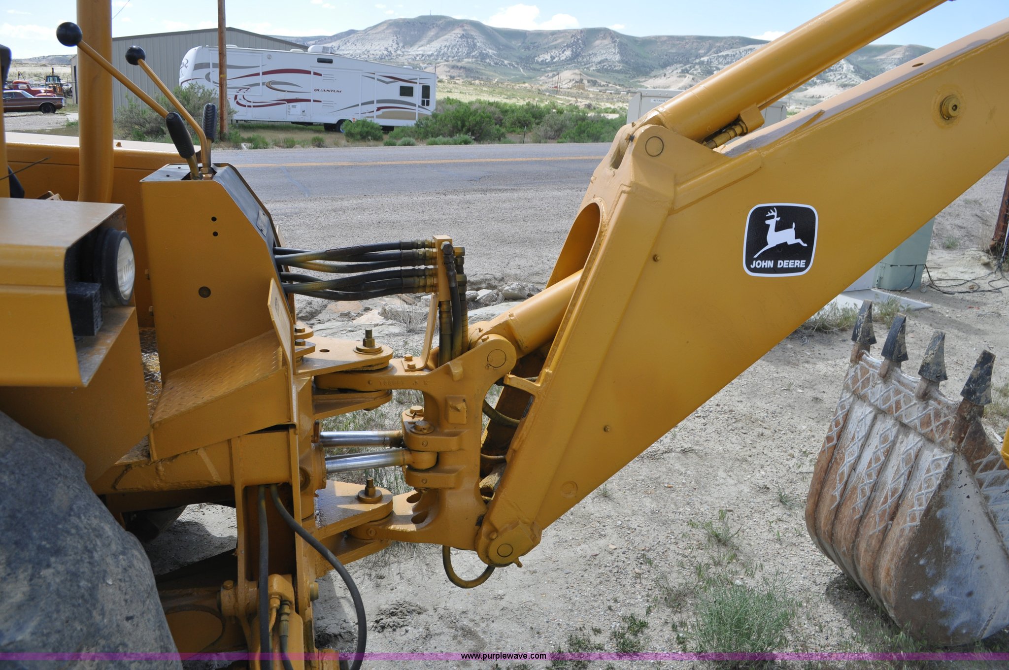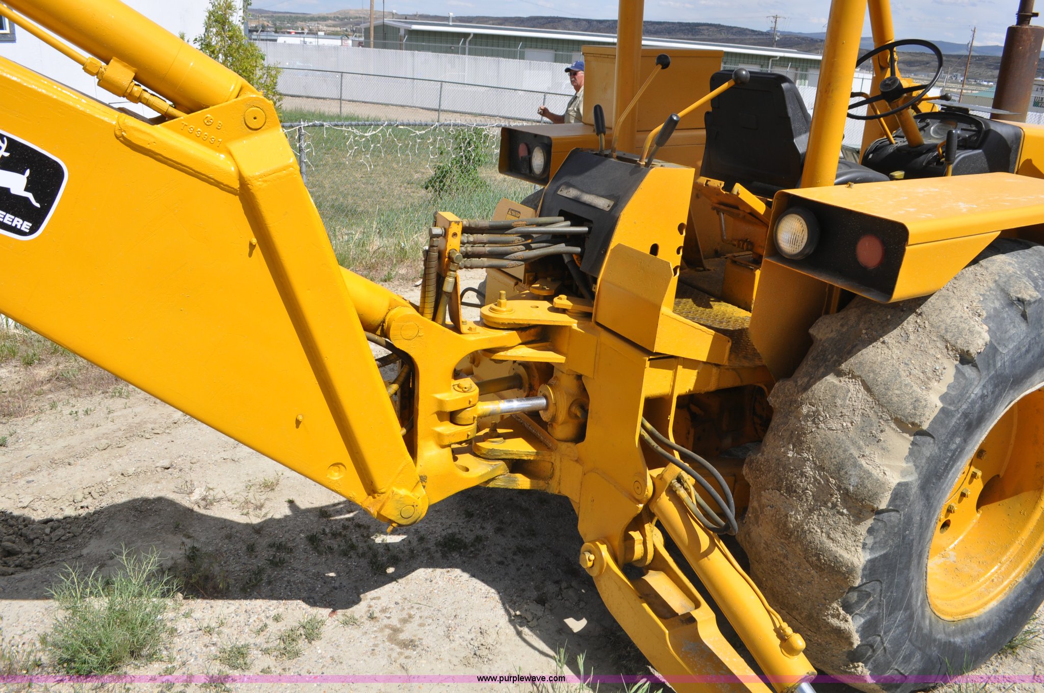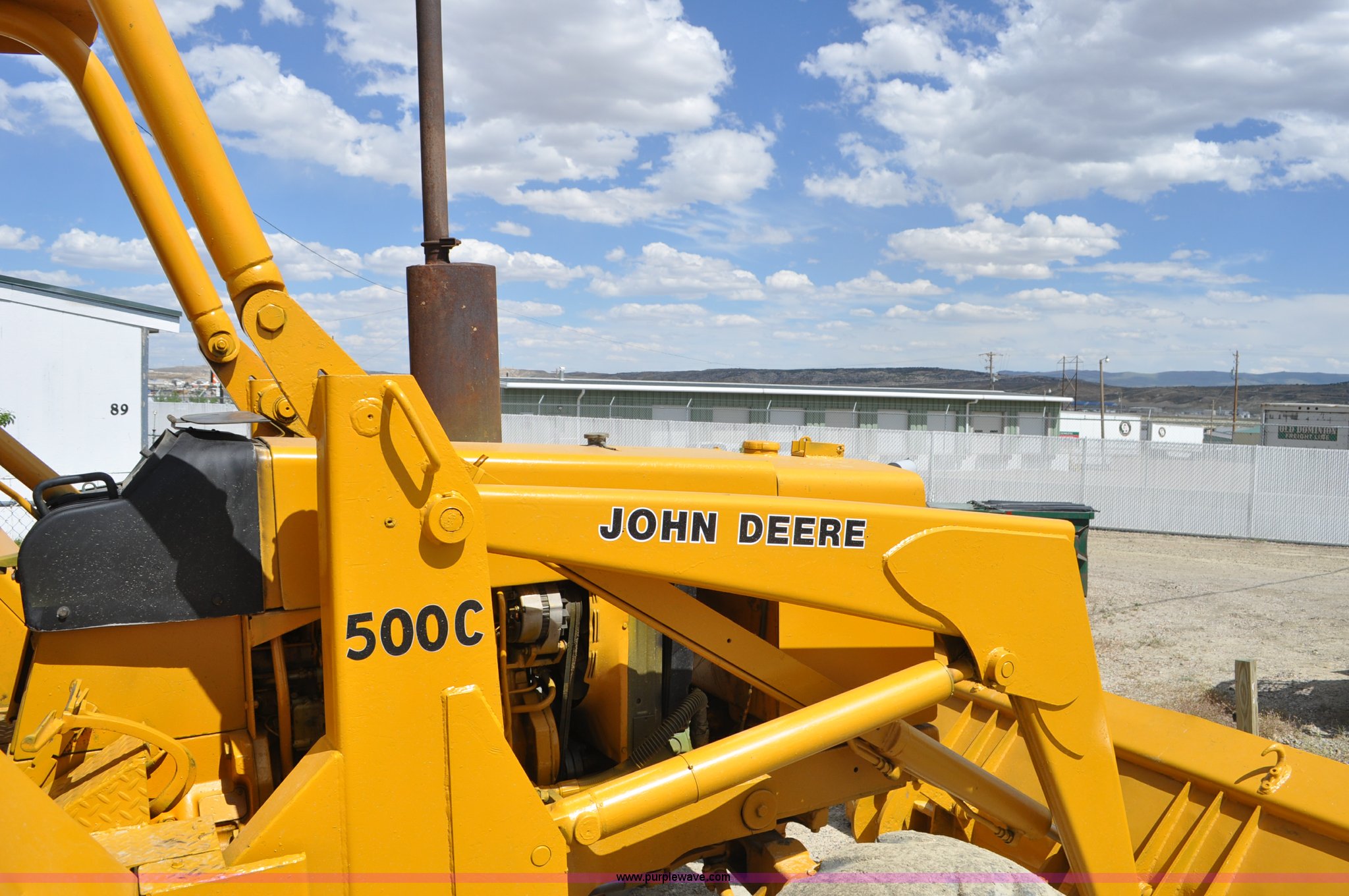 Purple Wave is selling a used Tractor Loader Backhoe in Wyoming. This item is a John Deere 500C backhoe with the following: John Deere four cylinder diesel engine, Serial 284355R, Powershift transmission, 8F-4R gears, Canopy, Spring suspension seat, Wobble stick backhoe controls, 24"W toothed backhoe bucket, 88"W loader bucket, Bolt-on cutting edge, 14-17.5 front tires, Denman 18.4-28 rear tires, Serial 154869B
