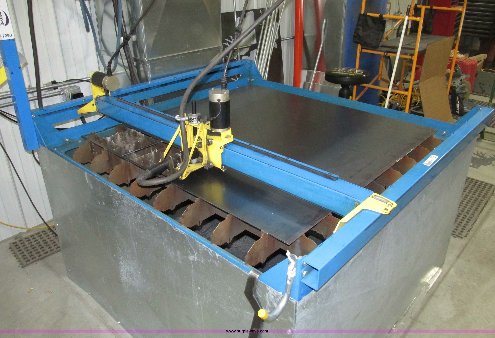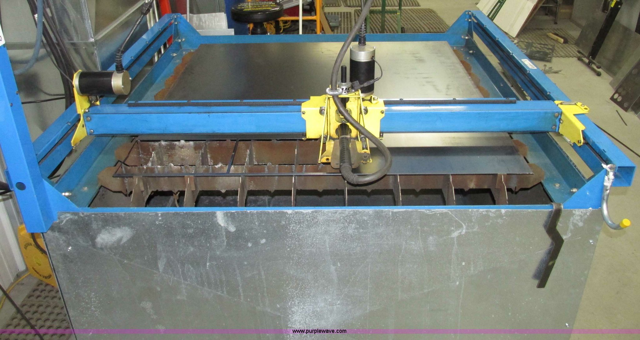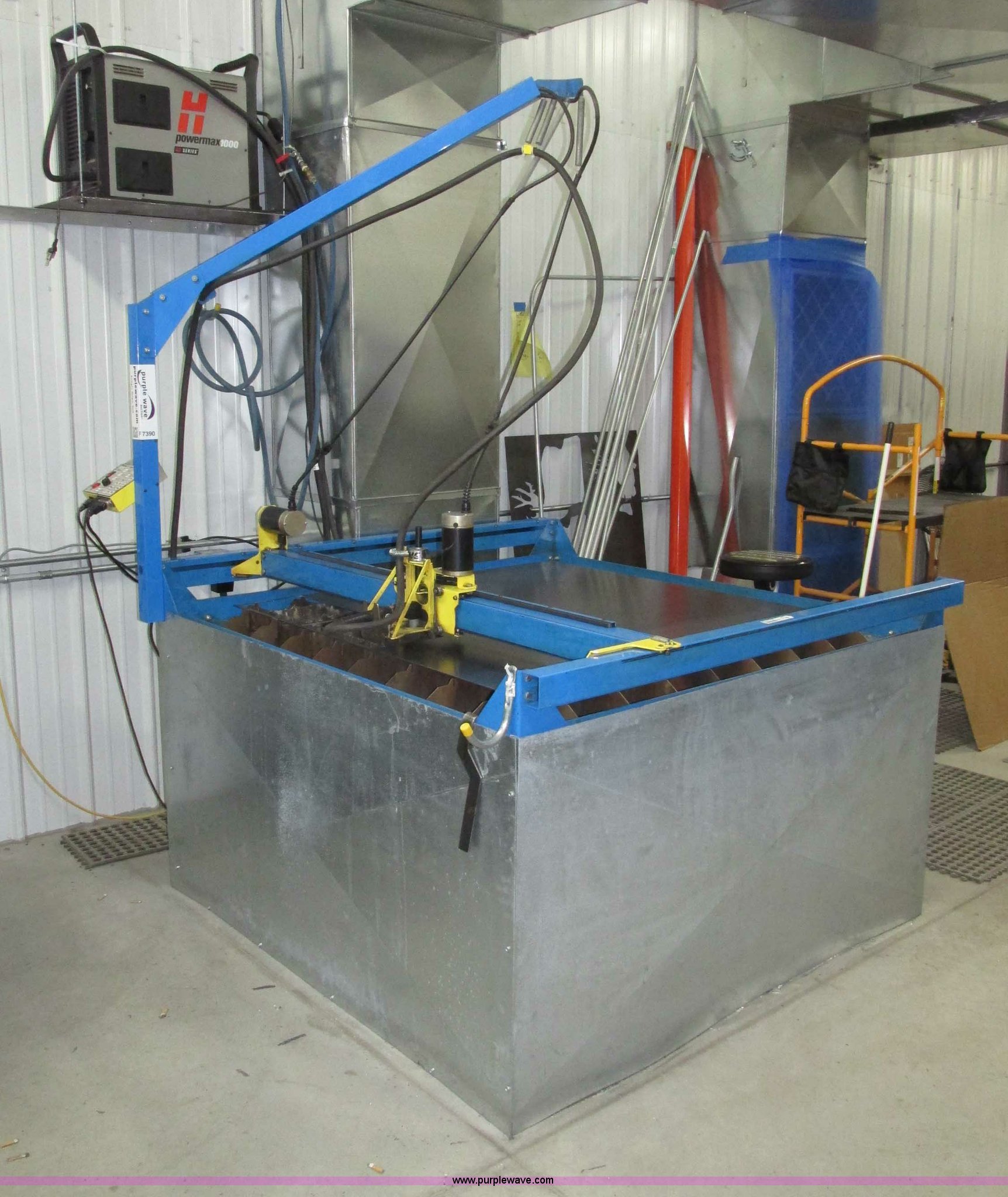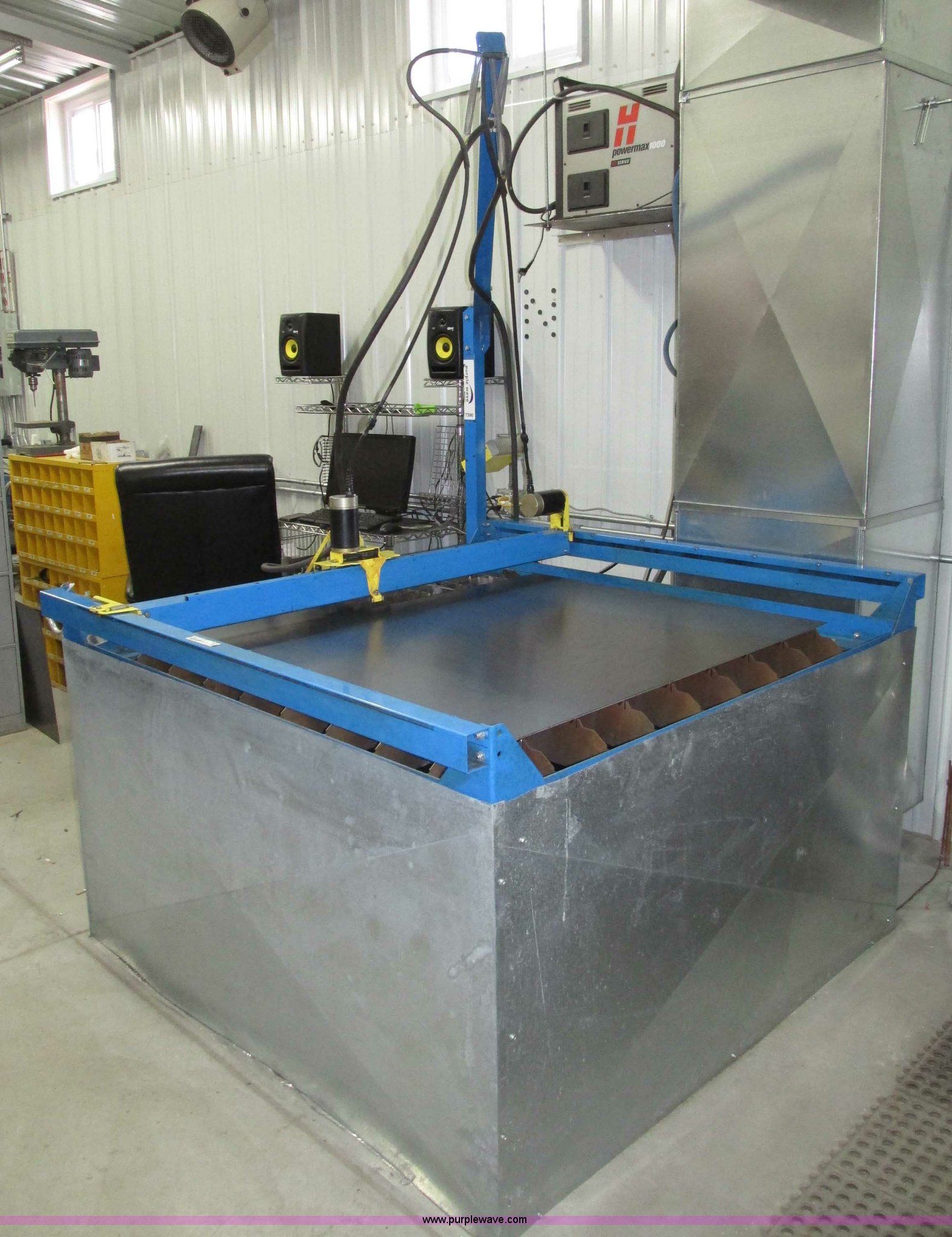 Purple Wave is selling a used Industrial Welding Machines in Nebraska. This item is a Plasma Cam Power Max 1000 plasma cutter with the following: Computerized robotic controlled cutting, Plasma Cam cutting system, 69"W x 65"D x 90"H O.D., Steel frame, 60" x 64 1/4" x 38"H base, 59 1/4" I.D. cutting area, 54 3/4" square material cutting grate, 1" maximum cutting capacity, 2,000 lbs maximum material weight capacity, 20'L x 4'W maximum size, 34"W upright with 45"L arm for cable support, Motorized horizontal sliding torch gantry, Digital height control, Adjustable speeds, Hypo Therm Power Max 1000 G3 plasma cutter, 220V, Lead and ground cables, Hypo Therm T60 torch handle, Assorted tips, Additional consumables, Currently designed for exterior ventilation, Sheet metal side panels for frame included, Vertical wall and ceiling ducting are not included, Dell CPU and keyboard, Instructional video, Hypo Therm and Plasma Cam manuals, 4 x 4 metal sheets, Aluminum 10 gauge, 3/16" cold rolled steel, (3) cold rolled steel 10 gauge, Partially used on cutting table,, Finished work designs are not included, Transferable ownership through PlasmaCam, Serial 62837