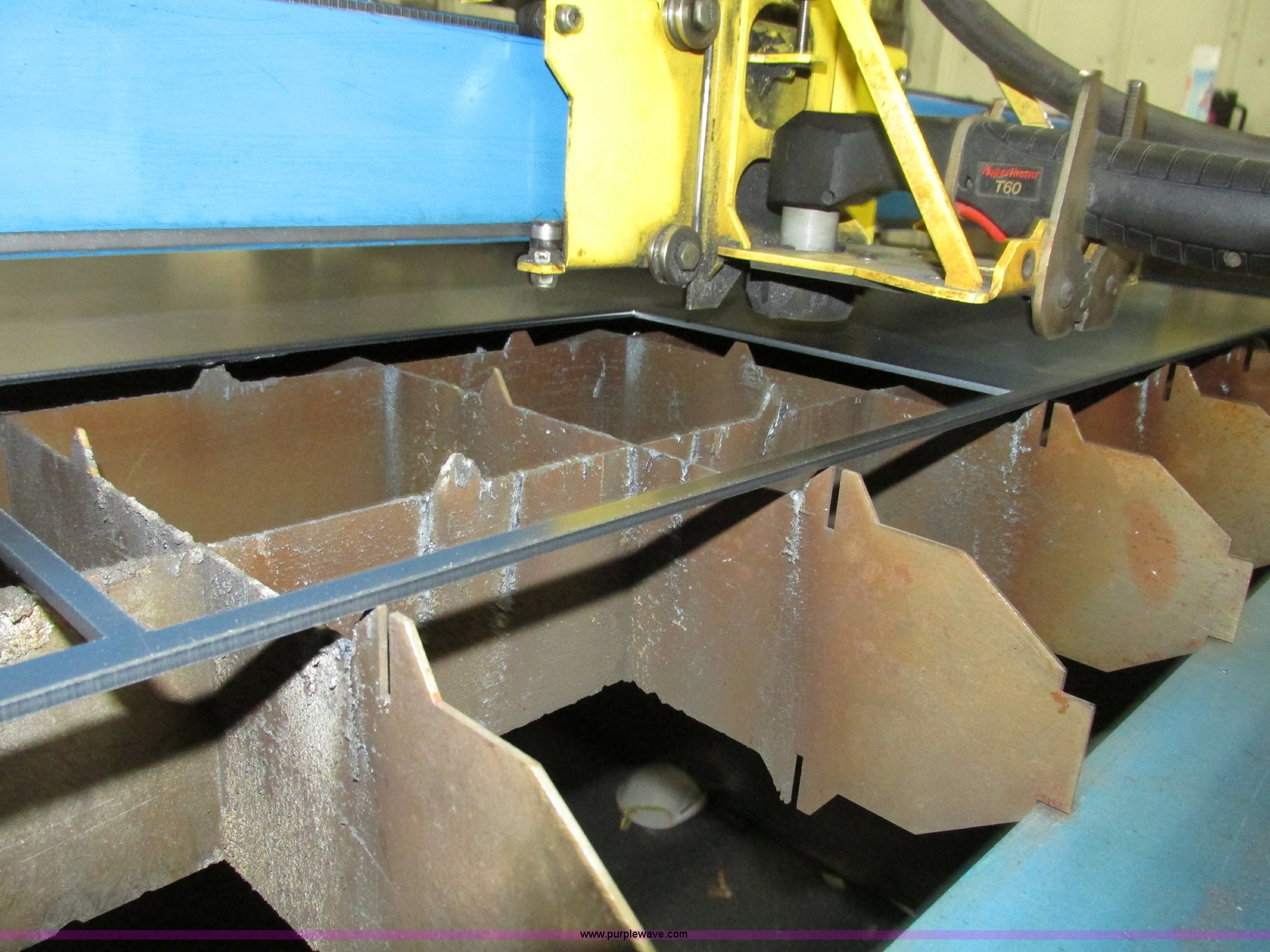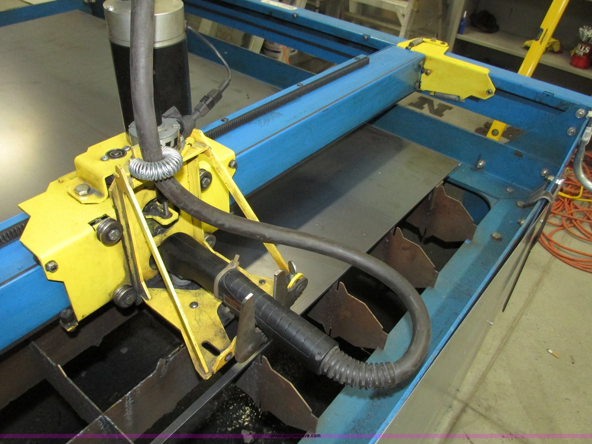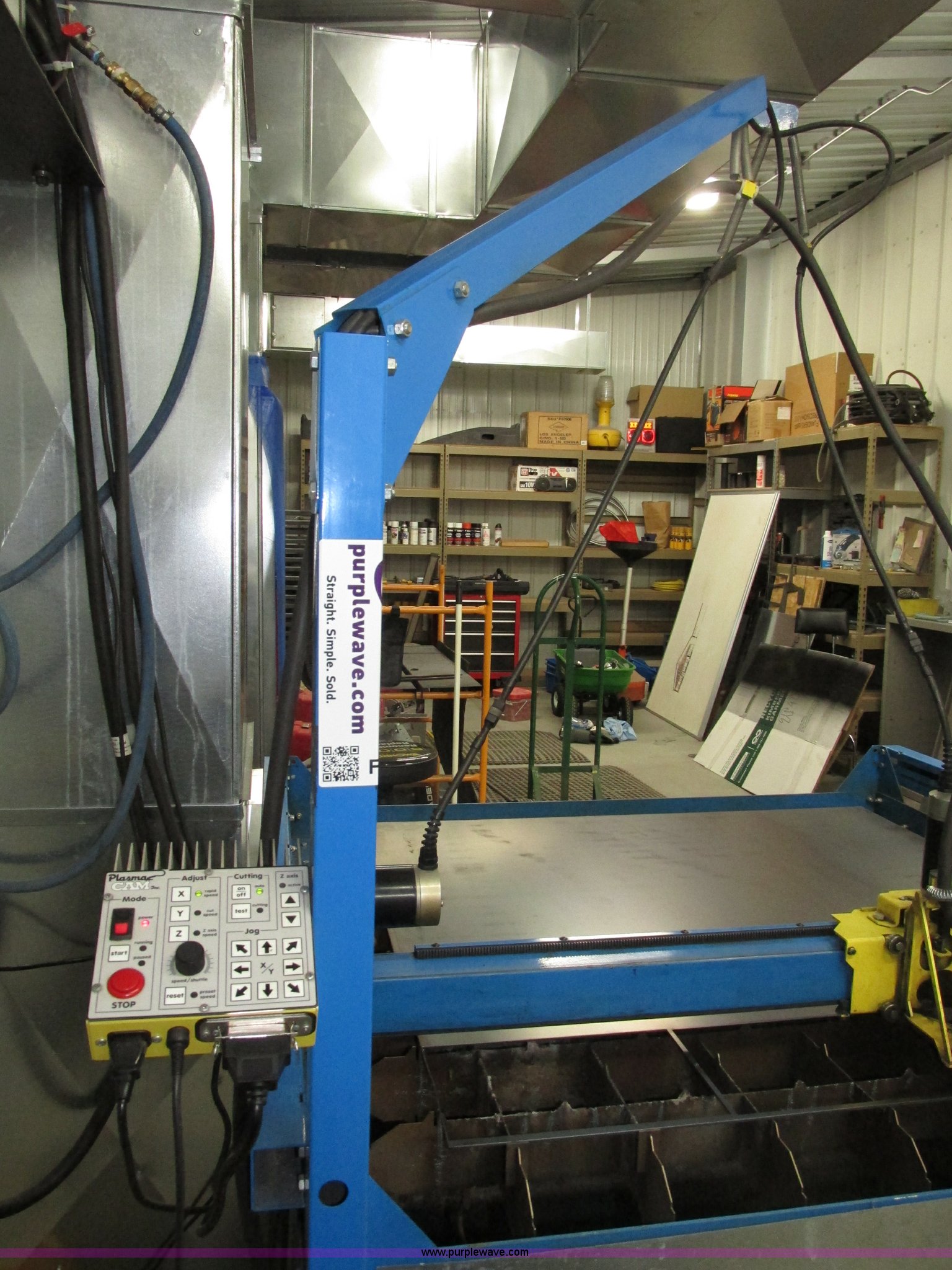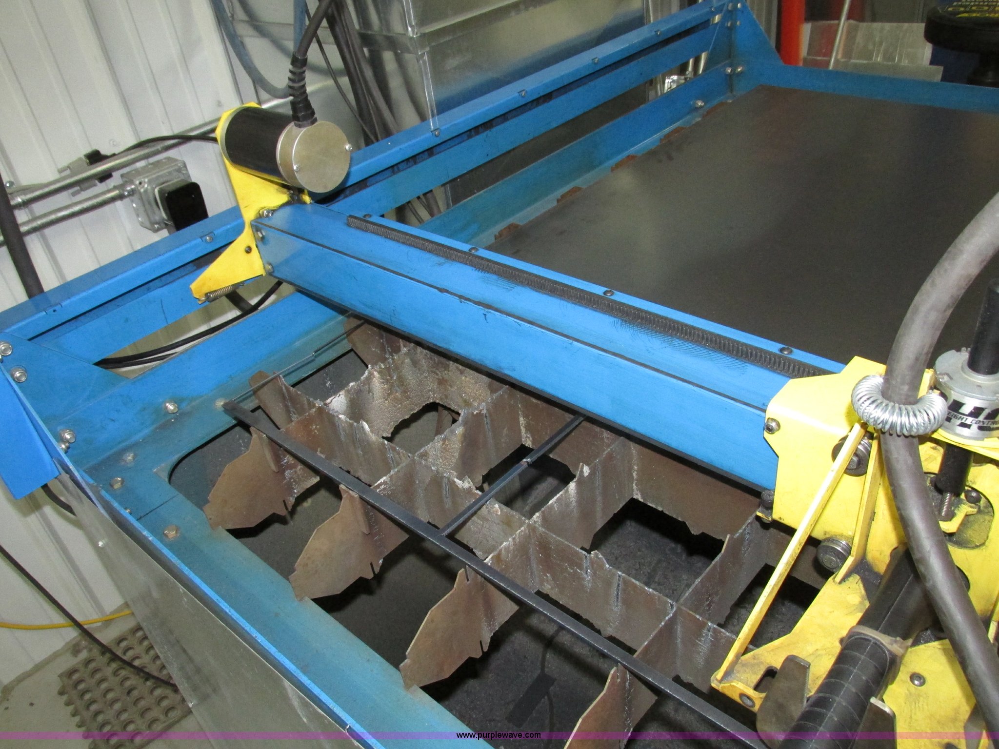 Purple Wave is selling a used Industrial Welding Machines in Nebraska. This item is a Plasma Cam Power Max 1000 plasma cutter with the following: Computerized robotic controlled cutting, Plasma Cam cutting system, 69"W x 65"D x 90"H O.D., Steel frame, 60" x 64 1/4" x 38"H base, 59 1/4" I.D. cutting area, 54 3/4" square material cutting grate, 1" maximum cutting capacity, 2,000 lbs maximum material weight capacity, 20'L x 4'W maximum size, 34"W upright with 45"L arm for cable support, Motorized horizontal sliding torch gantry, Digital height control, Adjustable speeds, Hypo Therm Power Max 1000 G3 plasma cutter, 220V, Lead and ground cables, Hypo Therm T60 torch handle, Assorted tips, Additional consumables, Currently designed for exterior ventilation, Sheet metal side panels for frame included, Vertical wall and ceiling ducting are not included, Dell CPU and keyboard, Instructional video, Hypo Therm and Plasma Cam manuals, 4 x 4 metal sheets, Aluminum 10 gauge, 3/16" cold rolled steel, (3) cold rolled steel 10 gauge, Partially used on cutting table,, Finished work designs are not included, Transferable ownership through PlasmaCam, Serial 62837