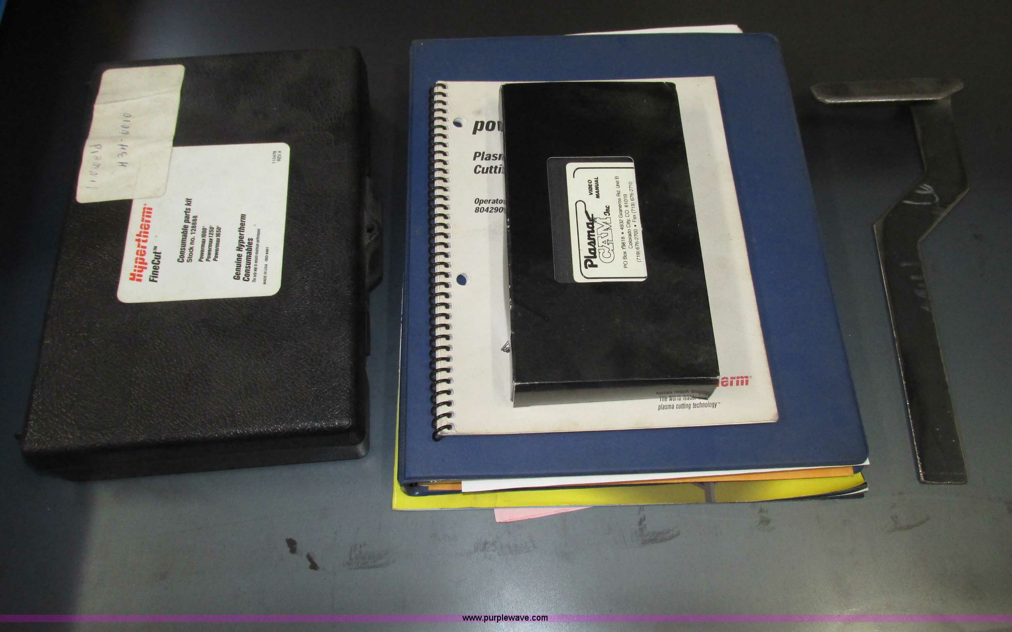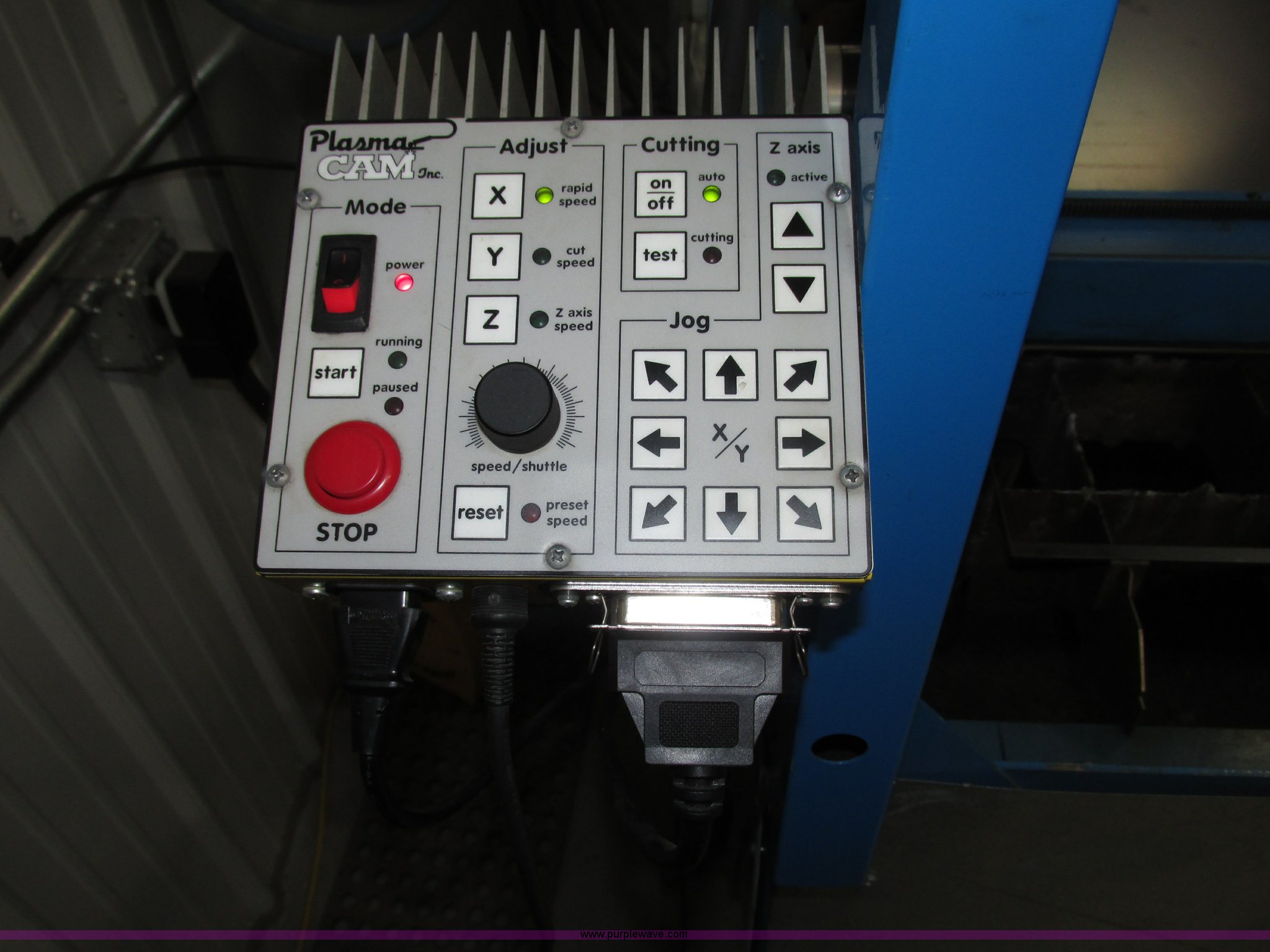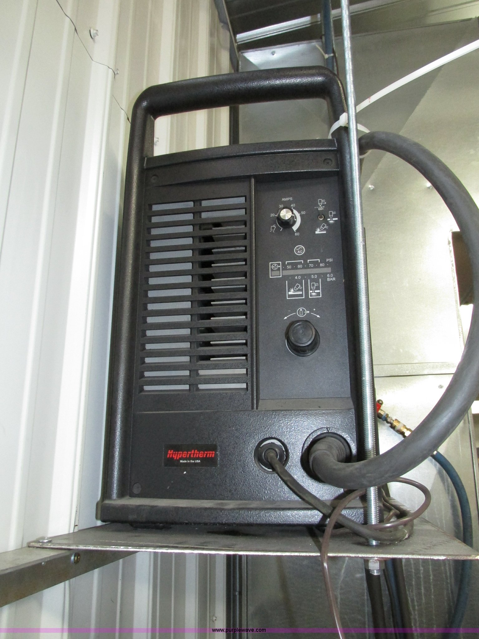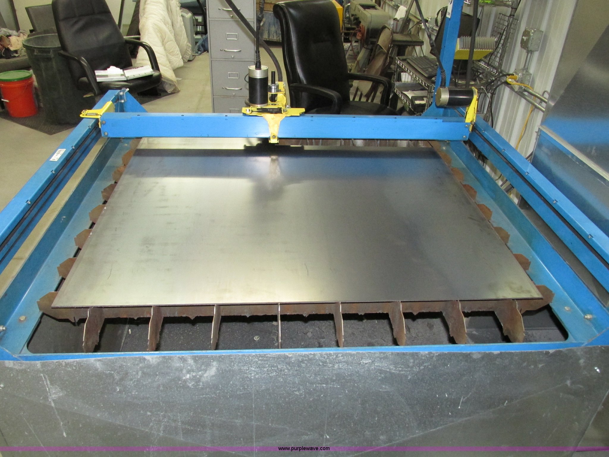 Purple Wave is selling a used Industrial Welding Machines in Nebraska. This item is a Plasma Cam Power Max 1000 plasma cutter with the following: Computerized robotic controlled cutting, Plasma Cam cutting system, 69"W x 65"D x 90"H O.D., Steel frame, 60" x 64 1/4" x 38"H base, 59 1/4" I.D. cutting area, 54 3/4" square material cutting grate, 1" maximum cutting capacity, 2,000 lbs maximum material weight capacity, 20'L x 4'W maximum size, 34"W upright with 45"L arm for cable support, Motorized horizontal sliding torch gantry, Digital height control, Adjustable speeds, Hypo Therm Power Max 1000 G3 plasma cutter, 220V, Lead and ground cables, Hypo Therm T60 torch handle, Assorted tips, Additional consumables, Currently designed for exterior ventilation, Sheet metal side panels for frame included, Vertical wall and ceiling ducting are not included, Dell CPU and keyboard, Instructional video, Hypo Therm and Plasma Cam manuals, 4 x 4 metal sheets, Aluminum 10 gauge, 3/16" cold rolled steel, (3) cold rolled steel 10 gauge, Partially used on cutting table,, Finished work designs are not included, Transferable ownership through PlasmaCam, Serial 62837