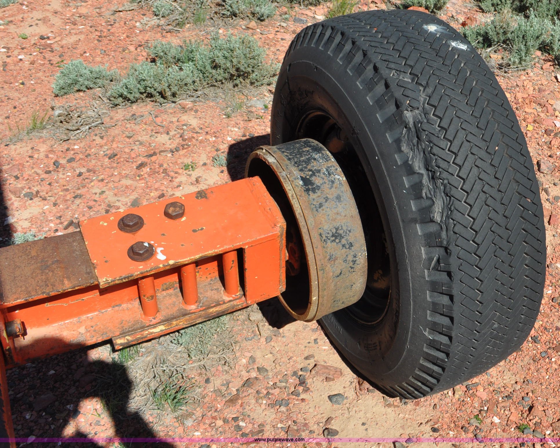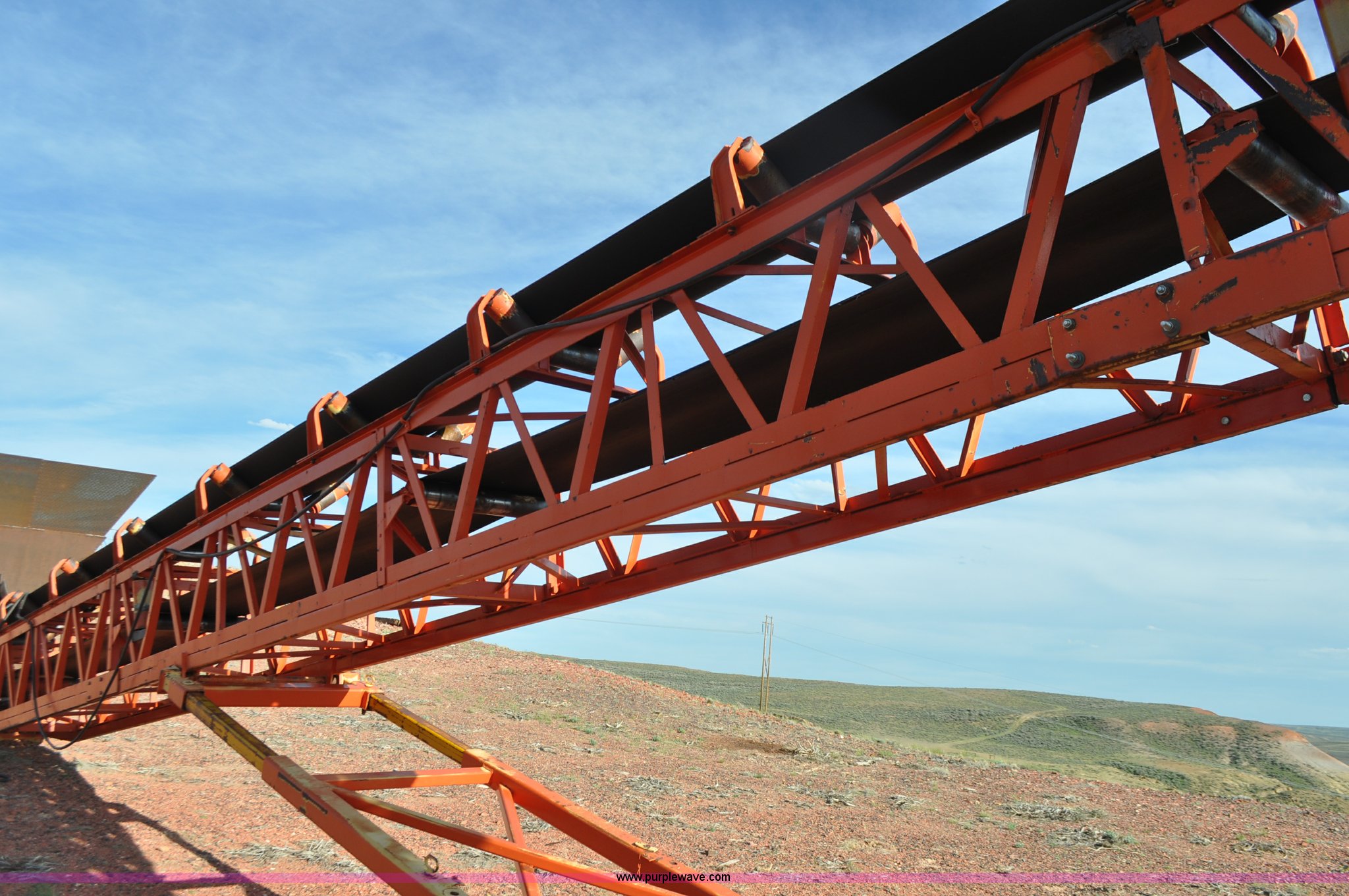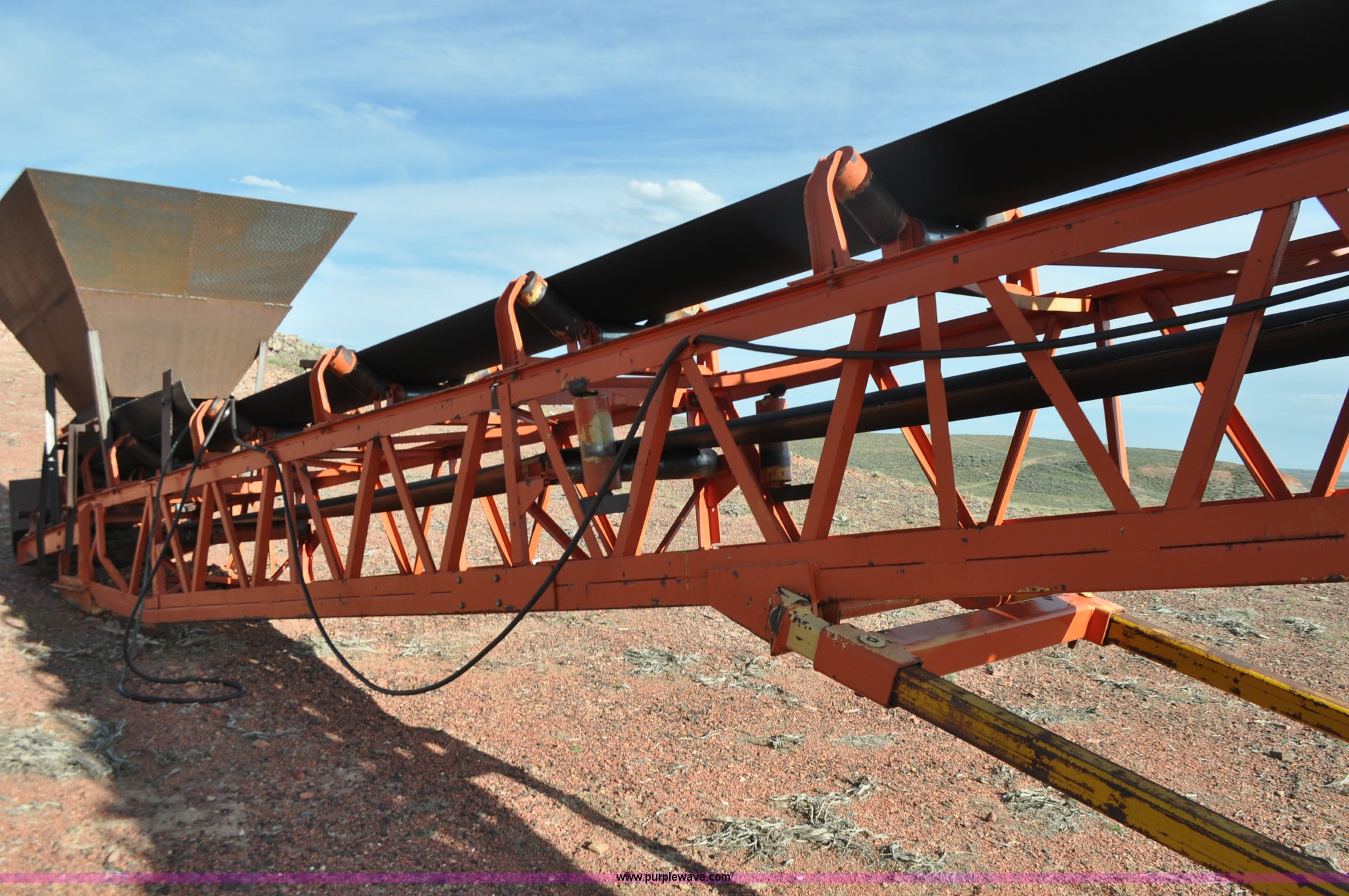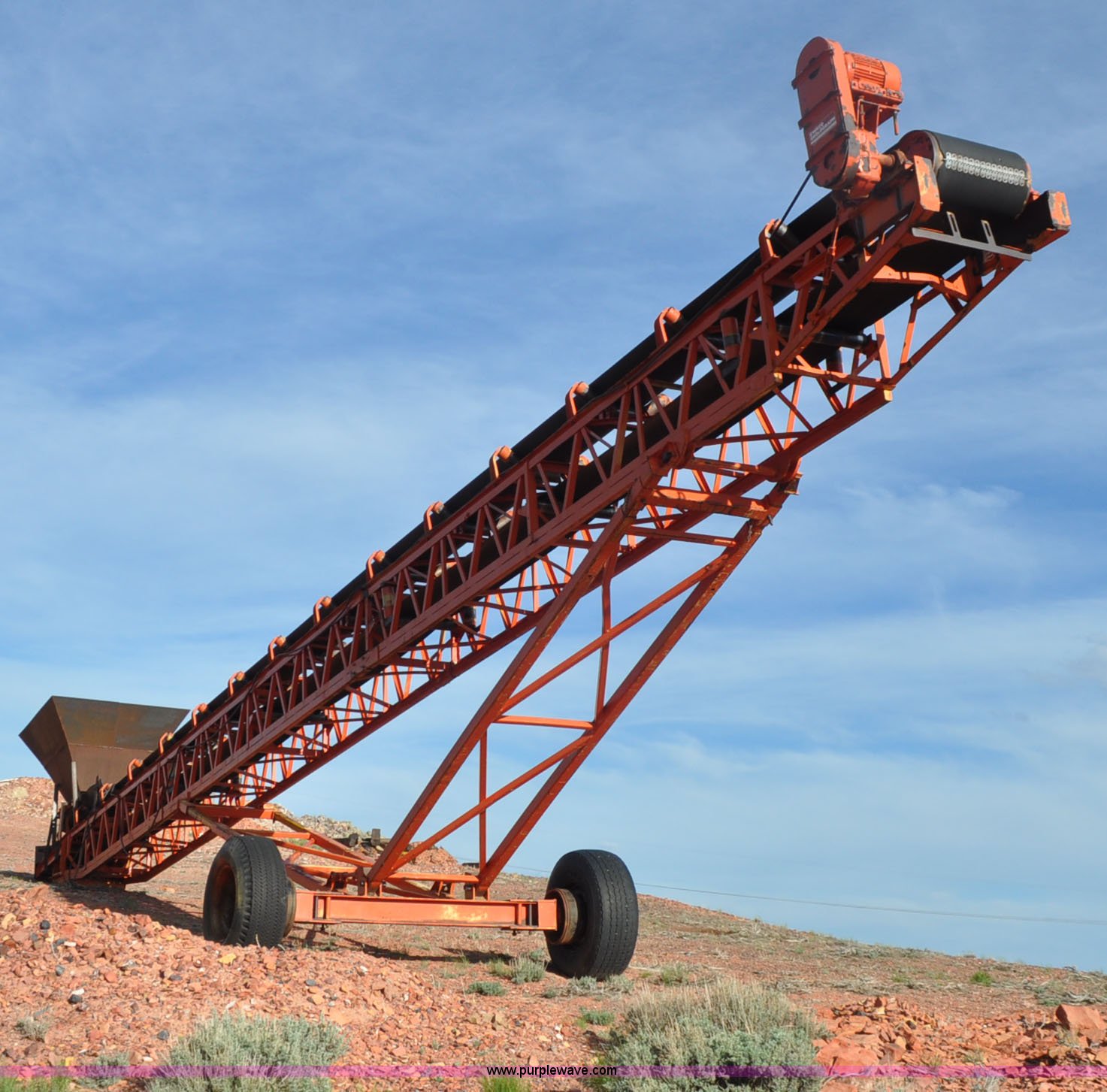 Purple Wave is selling a used Conveyor in Wyoming. This item is a Stacking conveyor with the following: 62'L, 24"W belt, Three phase electric motor, Manual lift, Fill hopper, 15-22.5 tire, 425/65R22.5 tire