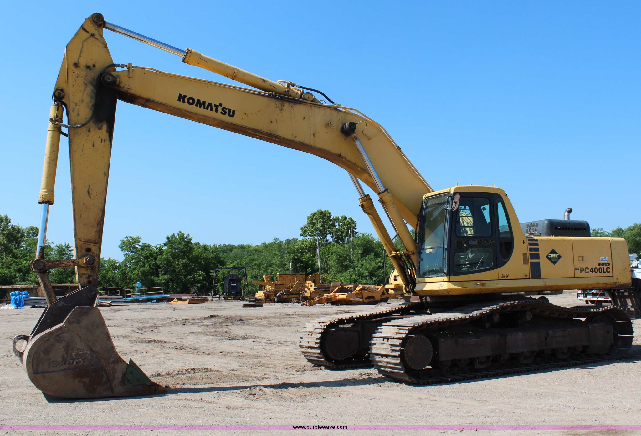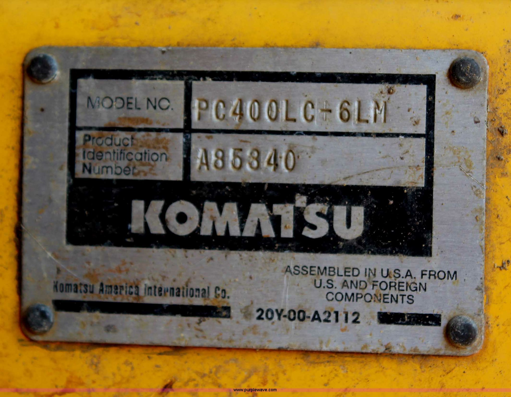 Purple Wave is selling a used Hydraulic Excavator in Kansas. This item is a 2003 Komatsu PC400LC-6LM excavator with the following: 12,979 hours on meter, Komatsu six cylinder diesel engine, 306 HP, Enclosed cab, AC and heat, AM/FM, 11'1" stick length, Esco 60"W bucket, 35.5" triple grouser track pads, 95,147 lbs. base operating weight, Remanufactured engine installed at approx. 10,000 hours, Serial A85340