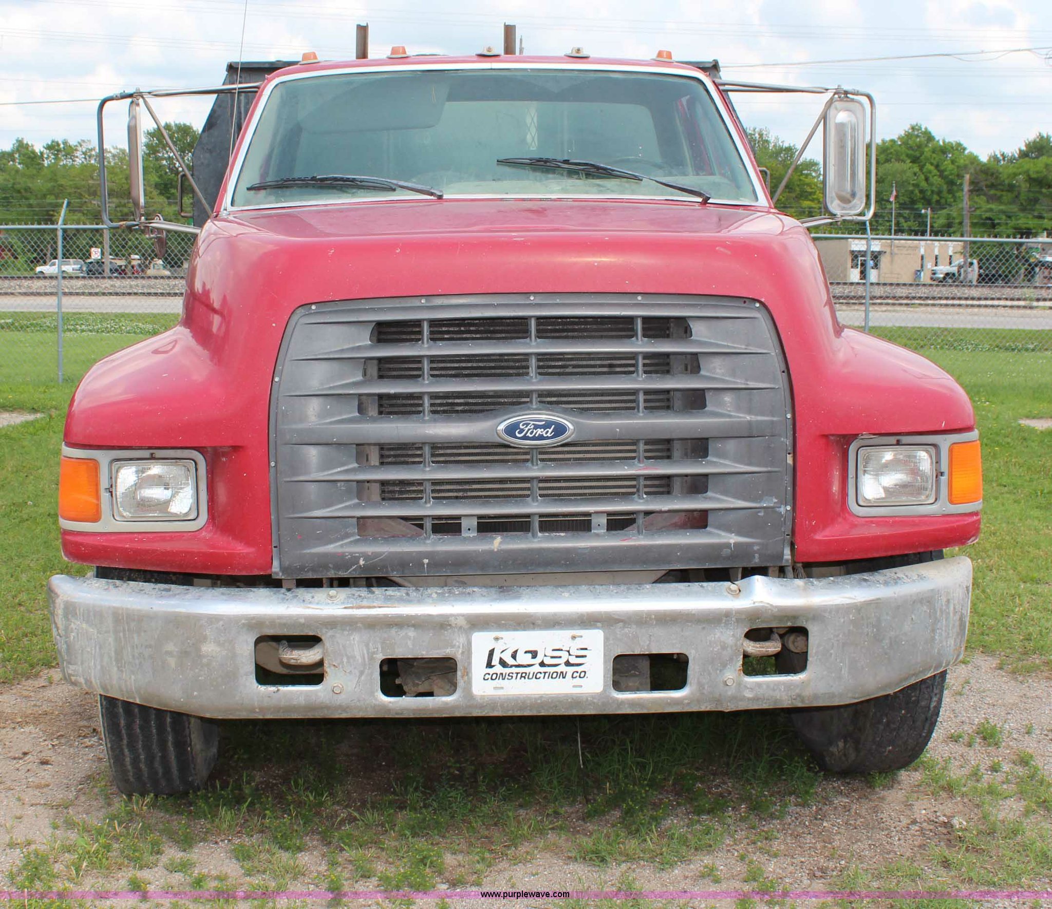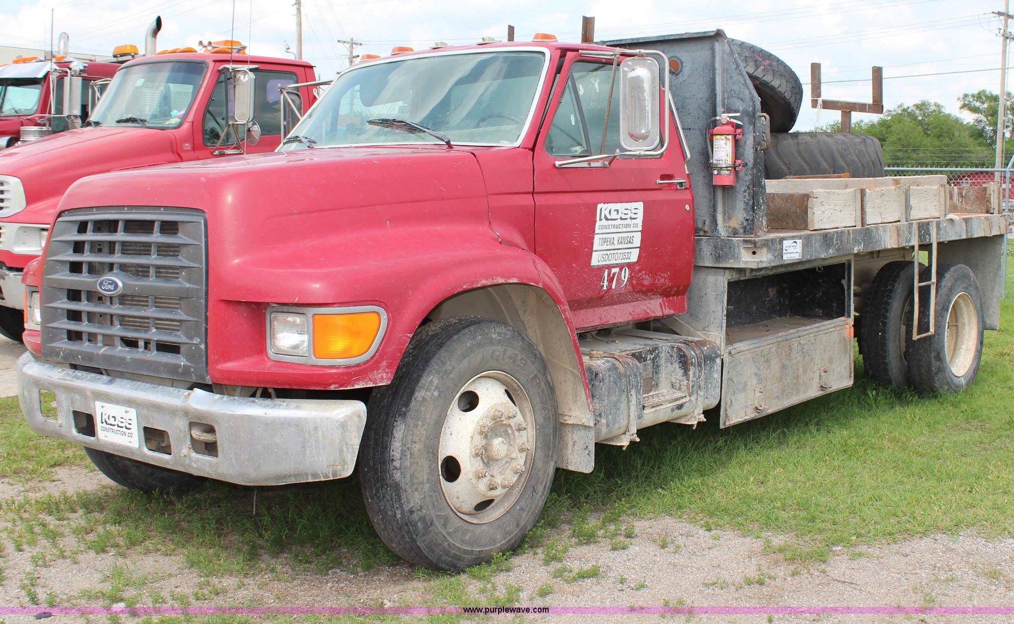 Purple Wave is selling a used Flat Bed Truck in Kansas. This item is a 1998 Ford F800 flatbed truck with the following: 97,392 miles on odometer, Cummins 5.9L L6 diesel engine, 190 HP, Automatic transmission, Dual 50 gallon fuel tanks, 12.5'L flatbed, 10R22.5 tires, Seat torn, Driver's door handle broken, Interior/exterior cosmetic damage, Tires on bed are not included, Unit# 479