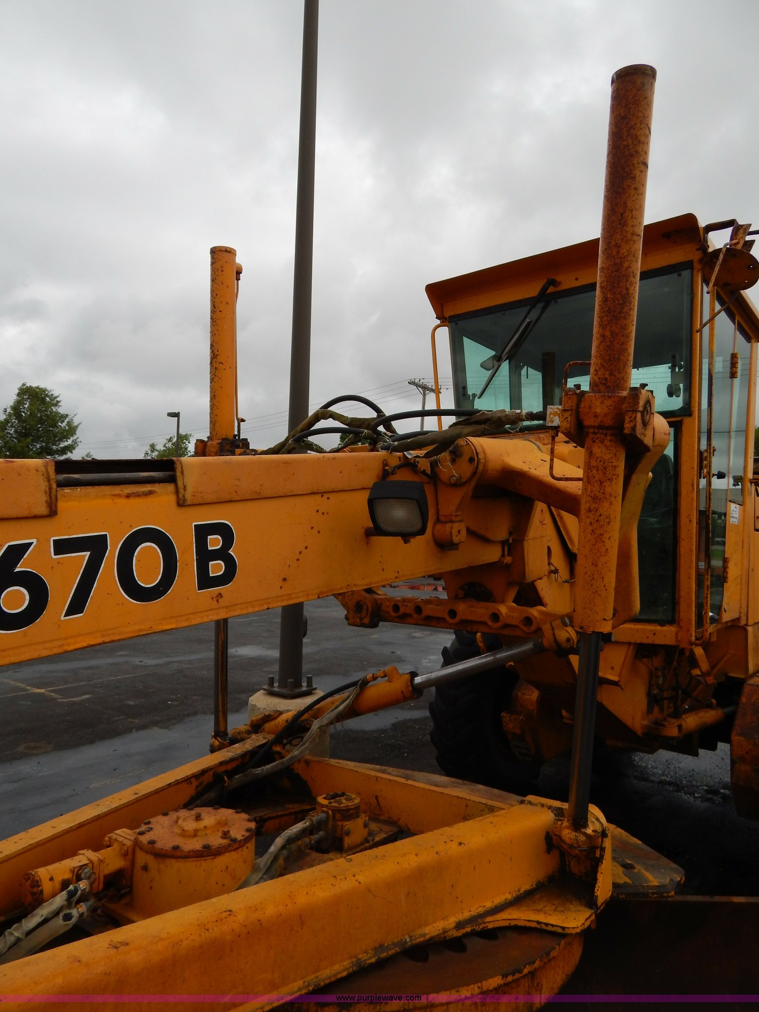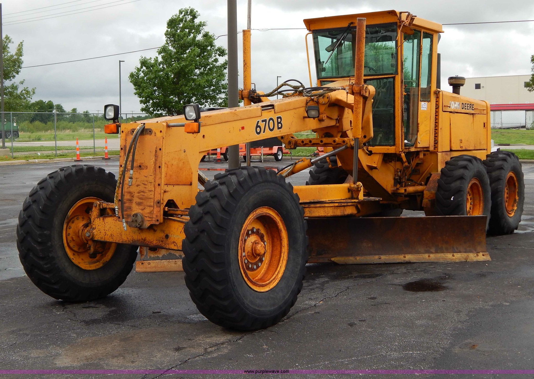 Purple Wave is selling a used Motor Grader in Missouri. This item is a 1989 John Deere 670B motor grader with the following: John Deere six cylinder diesel engine, Powershift transmission, 8F-4R gears, Enclosed cab, Heat, Spring suspension seat, Front and rear work lights, Front auxiliary hydraulics, Road lights, brake lights, and blinkers, 14' moldboard, Tip control, Side shift, Right side blade extension, Articulated frame, 14-24 tires, 29,030 lbs. base operating weight, Lower left hand front glass cracked, Engine oil leaks, Hydraulic oil leaks, Cutting edge needs replaced, Water pump needs replaced, Belt not installed, Parking brake inoperable, Center pins loose, Serial DW670BX521357, MoDOT ID G7336