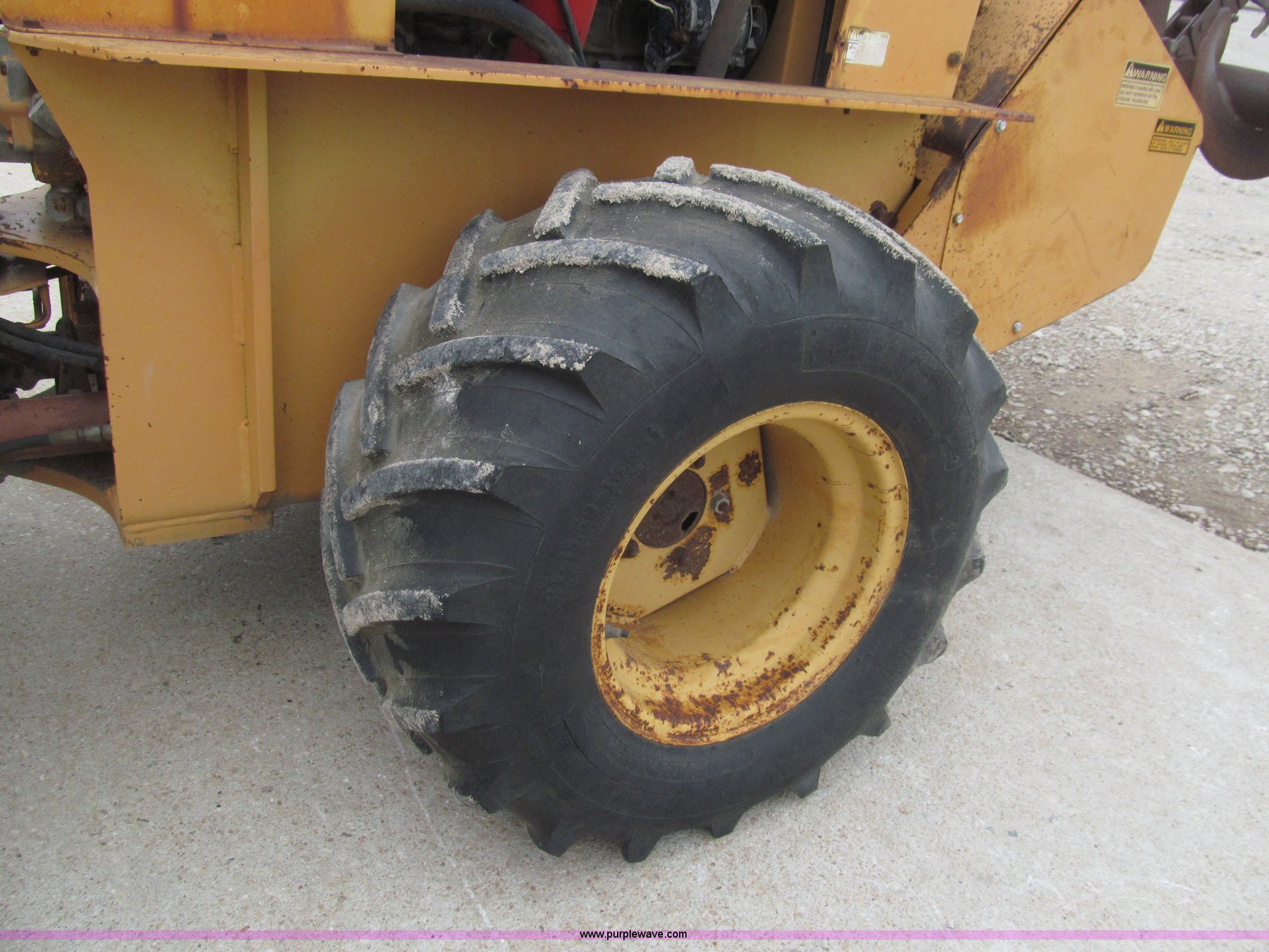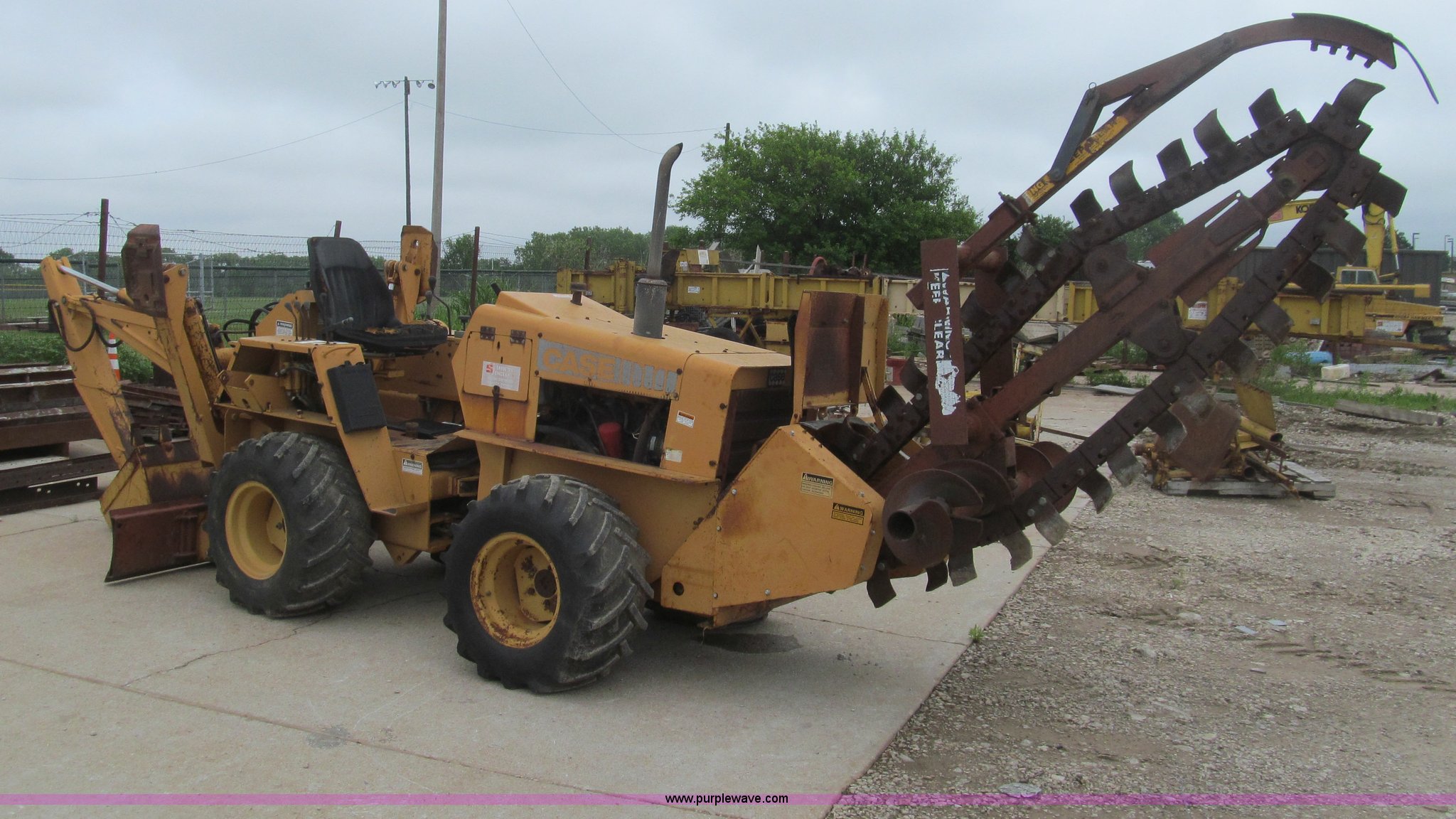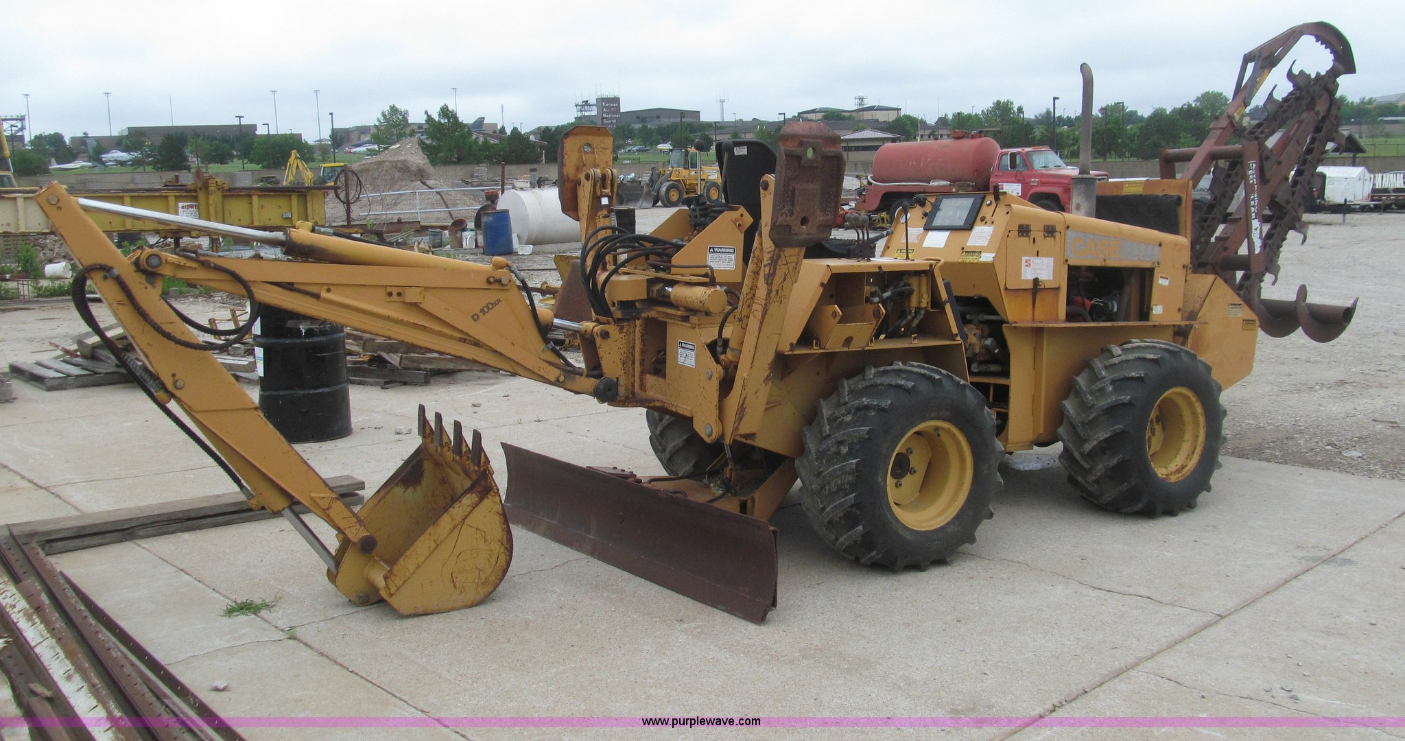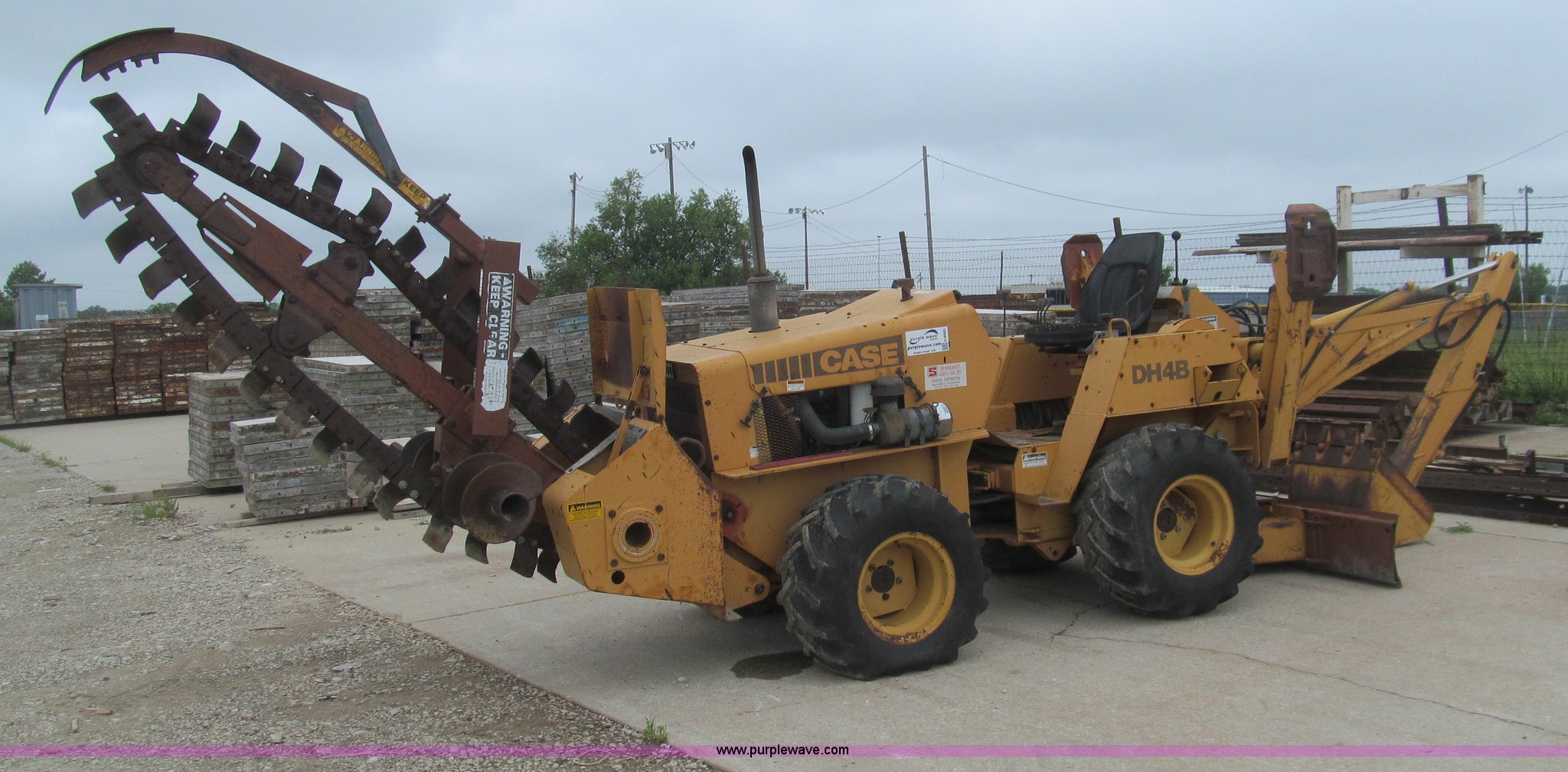 Purple Wave is selling a used Trencher or Rock Saw in Kansas. This item is a 1990 Case DH4B trencher with the following: 3,091 hours on meter, Four cylinder diesel engine, 47 HP, Hydrostatic transmission, D100XR backhoe, 6' maximum digging depth, 23"W bucket, 6'W back fill blade, Six way tilt, Outriggers, 72" trencher boom, Model H439001, Chain gearbox issue, 31-15.50-15 tires, 6,257 lbs. base operating weight, Input shaft on planetary gear box needs replaced on trencher and drive motor shaft on trencher, Serial JAF0049218