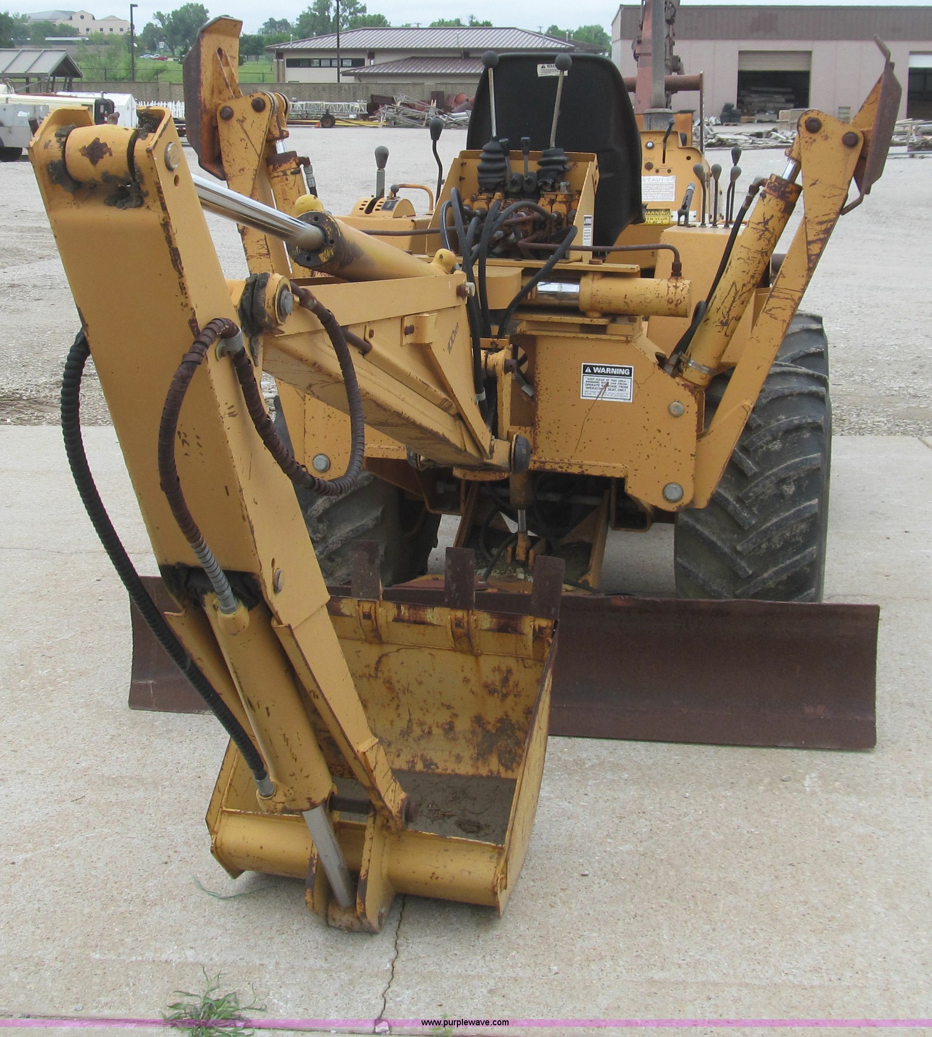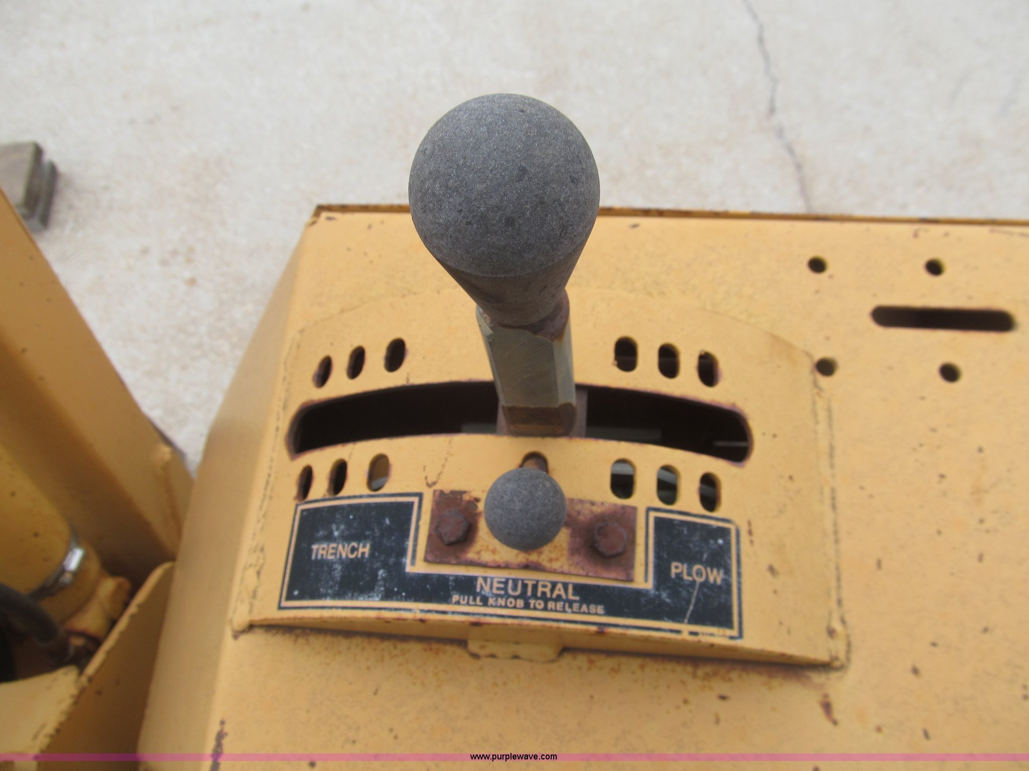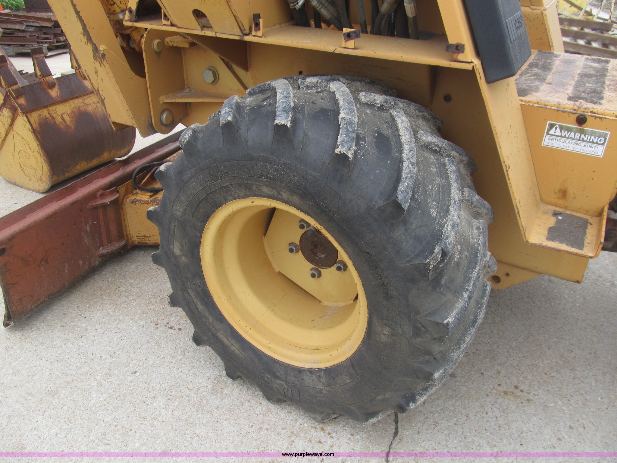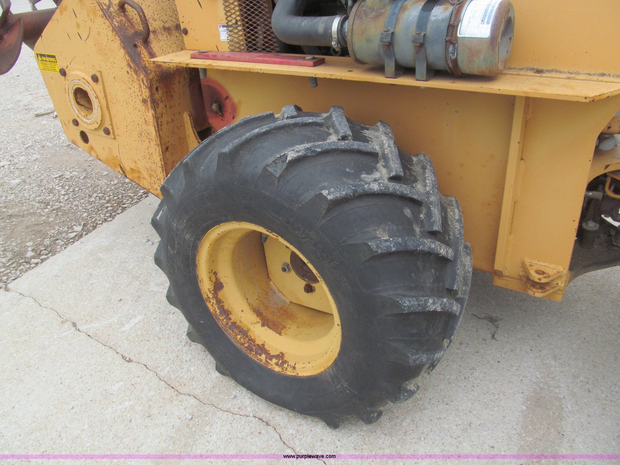 Purple Wave is selling a used Trencher or Rock Saw in Kansas. This item is a 1990 Case DH4B trencher with the following: 3,091 hours on meter, Four cylinder diesel engine, 47 HP, Hydrostatic transmission, D100XR backhoe, 6' maximum digging depth, 23"W bucket, 6'W back fill blade, Six way tilt, Outriggers, 72" trencher boom, Model H439001, Chain gearbox issue, 31-15.50-15 tires, 6,257 lbs. base operating weight, Input shaft on planetary gear box needs replaced on trencher and drive motor shaft on trencher, Serial JAF0049218