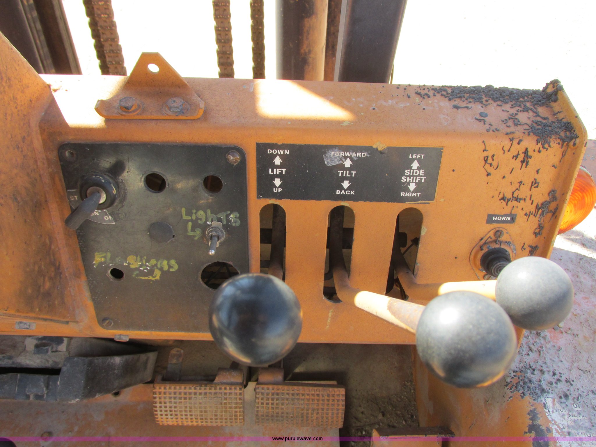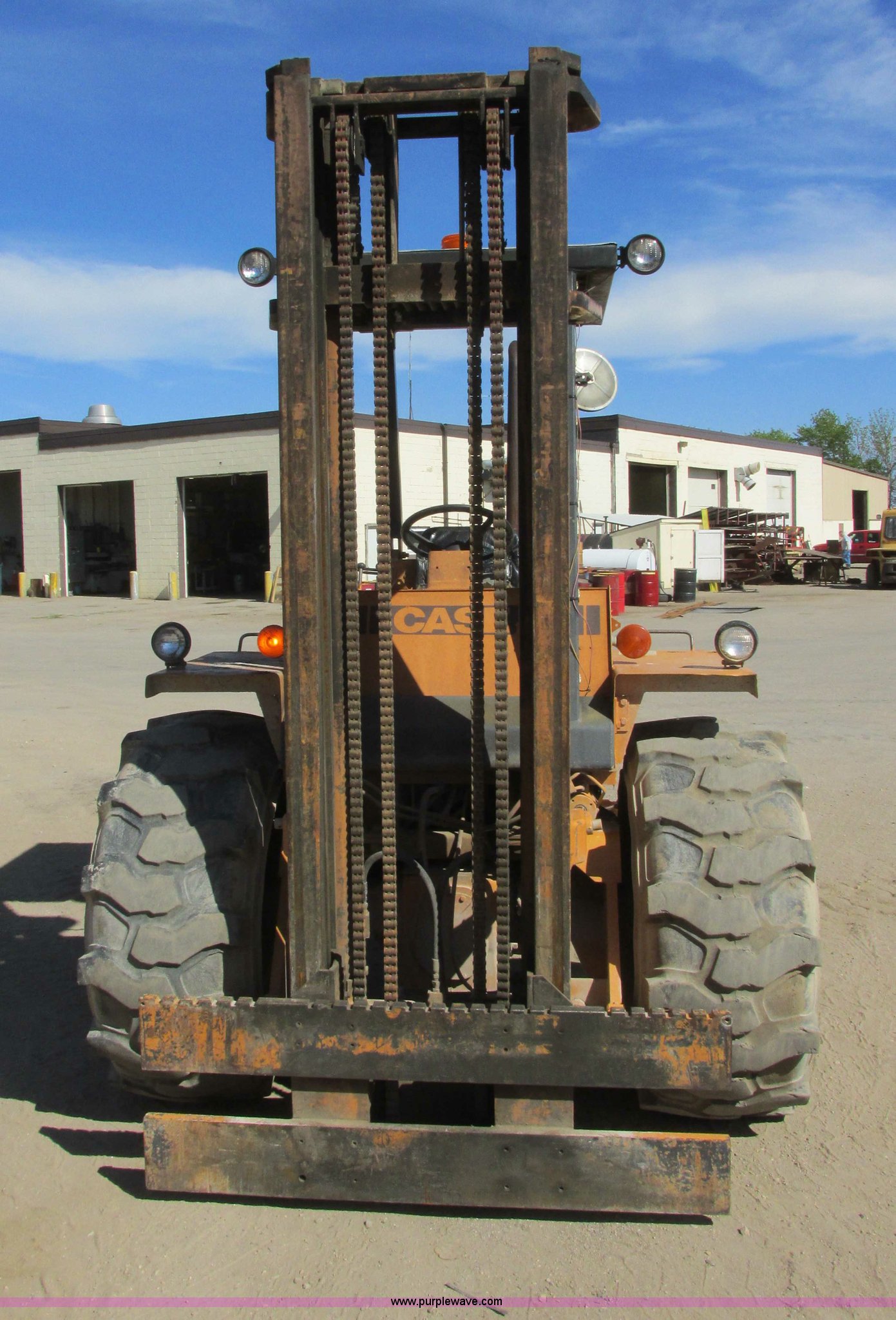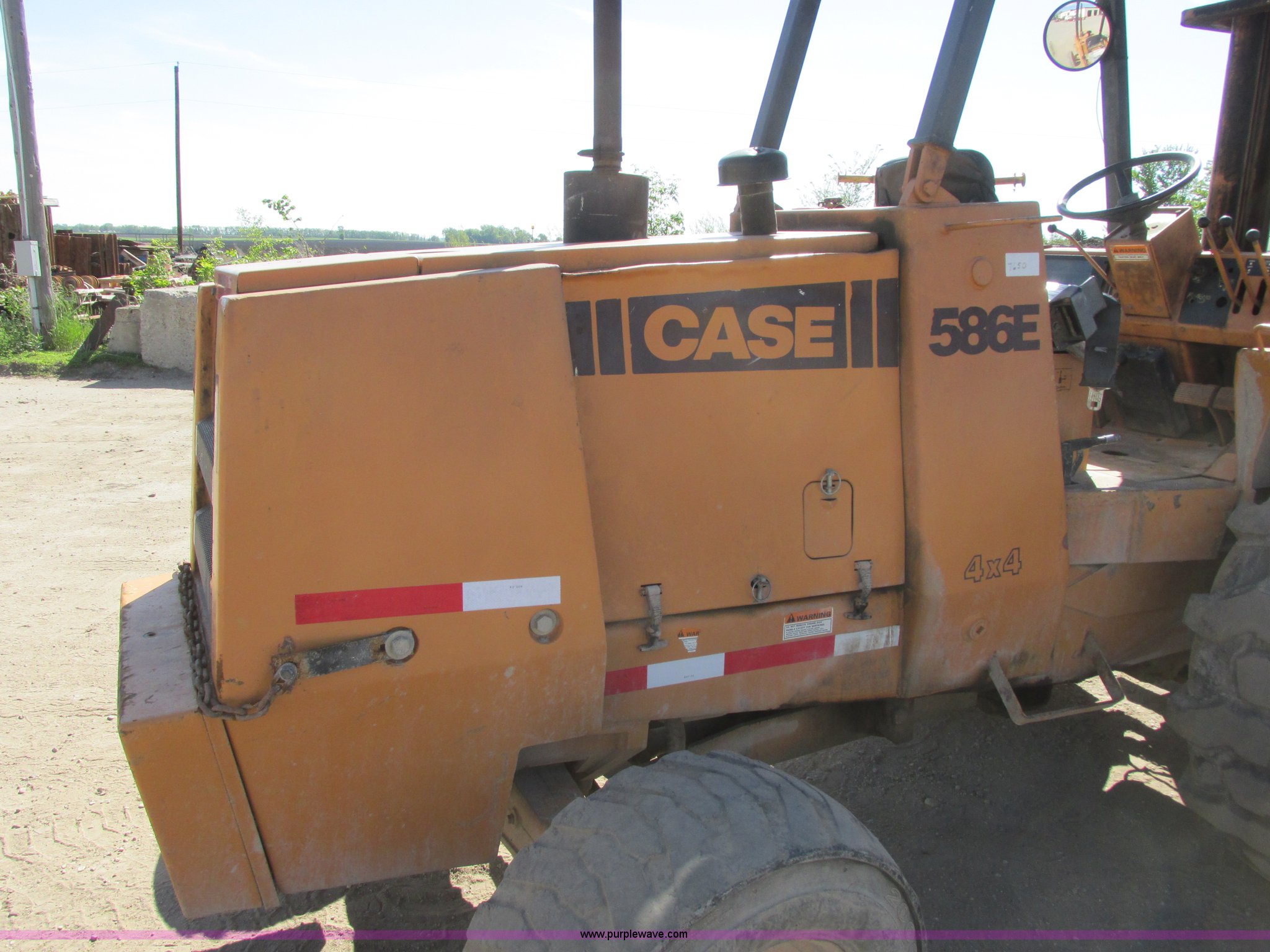 Purple Wave is selling a used Strt. Mast Rough Terr. Forklift in Minnesota. This item is a 1996 Case 586E rough terrain forklift with the following: 7,593 hours on meter, Case 4-390 four cylinder diesel engine, Serial 45373741, Direct-drive transmission, 4F-4R gears, Four wheel drive, Differential lock, ROPS, Serial JJG0131771, Front work lights, Strobe light, Three stage mast, Side shift, Tilt, 21.5' max height, 48"L forks, 60" max fork width, 6,000 lbs lift capacity, 19.5L-24 front tires, 12-16.5 NHS rear tires, 14,000 lbs. base operating weight, Cosmetic damage, Surface rust, Seat damage, Serial JJG0250647