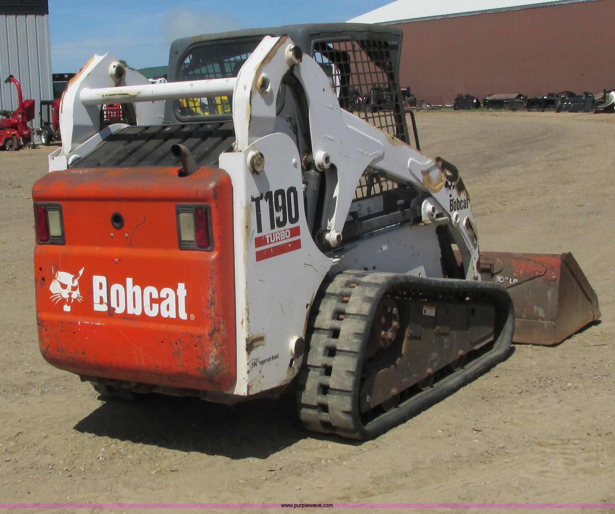 Purple Wave is selling a used Tracked Skid Steer Loader in Wisconsin. This item is a 2005 Bobcat T190 track skid steer with the following: 2,832 hours on meter, Kubota V2403 four cylinder turbo diesel engine, 56 HP, Hydrostatic transmission, Back glass, Spring suspension seat, Backup alarm, Hand and foot controls, Auxiliary hydraulics, Glow plugs, Block heater, 80"W bucket, Bolt-on cutting edge, Three rollers, 13"W tracks, 1,800 lbs rated operating capacity, 5,145 lbs tipping load, 7 mph maximum travel speed, 26.8 gallon fuel tank, 7,078 lbs. base operating weight, Serial 527716600