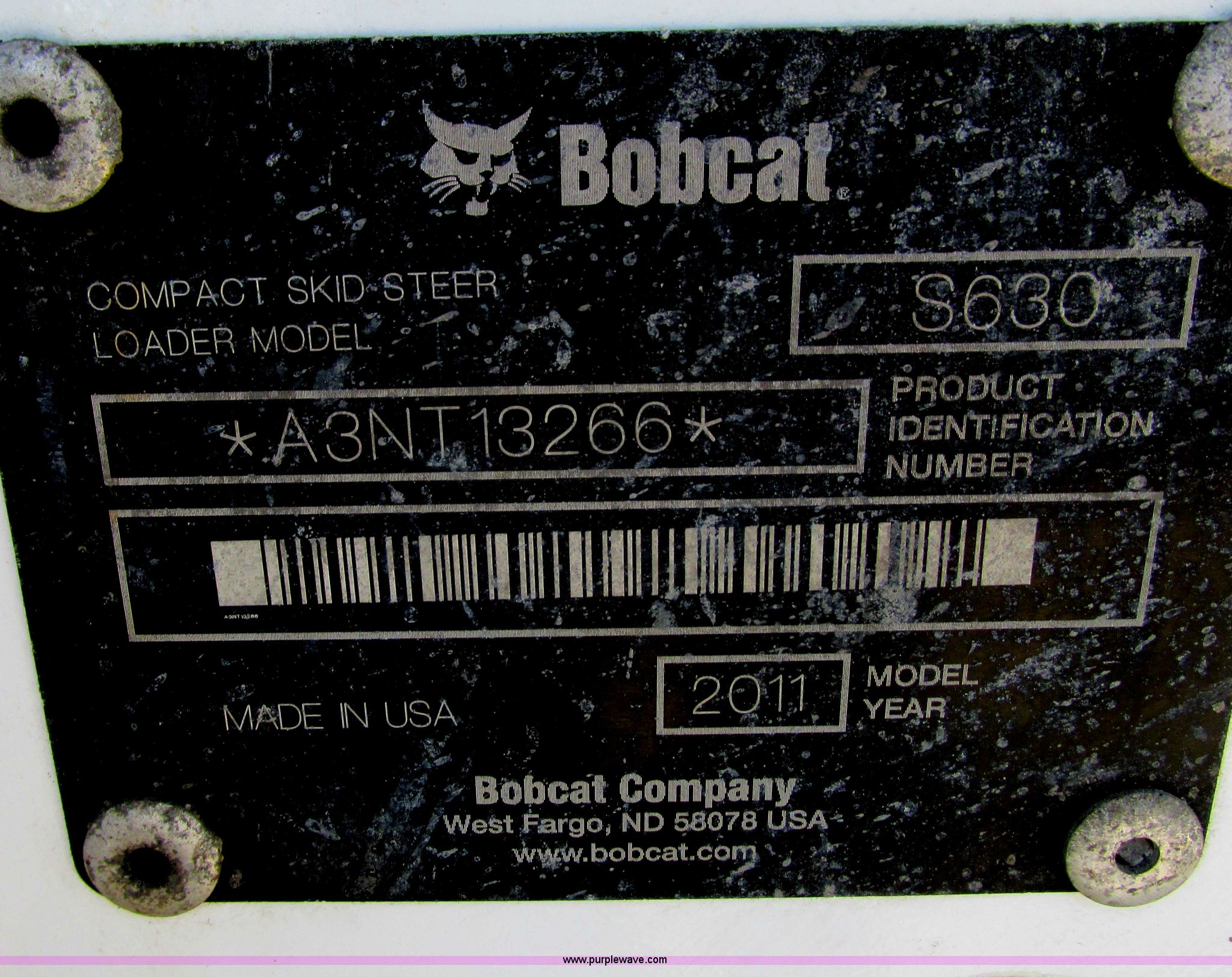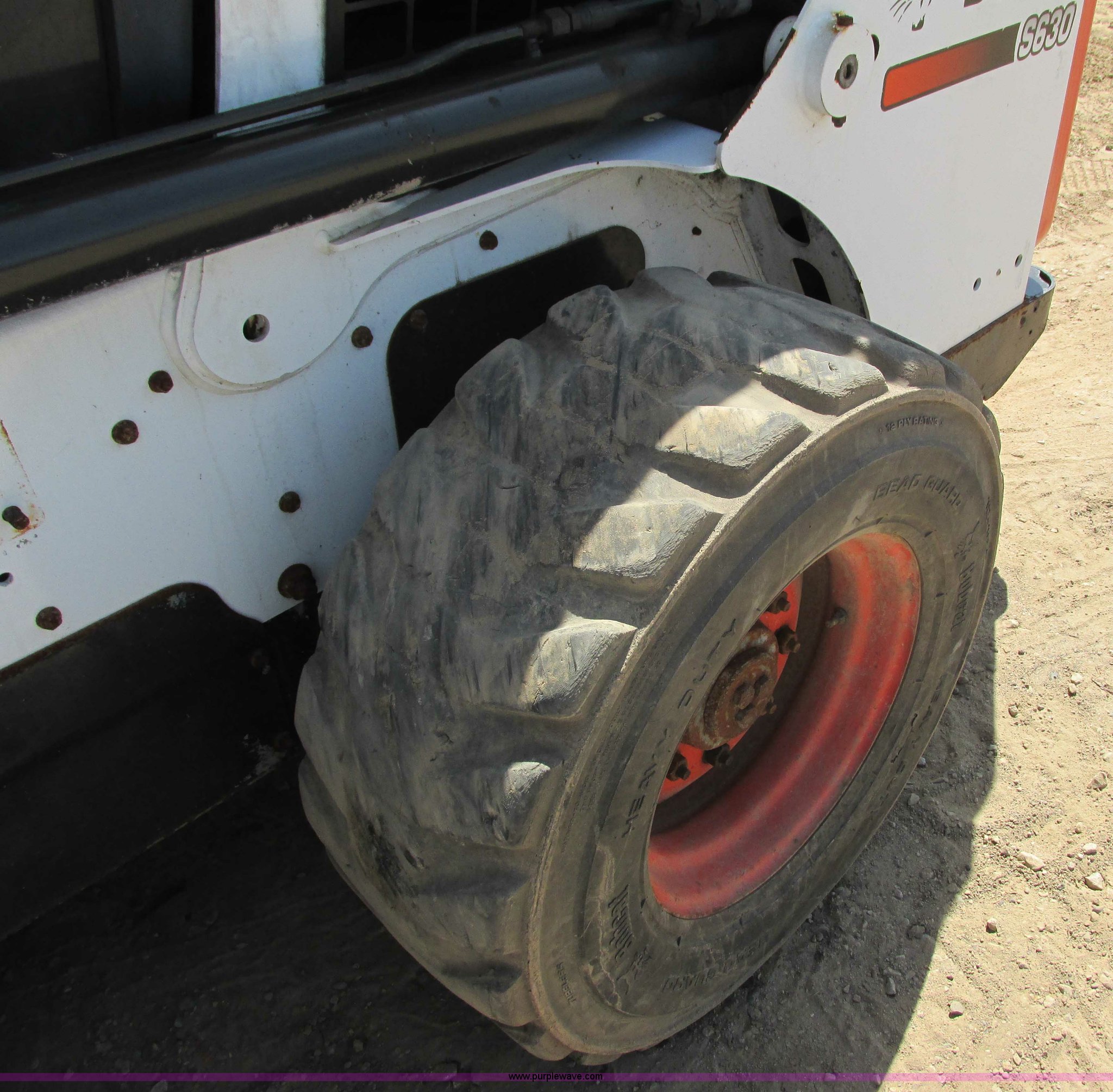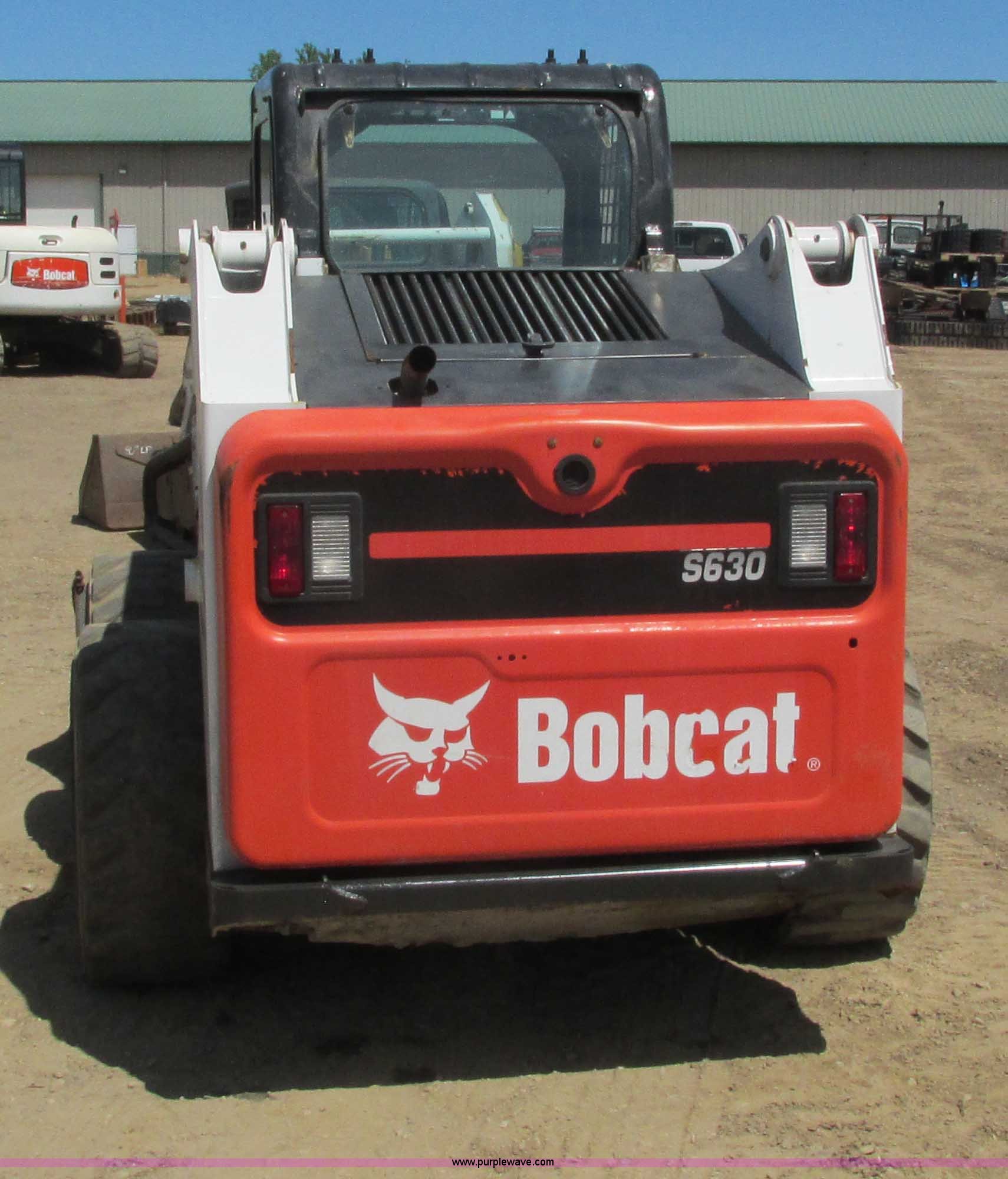 Purple Wave is selling a used Skid Steer Loader in Wisconsin. This item is a 2011 Bobcat S630 skid steer with the following: 696 hours on meter, Kubota 3.3L four cylinder diesel engine, 74 HP, Hydrostatic transmission, Enclosed cab, AC and heat, Sound package, Spring suspension seat, Hand and foot controls, Backup alarm, Windshield wipers, Auxiliary hydraulics, Front and rear work lights, 80"W bucket, Bolt-on cutting edge, Manual quick coupler, 12-16.5 tires, 2,180 lbs rated operating capacity, 4,360 lbs tipping load, 7.1 mph travel speed, 27.5 gallon fuel tank, 7,610 lbs. base operating weight, Serial A3NT13266