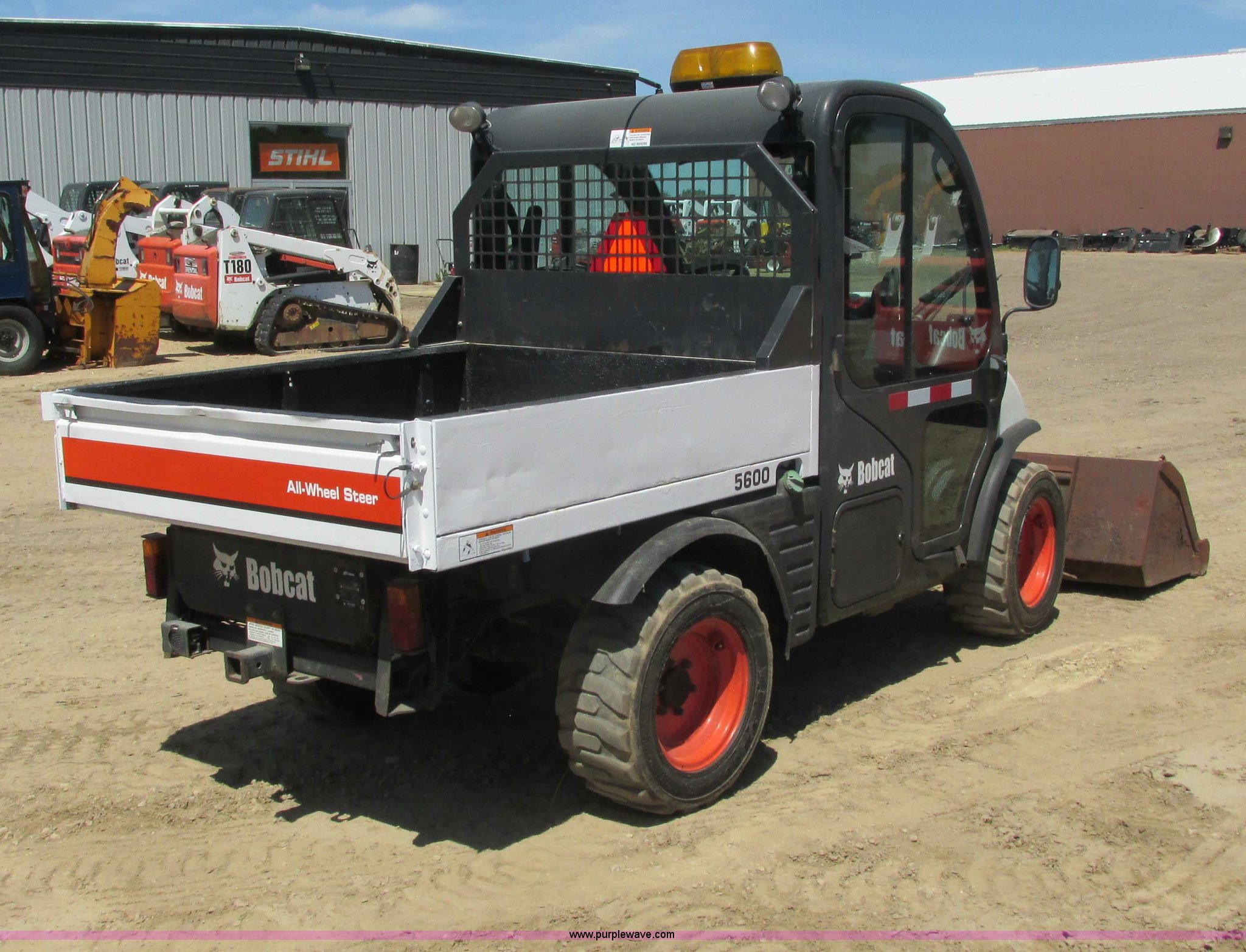 Purple Wave is selling a used Utility Vehicle in Wisconsin. This item is a 2004 Bobcat Toolcat 5600 utility work machine with the following: 3,114 hours on meter, Kubota four cylinder diesel engine, Two speed hydrostatic transmission, Four wheel drive, Four wheel steer, Enclosed cab, AC and heat, AM/FM, Bucket seats, Back up alarm, Windshield wipers, Rear window guard, Front and rear work lights, Road light package, 65"L x 57"W hydraulic dump bed, 72"W bucket, Manual quick connect, Seven pin attachment control kit, High-Flow hydraulics, Duraforce DT 27 x 10.5-15 tires, Serial 424711160