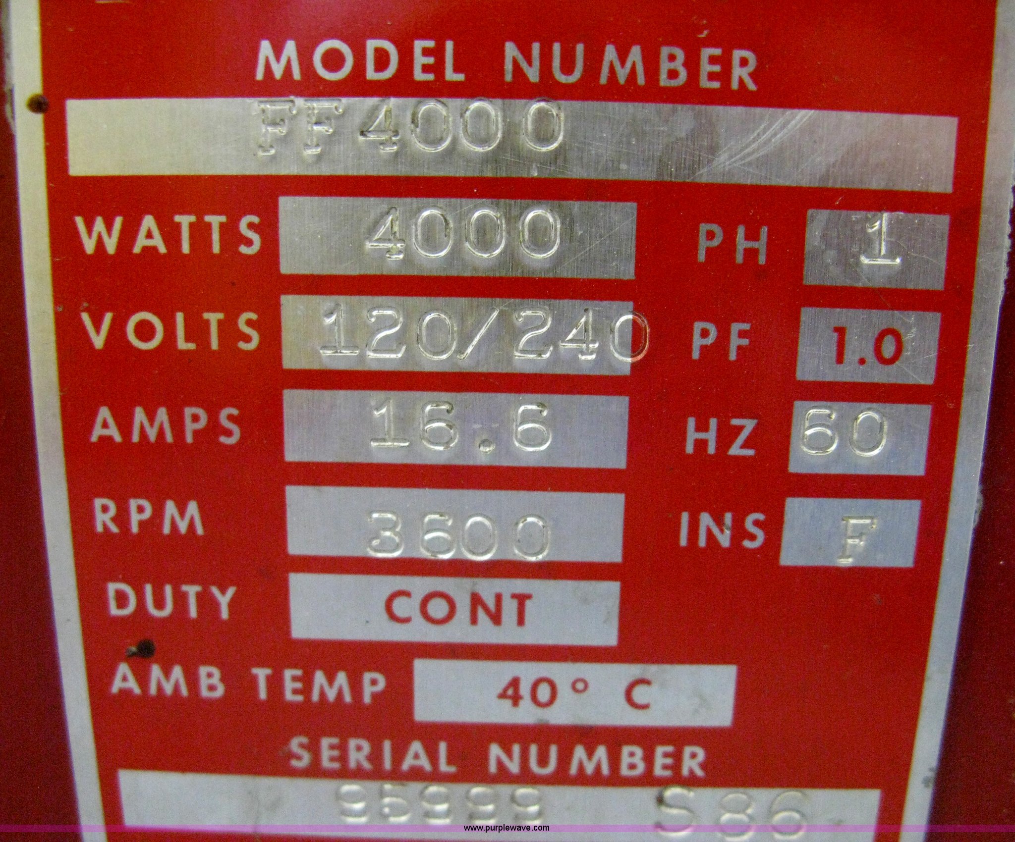 Purple Wave is selling a used Generator Set in Kansas. This item is a Winco FF4000 generator with the following: Briggs & Stratton 8 HP gas engine, 4,000 watts, 120/240V, Single phase, Unknown operating condition, Serial 95999-S86