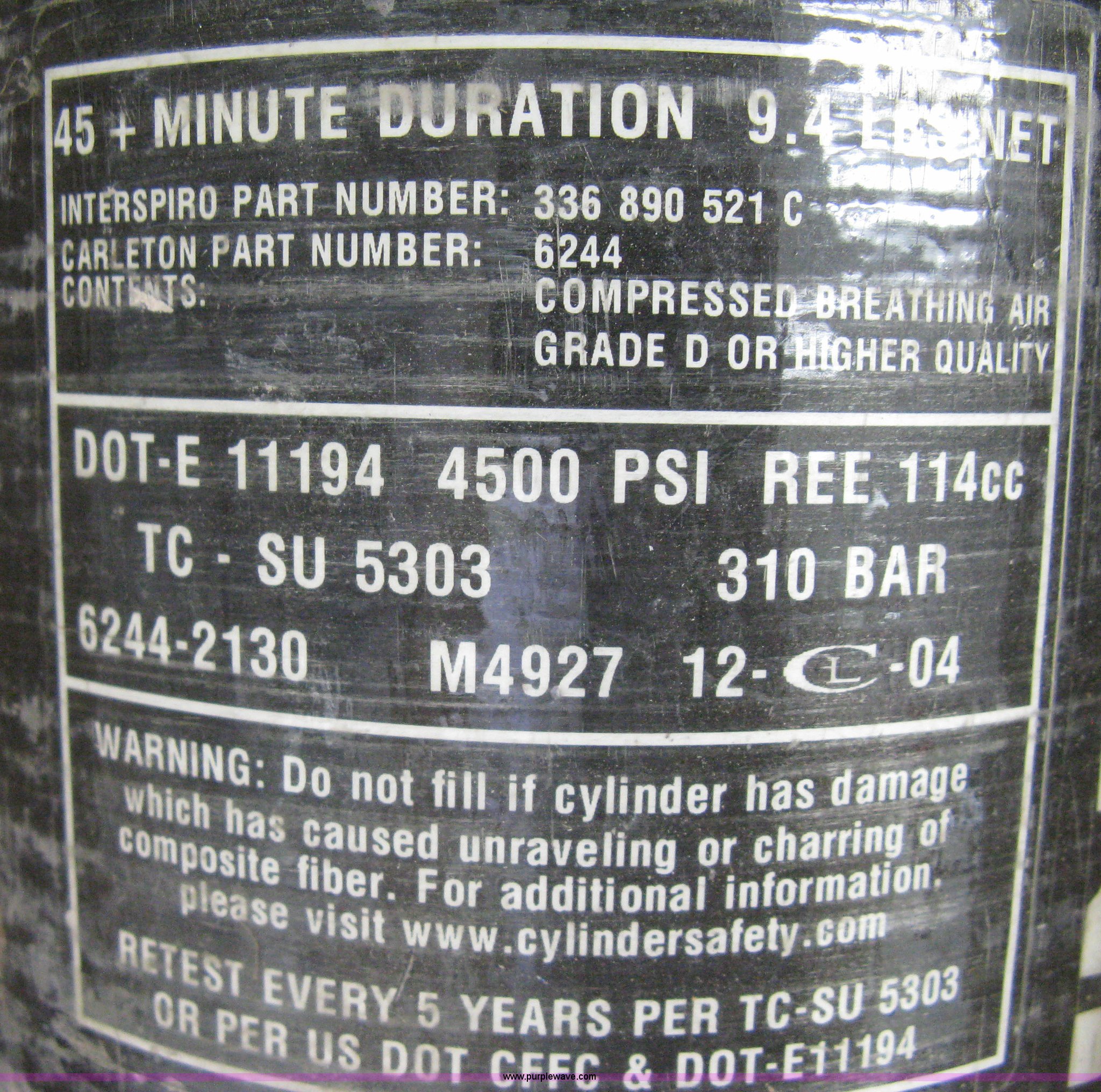 Purple Wave is selling a used Tools in Kansas. This item is a (41) Interspiro SCBA compressed air cylinders with the following: 4,500 psi, 45 minimum duration rating, 9.4 lbs, Composite bottle, (31) Mfg in 2004, (10) Mfg in 2002