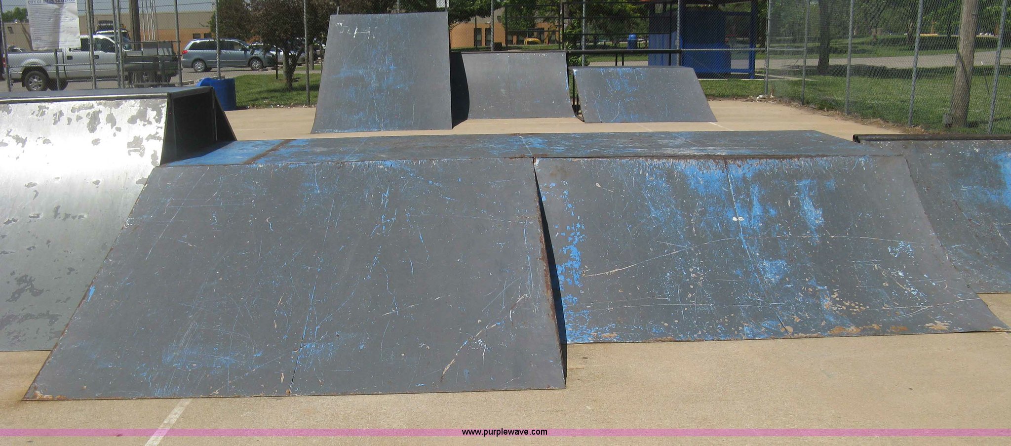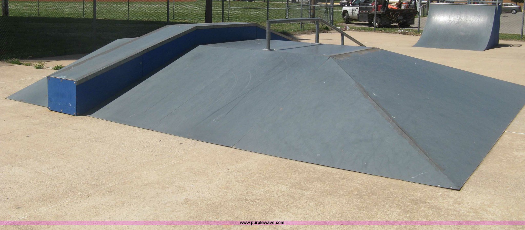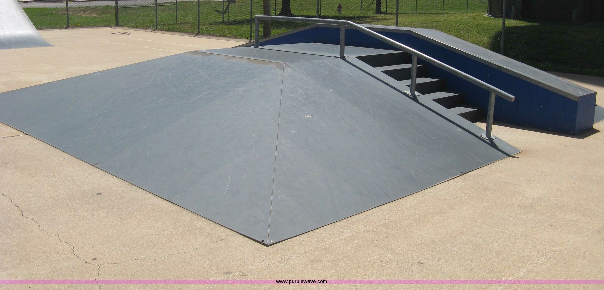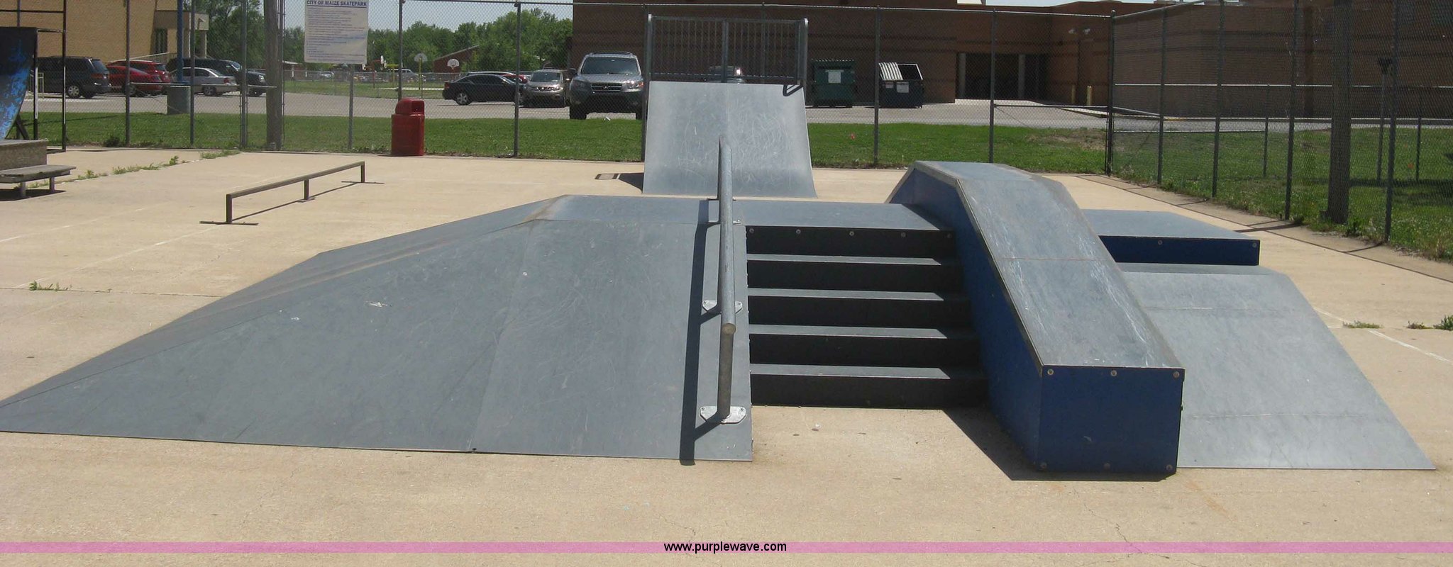Shop built skate park ramp and skate features. 8'W x 5'H quarter pipe ramp with 4' platform and safety rail Ramp/launch feature, Approx. 21' x 21', Staircase, Steel rail, Grind box, 8'W x 42"H launch ramp with 4' platform and safety rail 20.2'L flat rail, 20'L round bank style rail, ARC 6'L grind bench, Three section ramp and quarter pipe feature with safety rail Independently constructed ramps Welded/coupled together, Three section ramp and quarter pipe spine feature Independently constructed ramps Weld/coupled together, Four section ramp and quarter pipe feature with safety rail Welded/coupled together, 8'W , Varying heights from 32" to 7', Square tubing steel construction, Steel plate ramp surface. Removal to be arranged and performed by the buyer. City of Maize. Maize, KS 67101