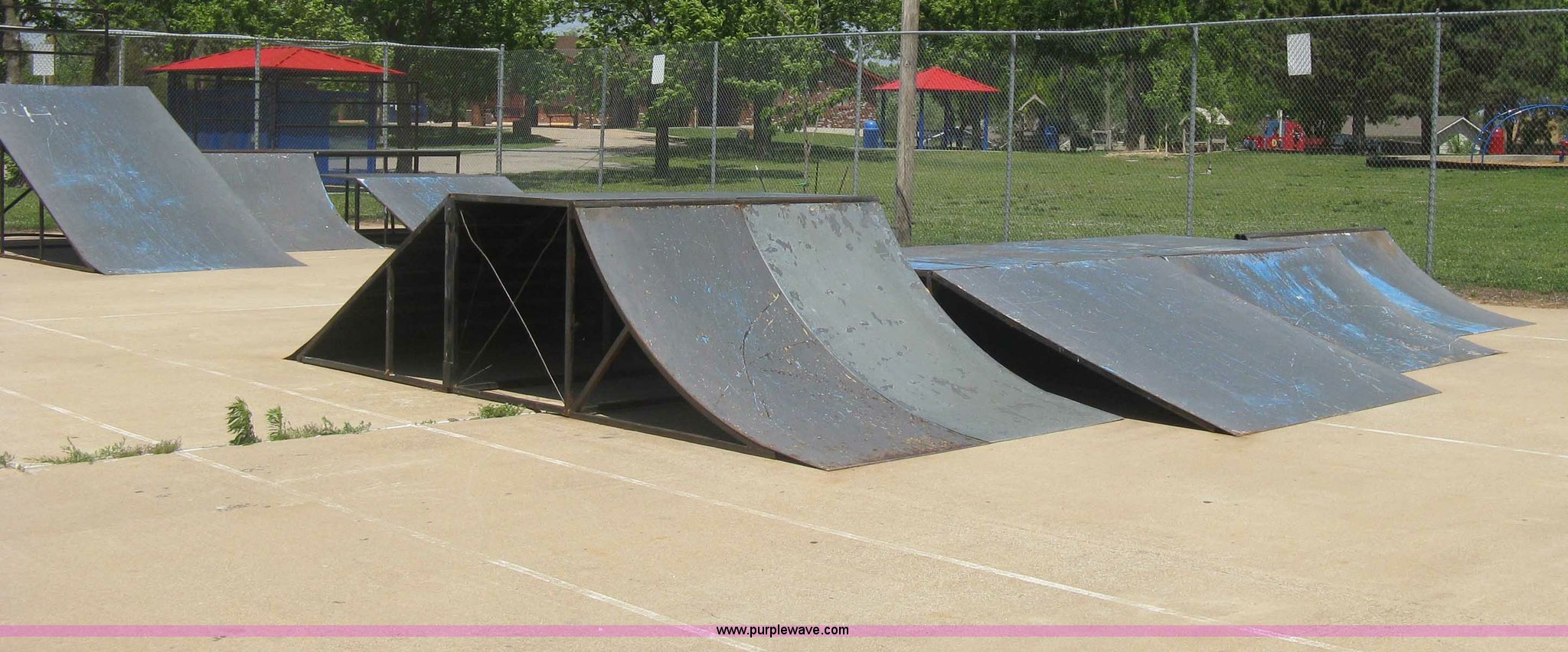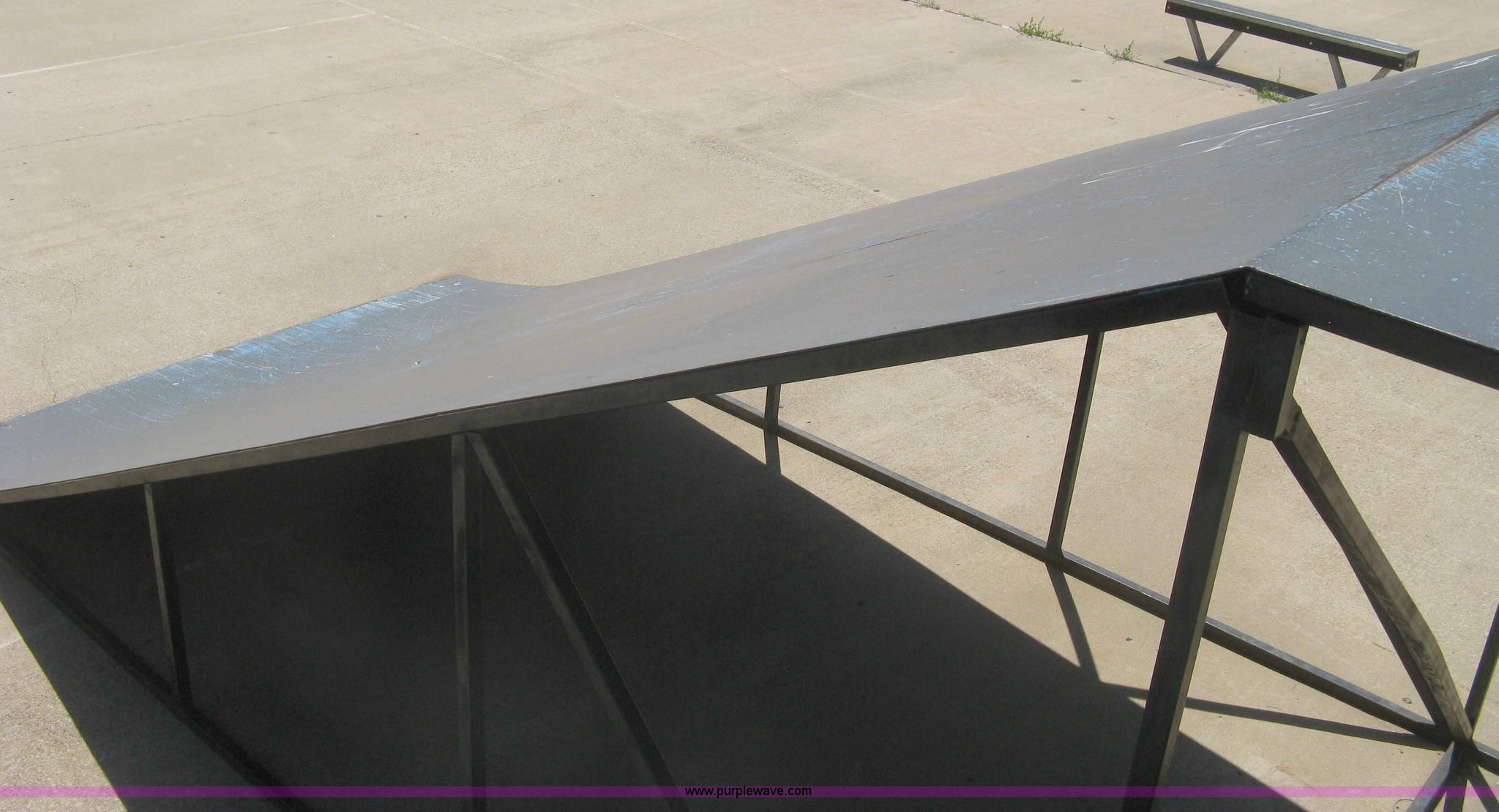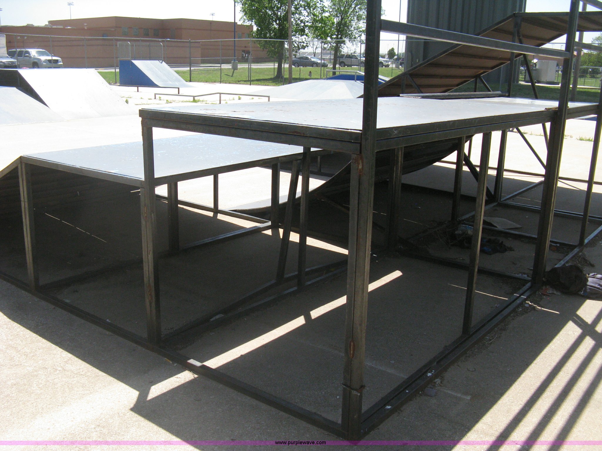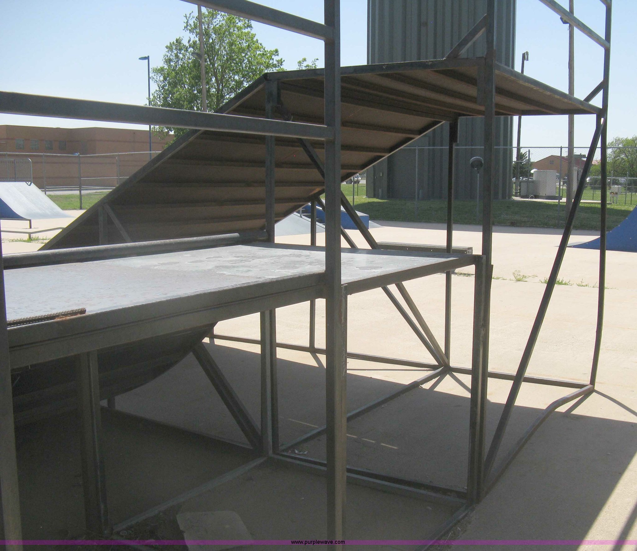 Shop built skate park ramp and skate features. 8'W x 5'H quarter pipe ramp with 4' platform and safety rail Ramp/launch feature, Approx. 21' x 21', Staircase, Steel rail, Grind box, 8'W x 42"H launch ramp with 4' platform and safety rail 20.2'L flat rail, 20'L round bank style rail, ARC 6'L grind bench, Three section ramp and quarter pipe feature with safety rail Independently constructed ramps Welded/coupled together, Three section ramp and quarter pipe spine feature Independently constructed ramps Weld/coupled together, Four section ramp and quarter pipe feature with safety rail Welded/coupled together, 8'W , Varying heights from 32" to 7', Square tubing steel construction, Steel plate ramp surface. Removal to be arranged and performed by the buyer. City of Maize. Maize, KS 67101