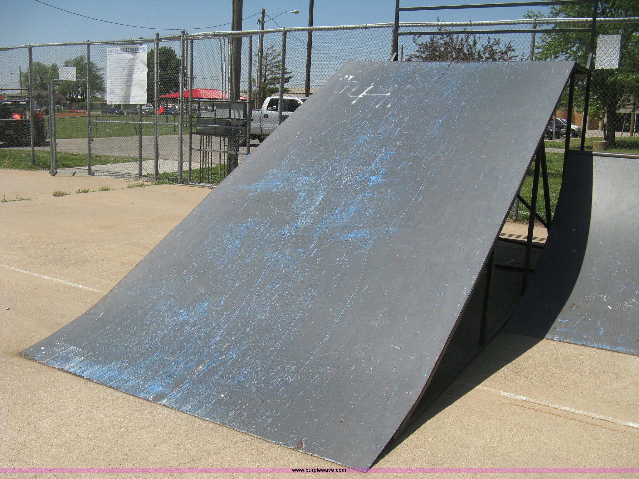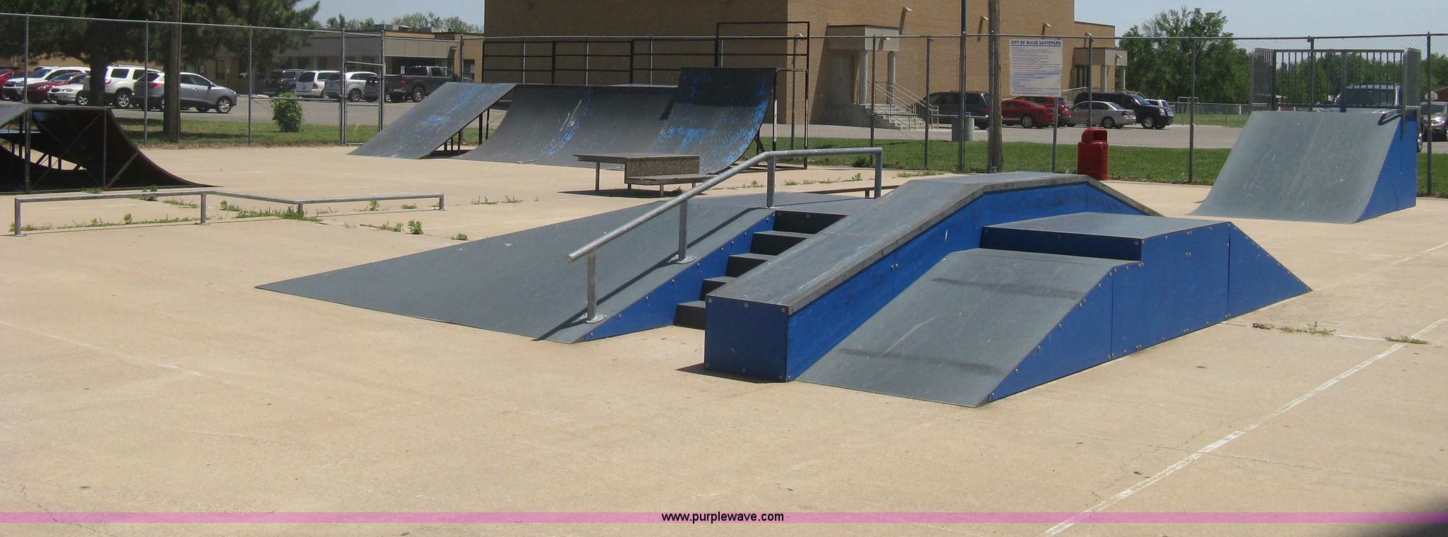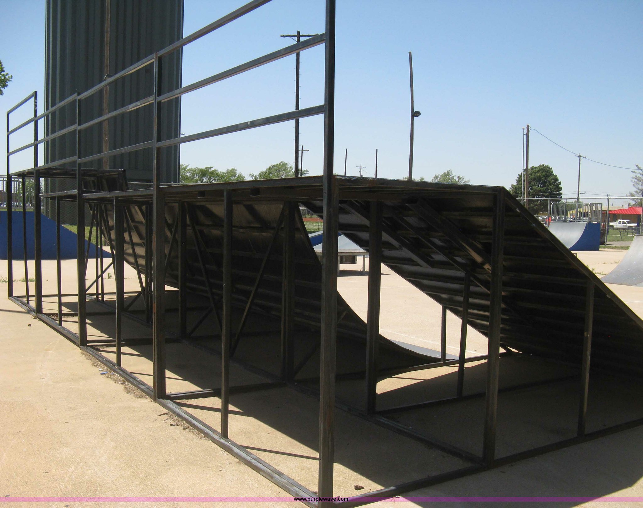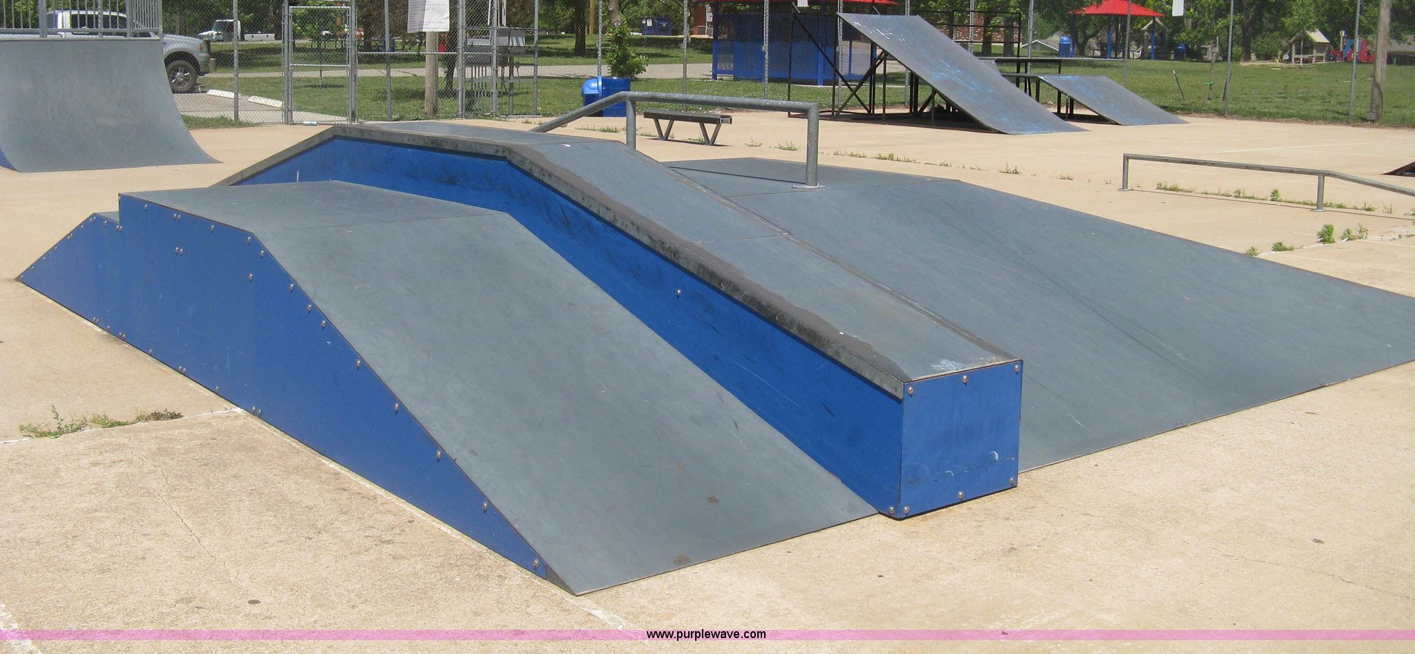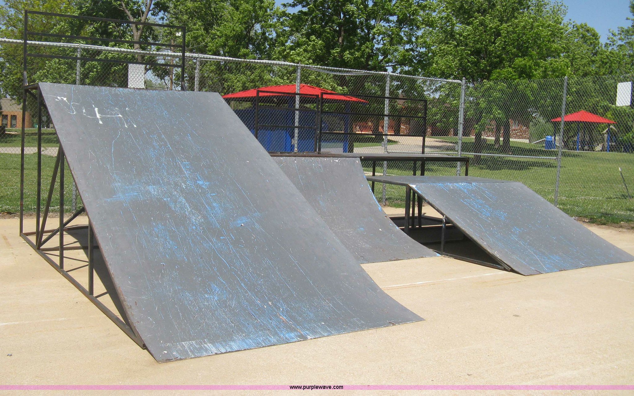 Shop built skate park ramp and skate features. 8'W x 5'H quarter pipe ramp with 4' platform and safety rail Ramp/launch feature, Approx. 21' x 21', Staircase, Steel rail, Grind box, 8'W x 42"H launch ramp with 4' platform and safety rail 20.2'L flat rail, 20'L round bank style rail, ARC 6'L grind bench, Three section ramp and quarter pipe feature with safety rail Independently constructed ramps Welded/coupled together, Three section ramp and quarter pipe spine feature Independently constructed ramps Weld/coupled together, Four section ramp and quarter pipe feature with safety rail Welded/coupled together, 8'W , Varying heights from 32" to 7', Square tubing steel construction, Steel plate ramp surface. Removal to be arranged and performed by the buyer. City of Maize. Maize, KS 67101