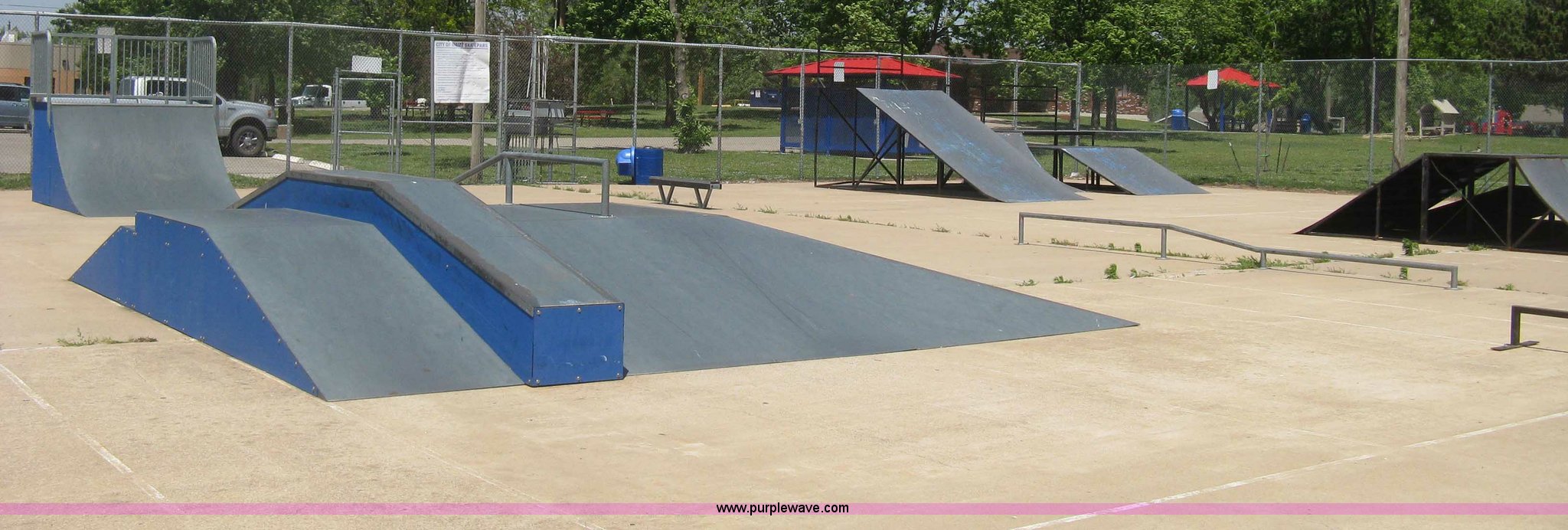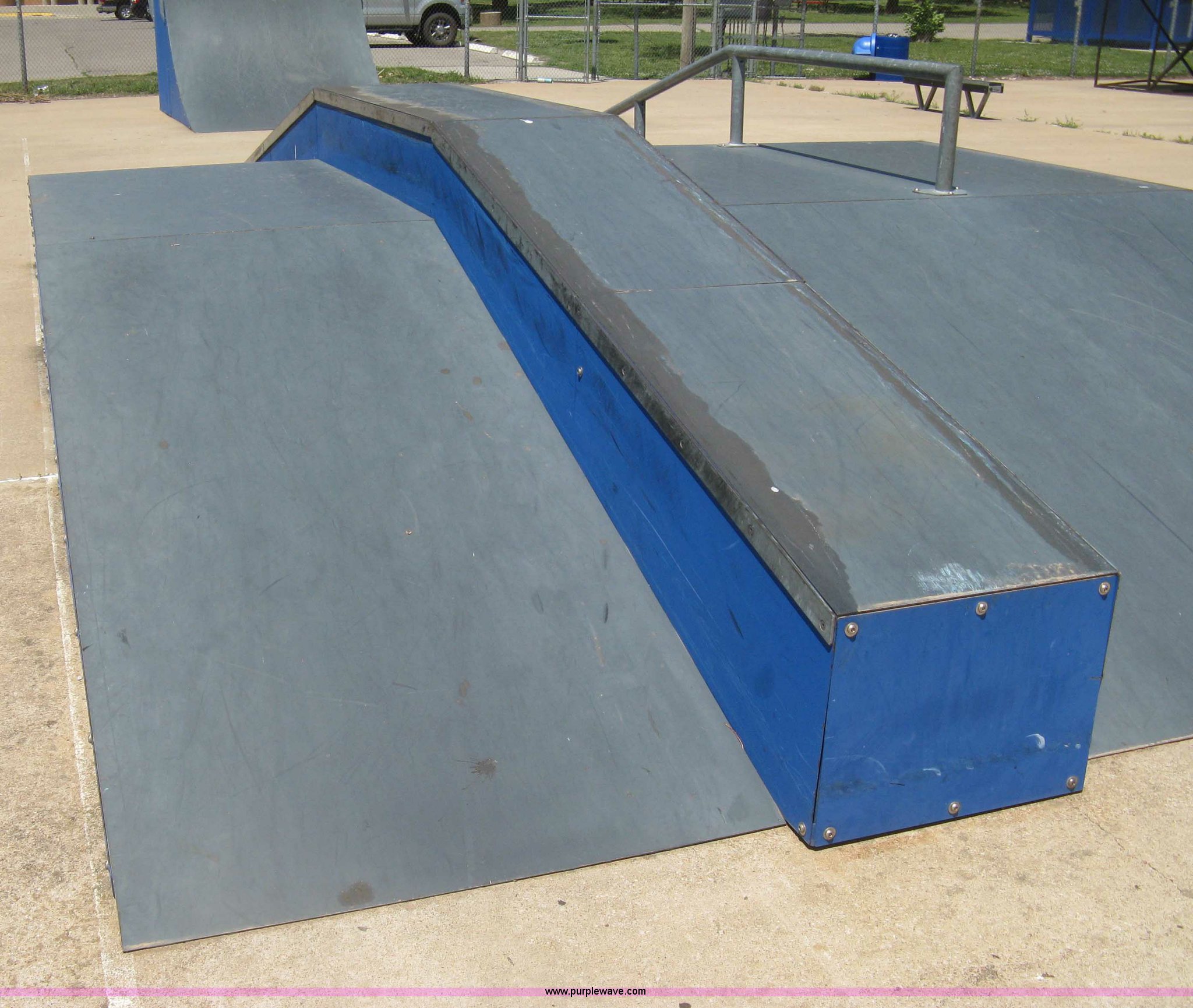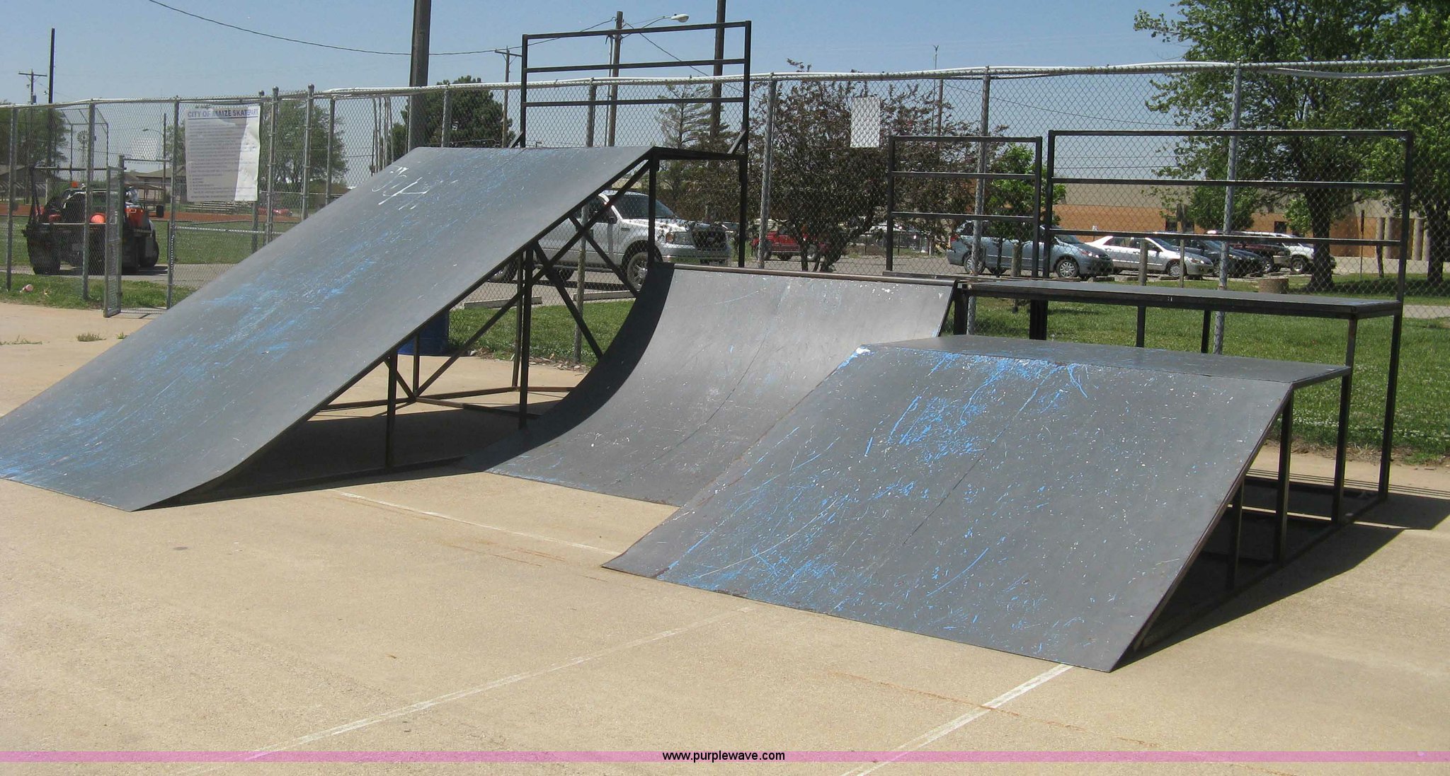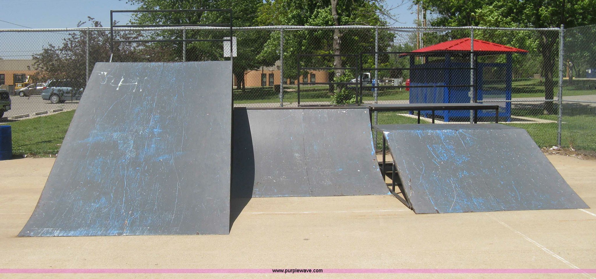 Shop built skate park ramp and skate features. 8'W x 5'H quarter pipe ramp with 4' platform and safety rail Ramp/launch feature, Approx. 21' x 21', Staircase, Steel rail, Grind box, 8'W x 42"H launch ramp with 4' platform and safety rail 20.2'L flat rail, 20'L round bank style rail, ARC 6'L grind bench, Three section ramp and quarter pipe feature with safety rail Independently constructed ramps Welded/coupled together, Three section ramp and quarter pipe spine feature Independently constructed ramps Weld/coupled together, Four section ramp and quarter pipe feature with safety rail Welded/coupled together, 8'W , Varying heights from 32" to 7', Square tubing steel construction, Steel plate ramp surface. Removal to be arranged and performed by the buyer. City of Maize. Maize, KS 67101