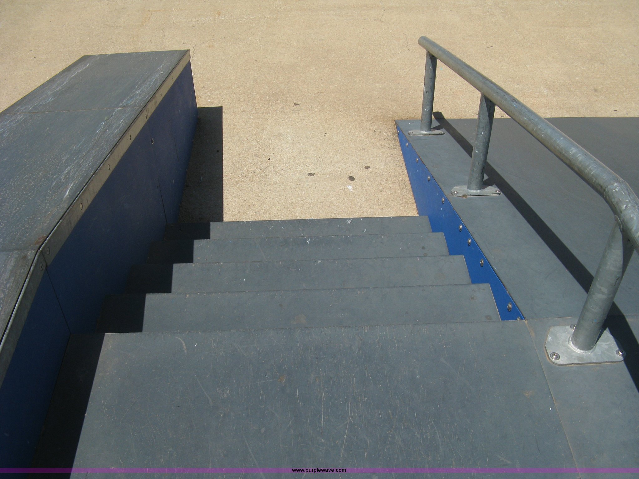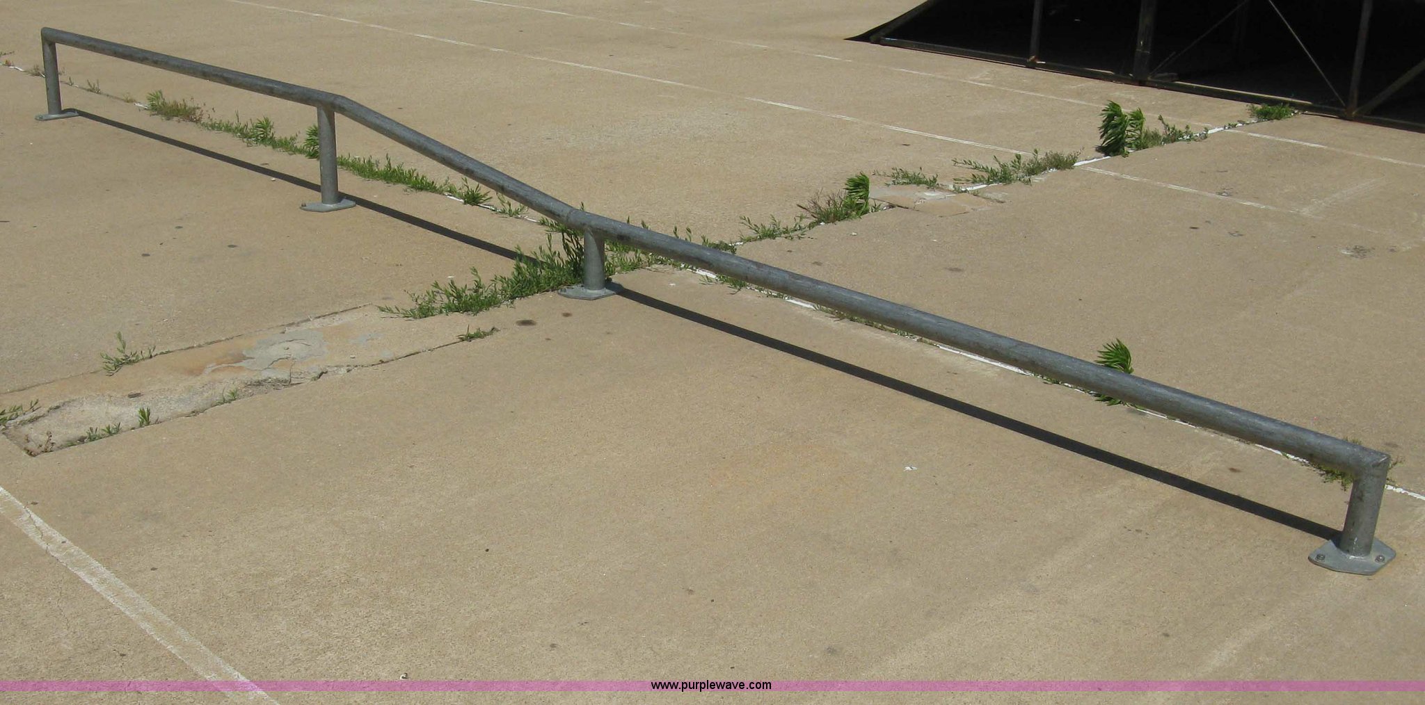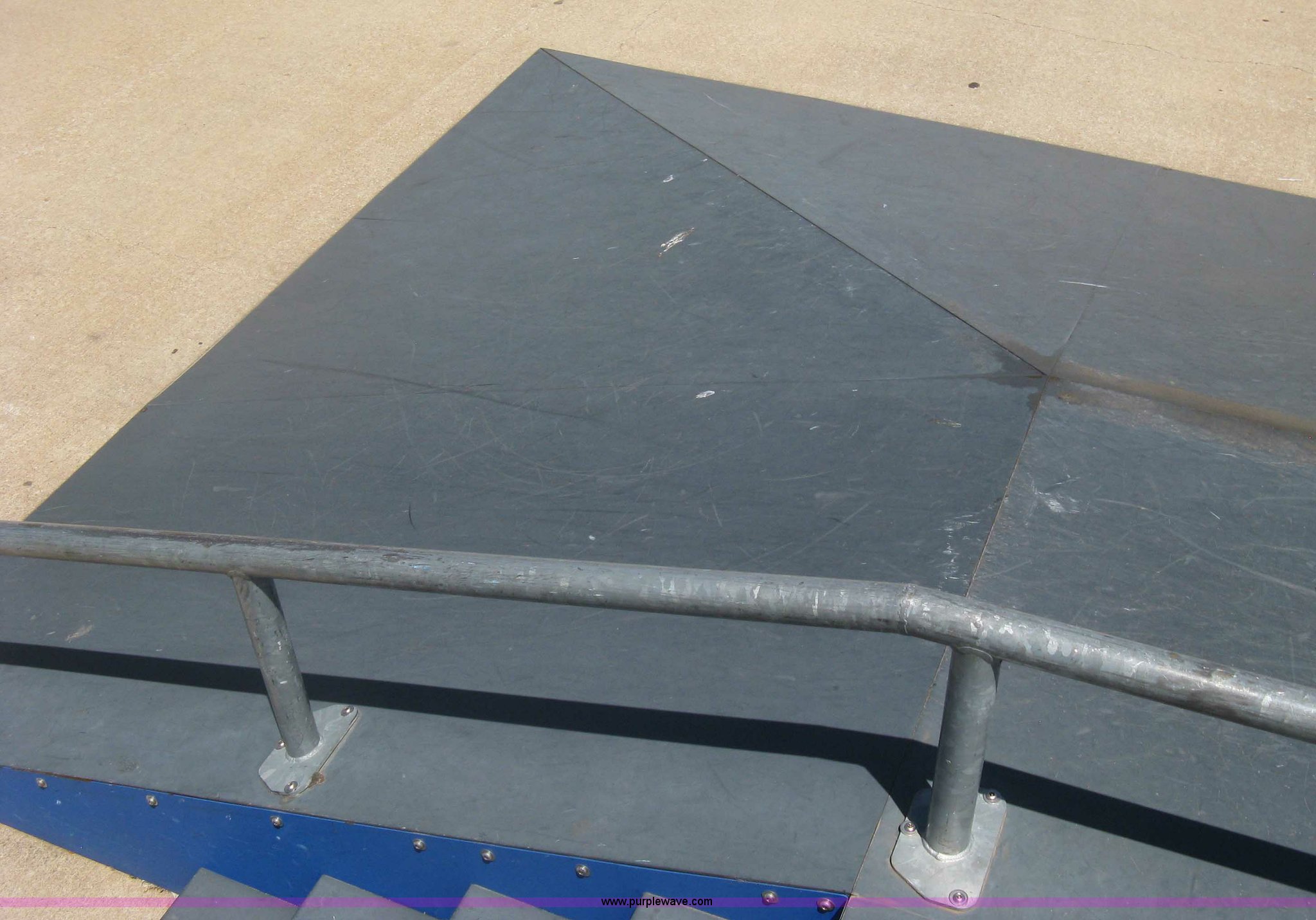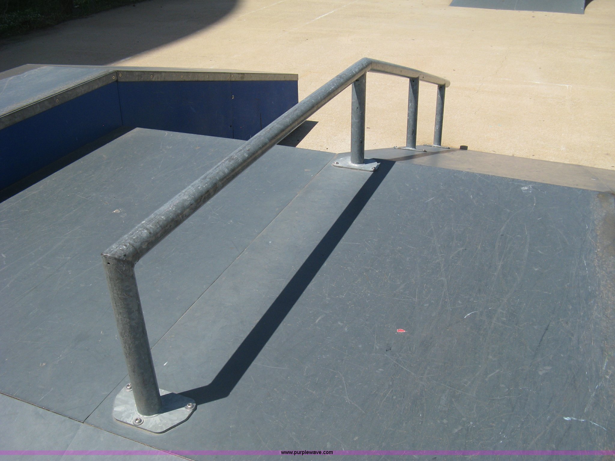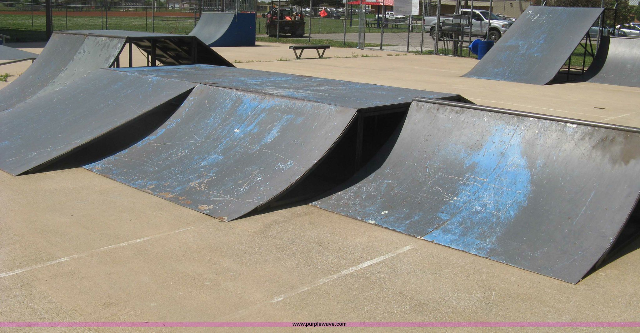 Purple Wave is selling a used Sporting Goods in Kansas. This item is a Shop built skate park ramp and skate features with the following: 8'W x 5'H quarter pipe ramp with 4' platform and safety rail, Ramp/launch feature, Approx. 21' x 21', Staircase, Steel rail, Grind box, 8'W x 42"H launch ramp with 4' platform and safety rail, 20.2'L flat rail, 20'L round bank style rail, ARC 6'L grind bench, Three section ramp and quarter pipe feature with safety rail, Independently constructed ramps, Welded/coupled together,, Three section ramp and quarter pipe spine feature, Independently constructed ramps, Weld/coupled together,, Four section ramp and quarter pipe feature with safety rail, Welded/coupled together, 8'W, Varying heights from 32" to 7', Square tubing steel construction, Steel plate ramp surface