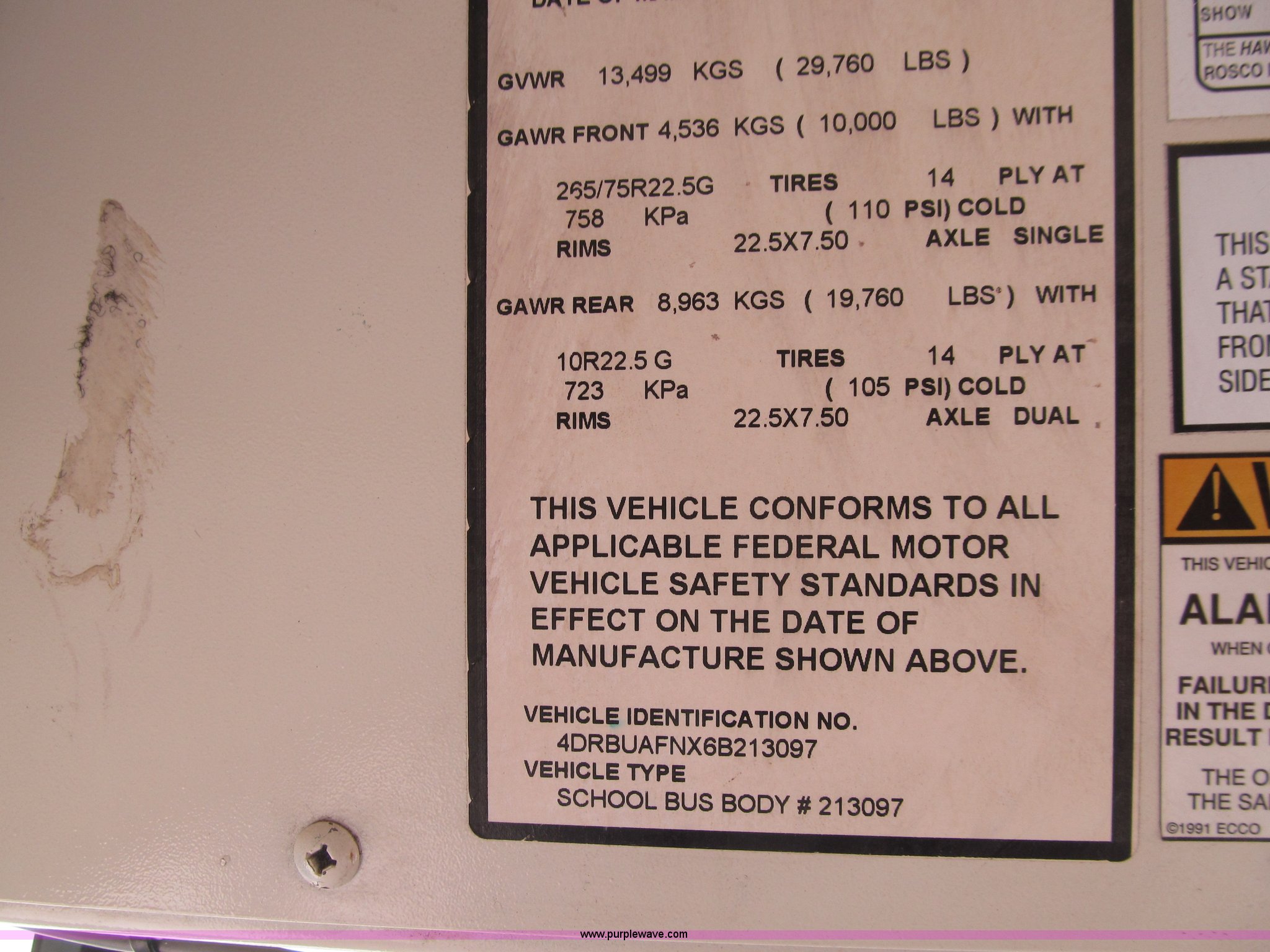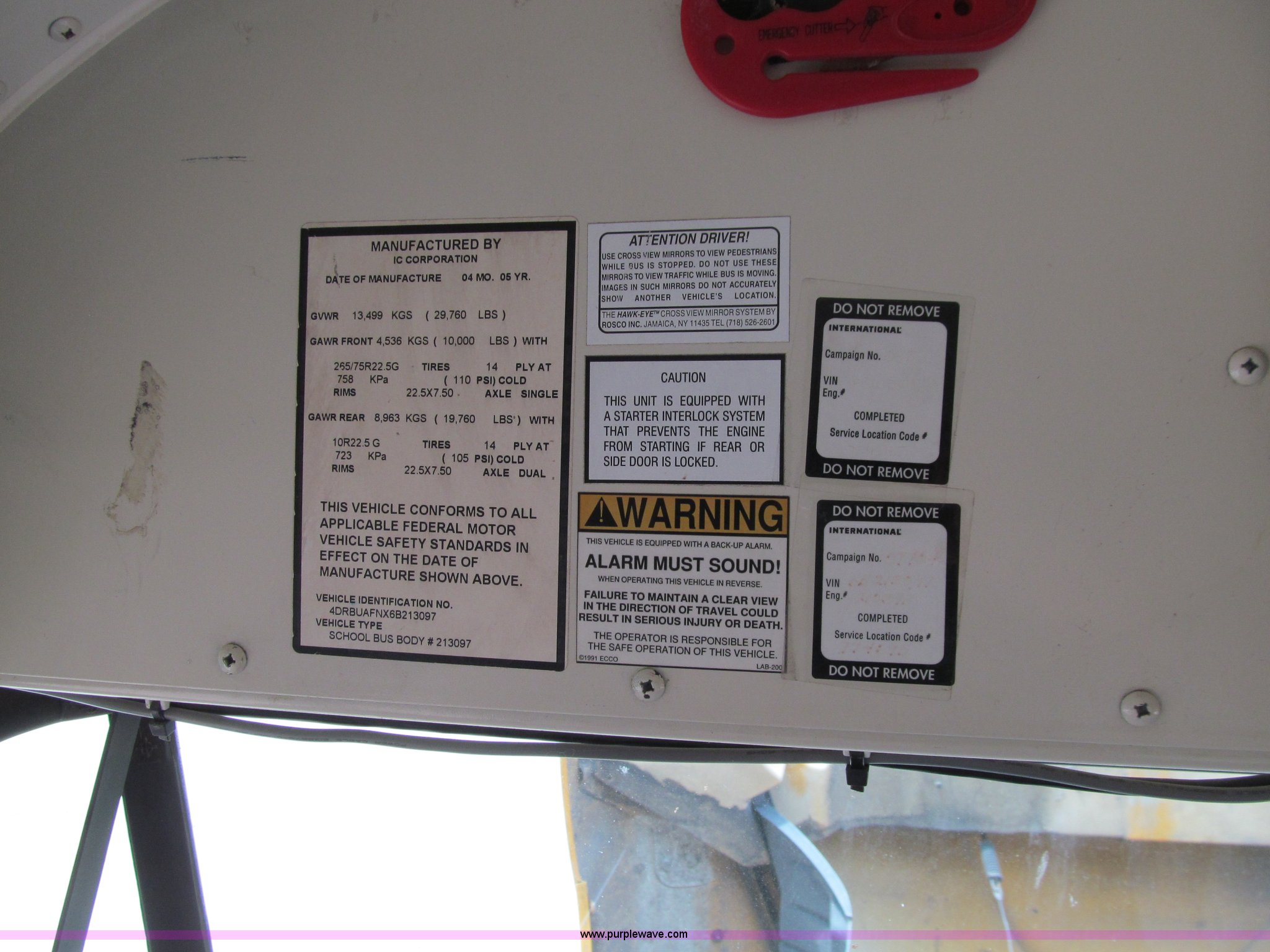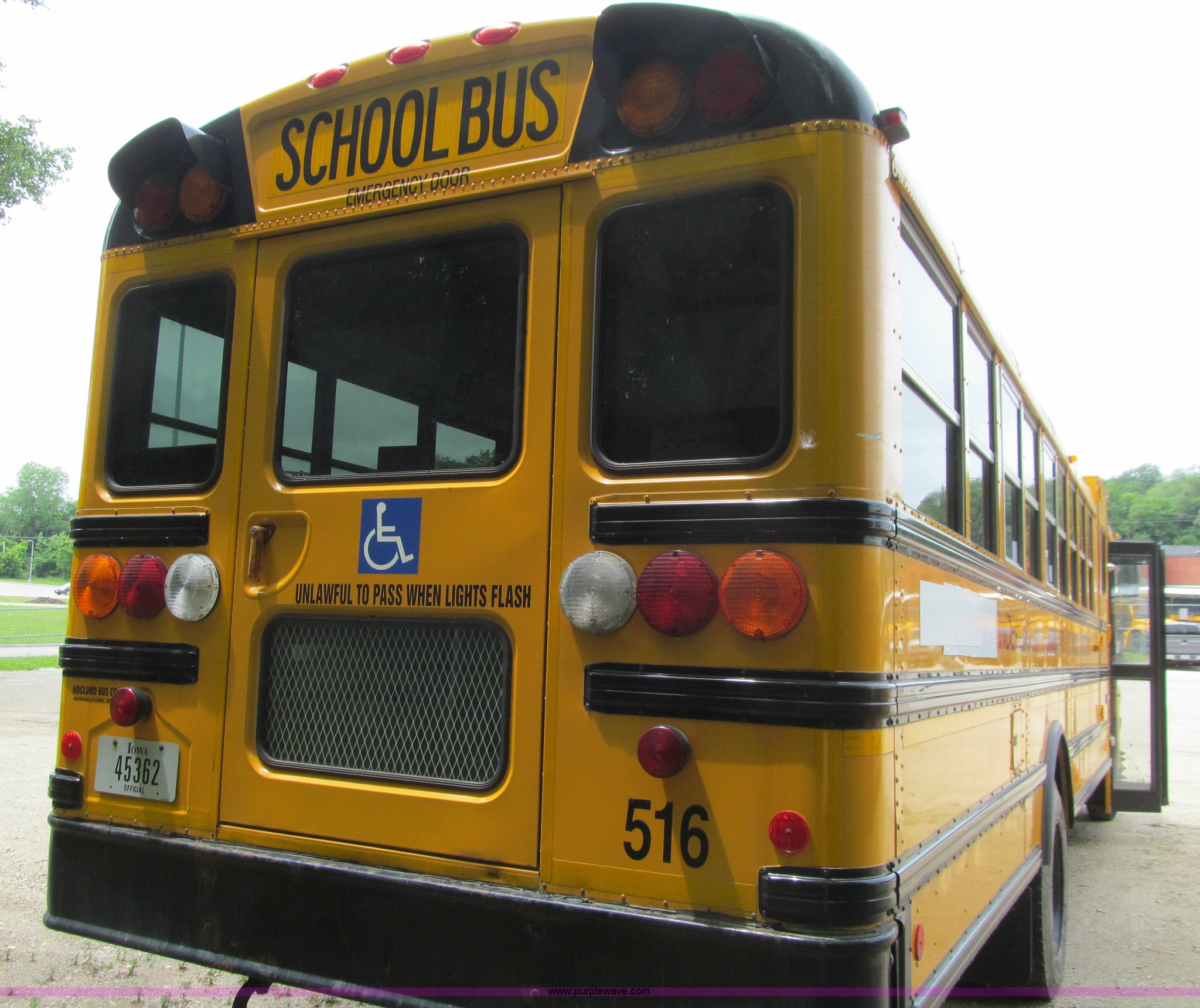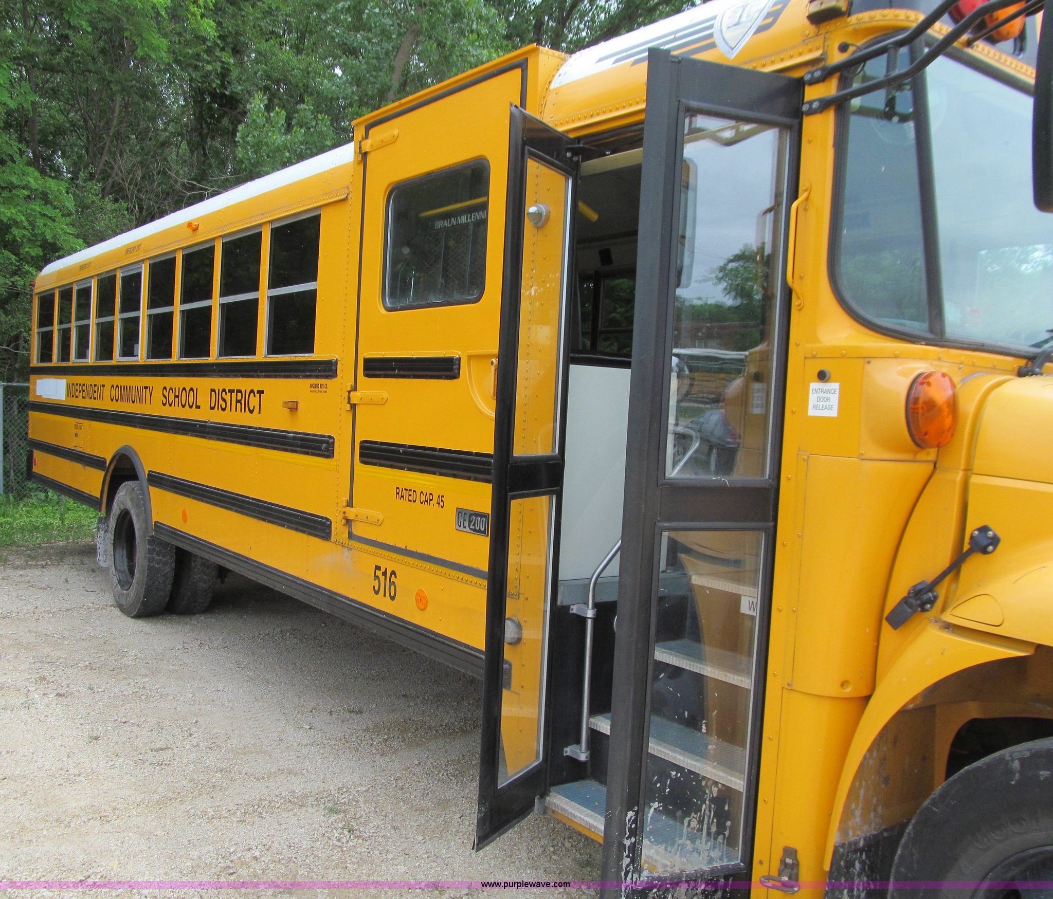 Purple Wave is selling a used Bus in Iowa. This item is a 2006 International IC school bus with the following: 110,017 miles on odometer, International A215 6.0L V8 turbo diesel engine, 215 HP, Automatic transmission, Heat, Tilt, Cruise, AM/FM, Air suspension driver's seat, Vinyl interior, 45 passenger capacity, (7) emergency egress, Braun Corp wheelchair lift, Model NL917FIB, Serial AI-00441, Air suspension, 252" wheelbase, 10R22.5 tires, GVWR 29,706 lbs, FAWR 10,000 lbs, RAWR 19,760 lbs, Turbo charger and injectors need replaced, Engine smokes, Video recording system not included, Unit# 516