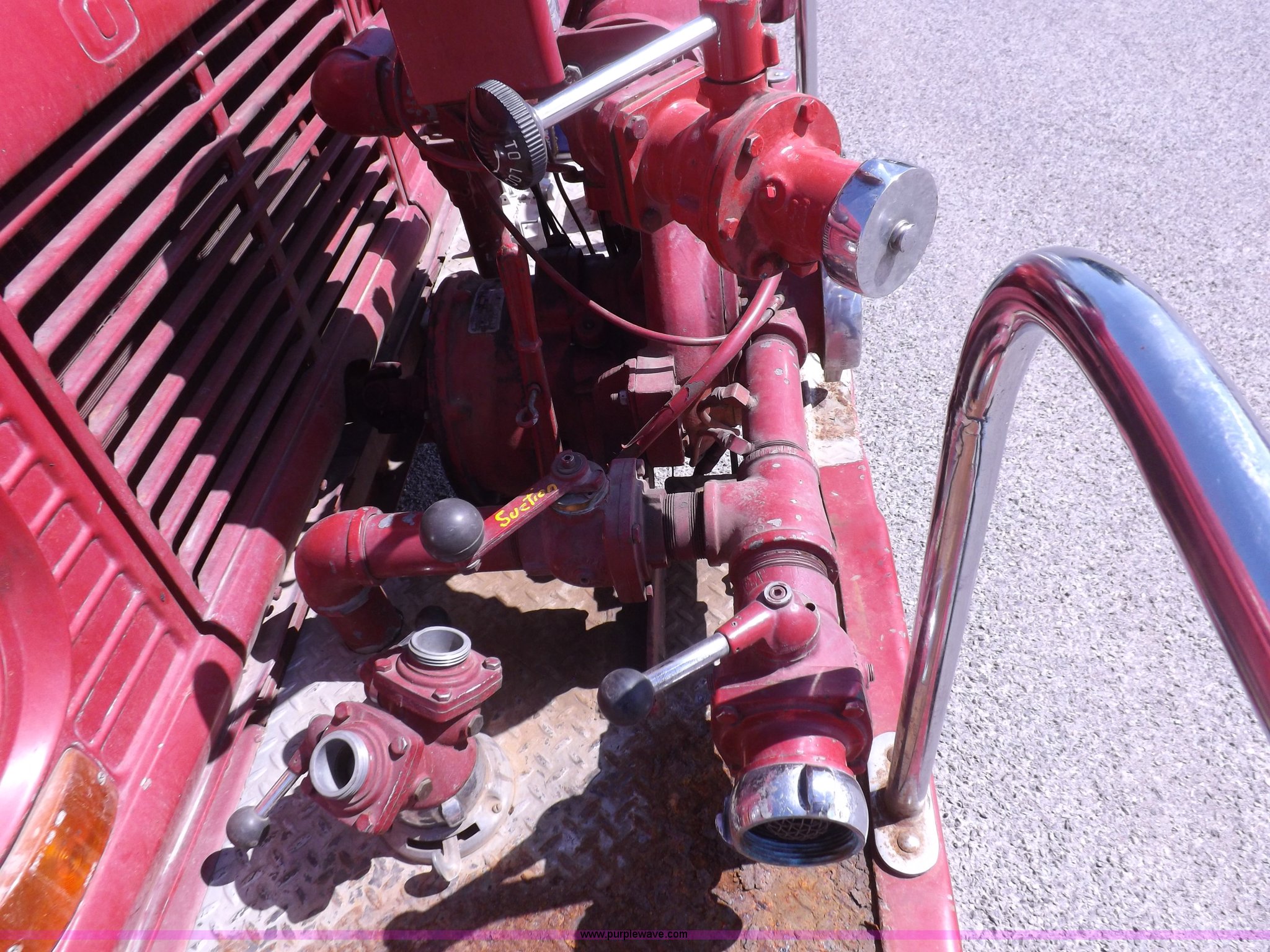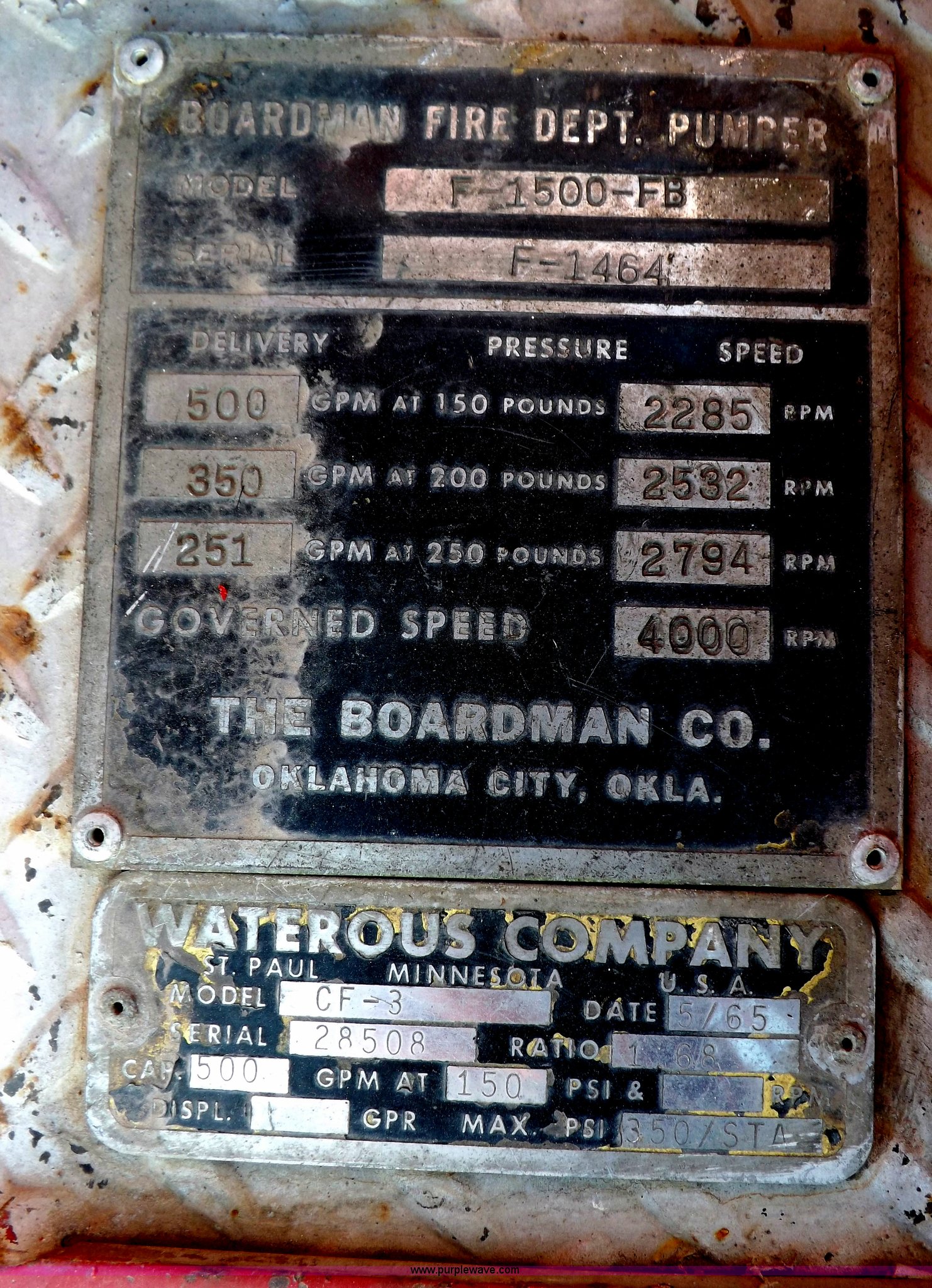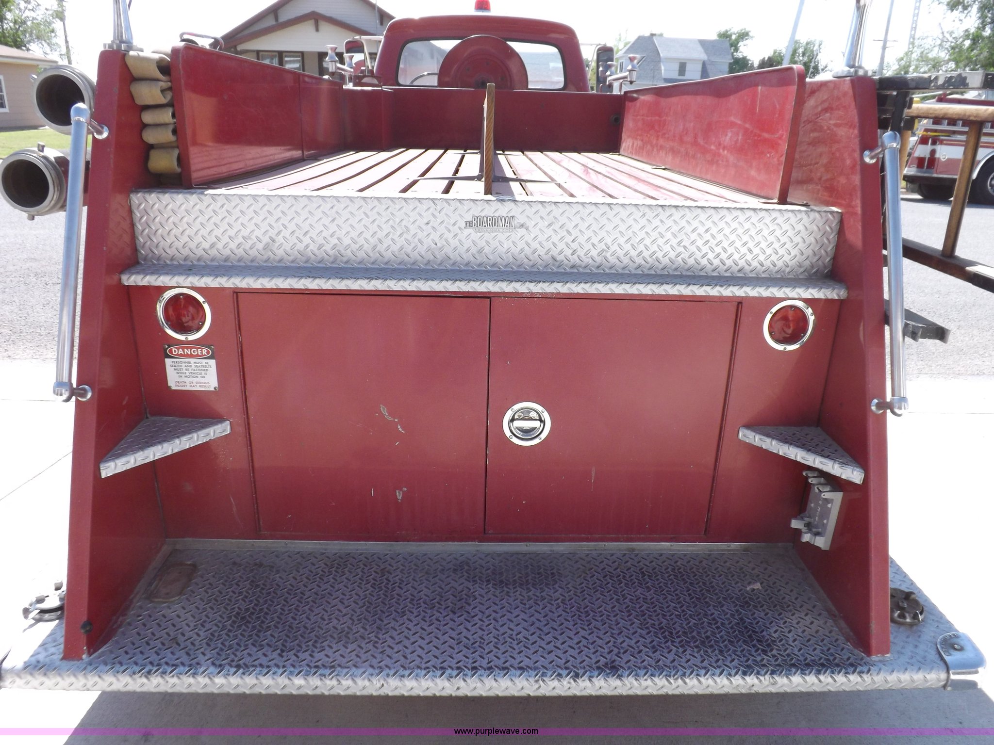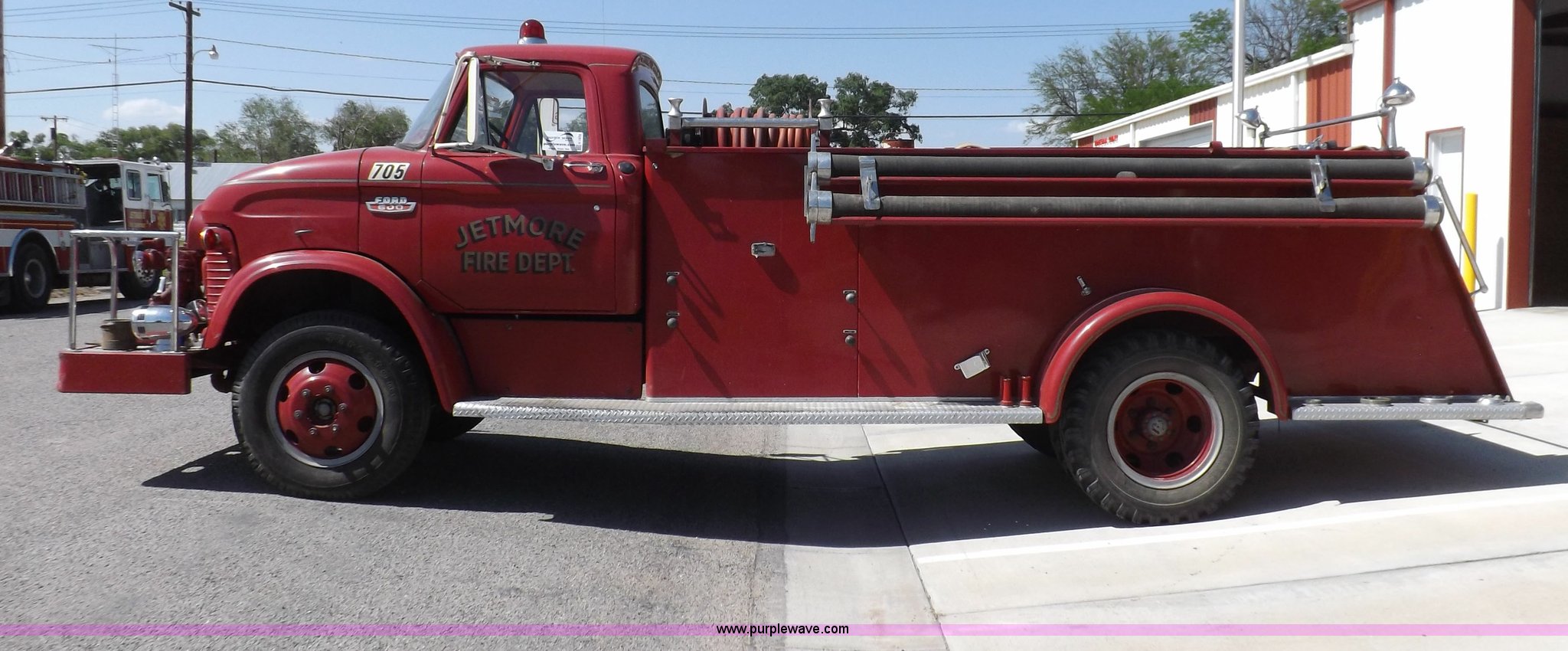 Purple Wave is selling a used Fire Truck or Emergency Vehicle in Kansas. This item is a 1965 Ford 600 fire truck with the following: 2,006 miles on odometer, 330 C.I.D. gas engine, Four speed manual transmission, Boardman Fire Fighting bed, (2) 10'L 4" hard suction hoses, Approx. 100' of 1.5" booster reel hose with rewind, Waterous pump, Model CF-3, Serial 28508, 500 gpm at 150 psi, Front driven PTO, (2) 20' wood extension ladders, Master electrical disconnect, Spring suspension, Hydraulic brakes, 163" wheelbase, 8.25-20 tires, GVWR 20,000 lbs, Cracked driver's side window