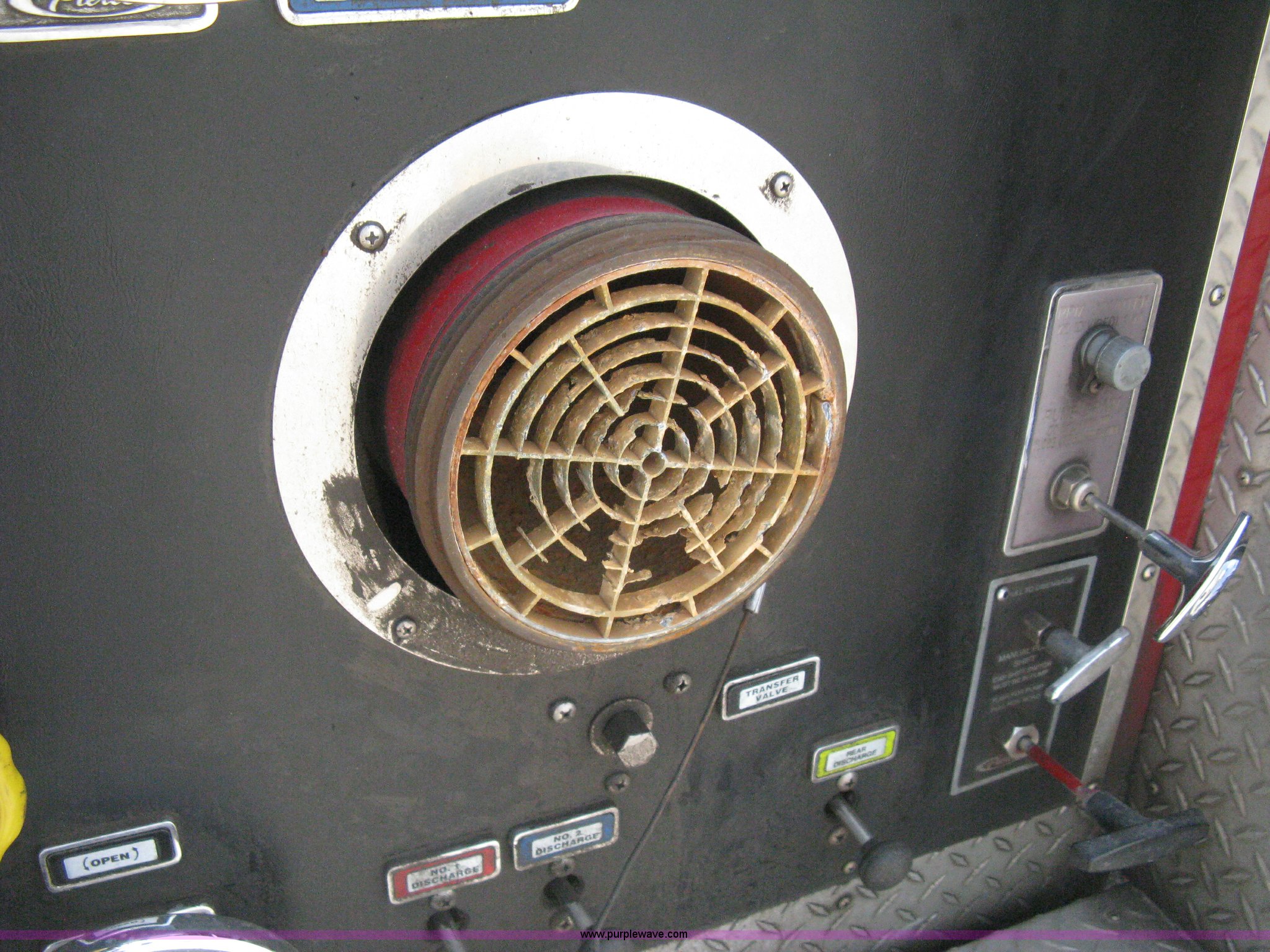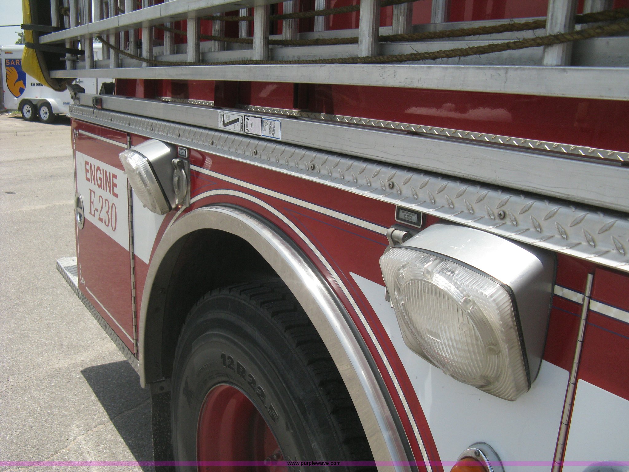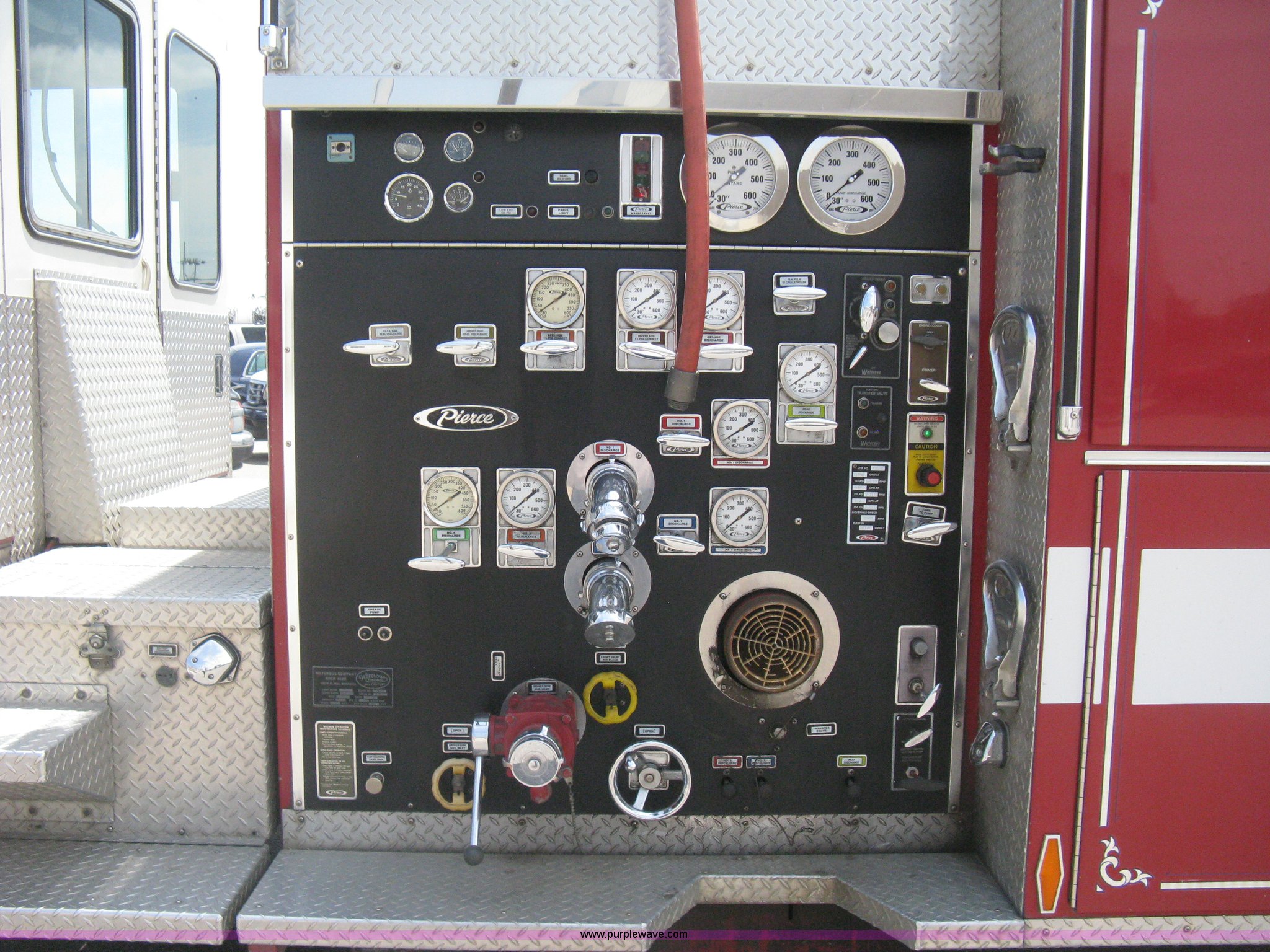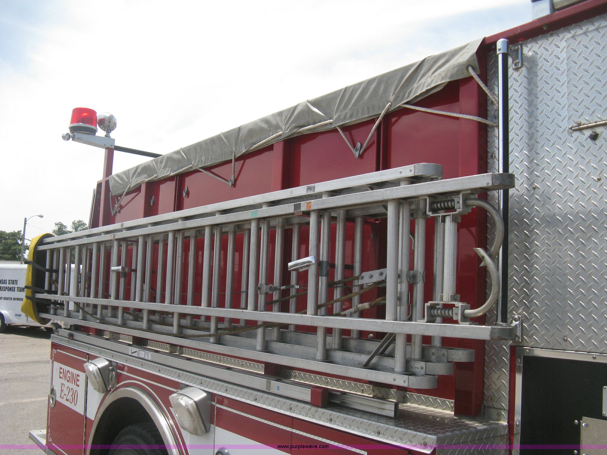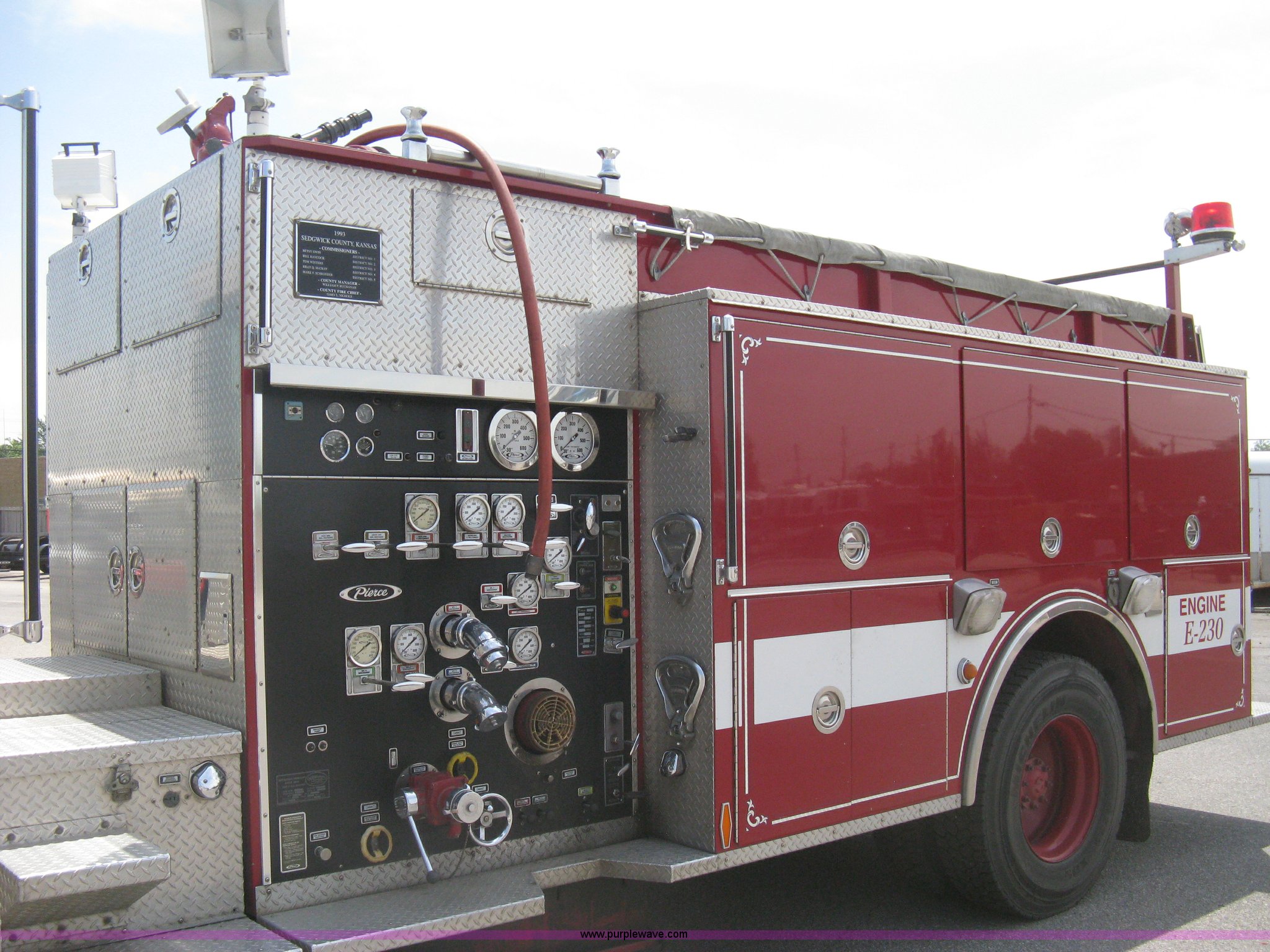 Purple Wave is selling a used Fire Truck or Emergency Vehicle in Kansas. This item is a 1993 Pierce pumper fire truck with the following: 137,820 actual miles, 8,785 engine hours on meter, 745 pump hours on meter, Cummins C8.3 8.3L L6 diesel engine, Automatic transmission, Heat, Telescoping steering wheel, Manual windows, Air suspension driver's seat, Vinyl interior, Circulation fans, Rear AC, Spotlights, Waterous pumping apparatus, Pump model CM, Trans model YCX, 1,250 gpm at 150 psig discharge, 600 psig max discharge, Top mount watering gun, Twin hose reels with hose, Canvas hose compartment cover, Side mount rescue extension ladder, Stow-away extension ladder, (7) side supply cabinets, (6) rear compartments, Honda EM5000S generator, Electronic ignition, Slide-out tray mount, (2) Pike poles, Air brakes, Aluminum front wheels, 315/80R22.5 front tires, 12R22.5 rear tires, GVWR 38,600 lbs, Interior cosmetic damage, Unit# E230