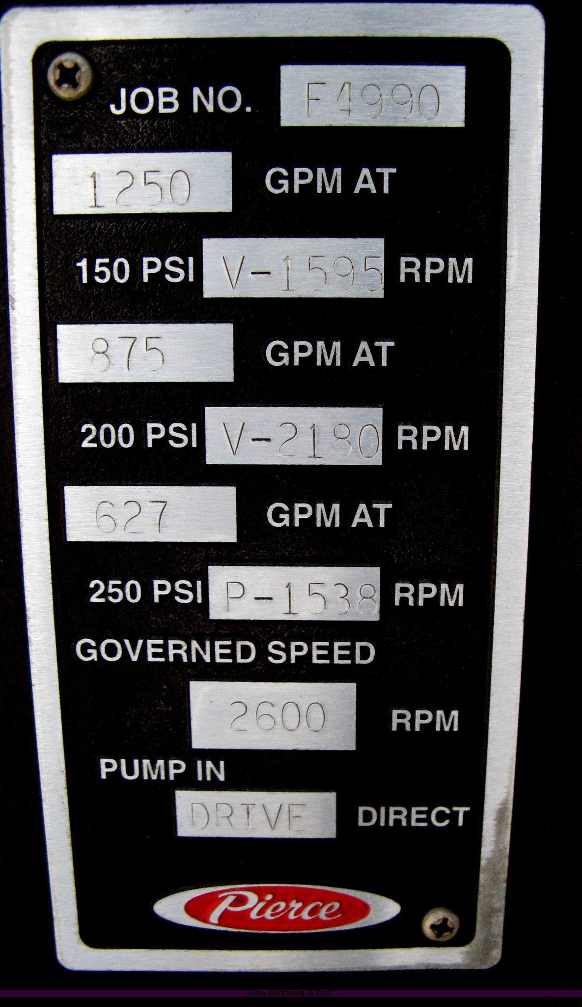 1993 Pierce pumper fire truck. 137,820 actual miles, 8,785 engine hours on meter, 745 pump hours on meter, Cummins C8.3 8.3L L6 diesel engine, Automatic transmission, Heat, Telescoping steering wheel, Manual windows, Air suspension driver's seat, Vinyl interior, Circulation fans, Rear AC, Spotlights, Waterous pumping apparatus Pump model CM, Trans model YCX, 1,250 gpm at 150 psig discharge, 600 psig max discharge, Top mount watering gun, Twin hose reels with hose, Canvas hose compartment cover, Side mount rescue extension ladder, Stow-away extension ladder, (7) side supply cabinets, (6) rear compartments, Honda EM5000S generator Electronic ignition, Slide-out tray mount, (2) Pike poles, Air brakes, Aluminum front wheels, 315/80R22.5 front tires, 12R22.5 rear tires, GVWR 38,600 lbs, Interior cosmetic damage, Unit# E230. Title distribution may be delayed up to 14 days from verification of funds. 4P1CT02M0PA000676. Sedgwick County Fire District. 1021 Stillwell St. Wichita, KS 67213