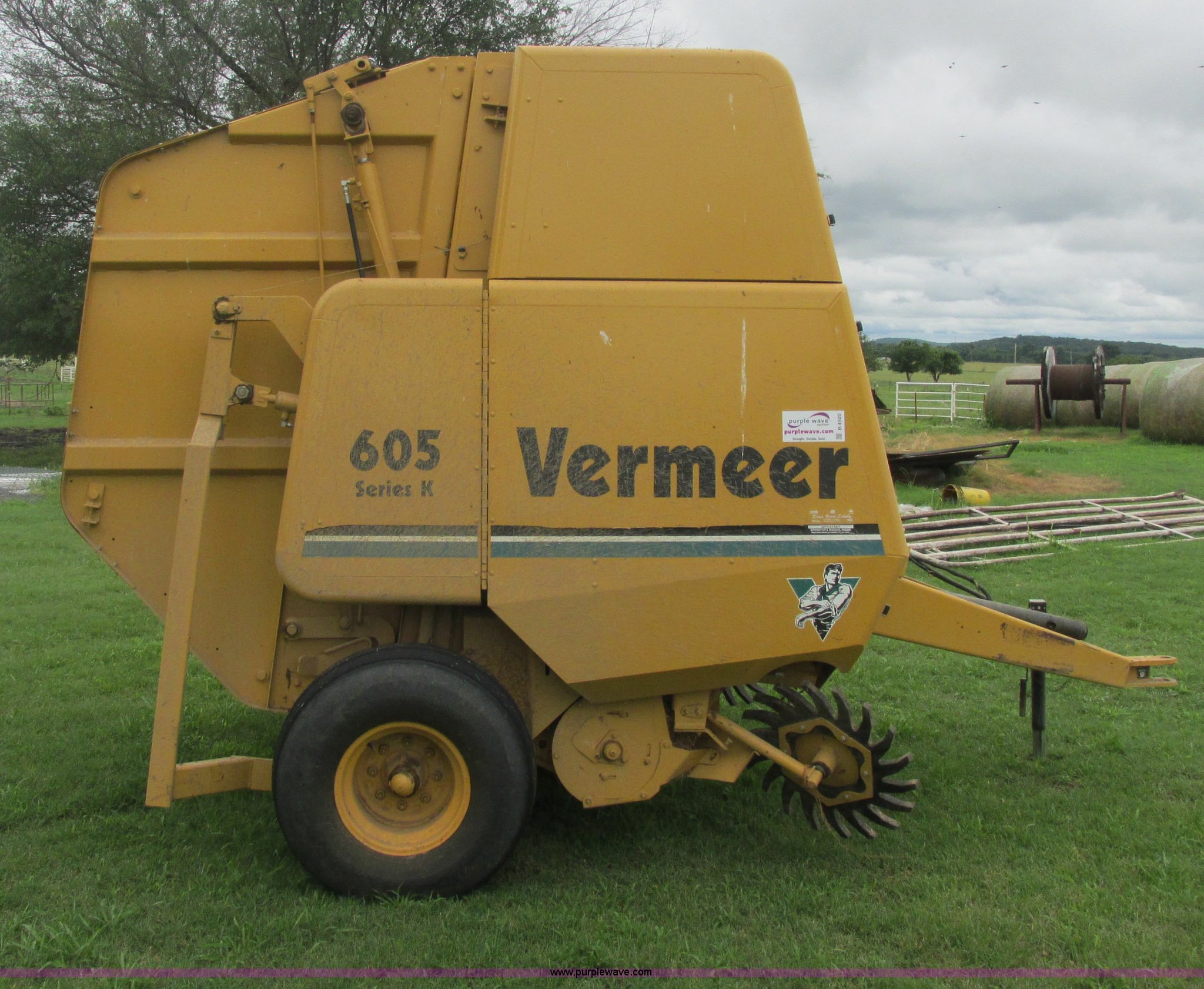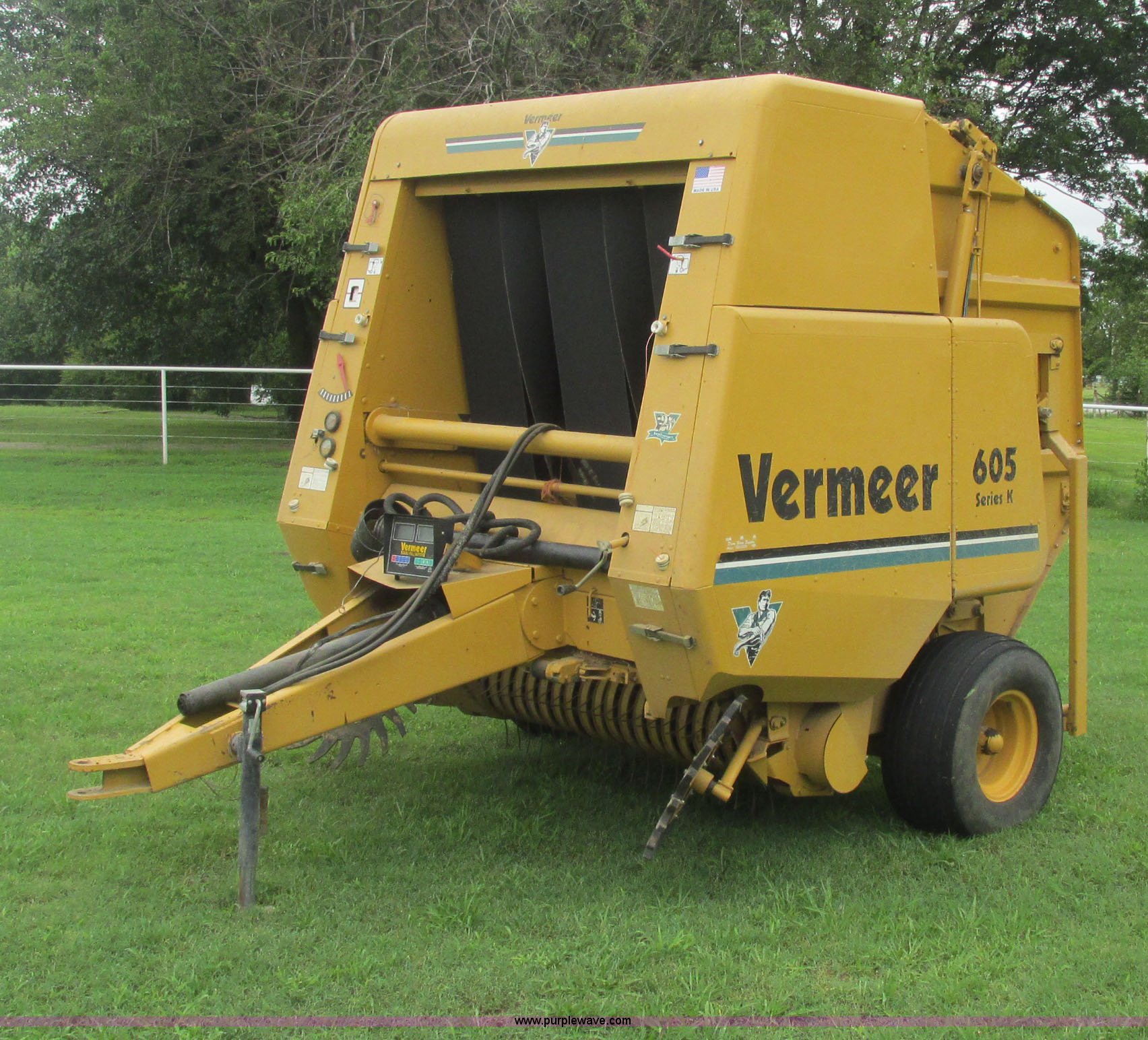 Purple Wave is selling a used Round Baler in Oklahoma. This item is a 1997 Vermeer 605K round baler with the following: 5' x 6' bale capacity, 540 PTO, Vermeer Equal-Fill/Auto tie montior, Gathering wheels, Auto-tie twine tie, Bale kicker, Pin hitch, 31x13.50-15SL tires, Serial 1VRB141P4V1004026