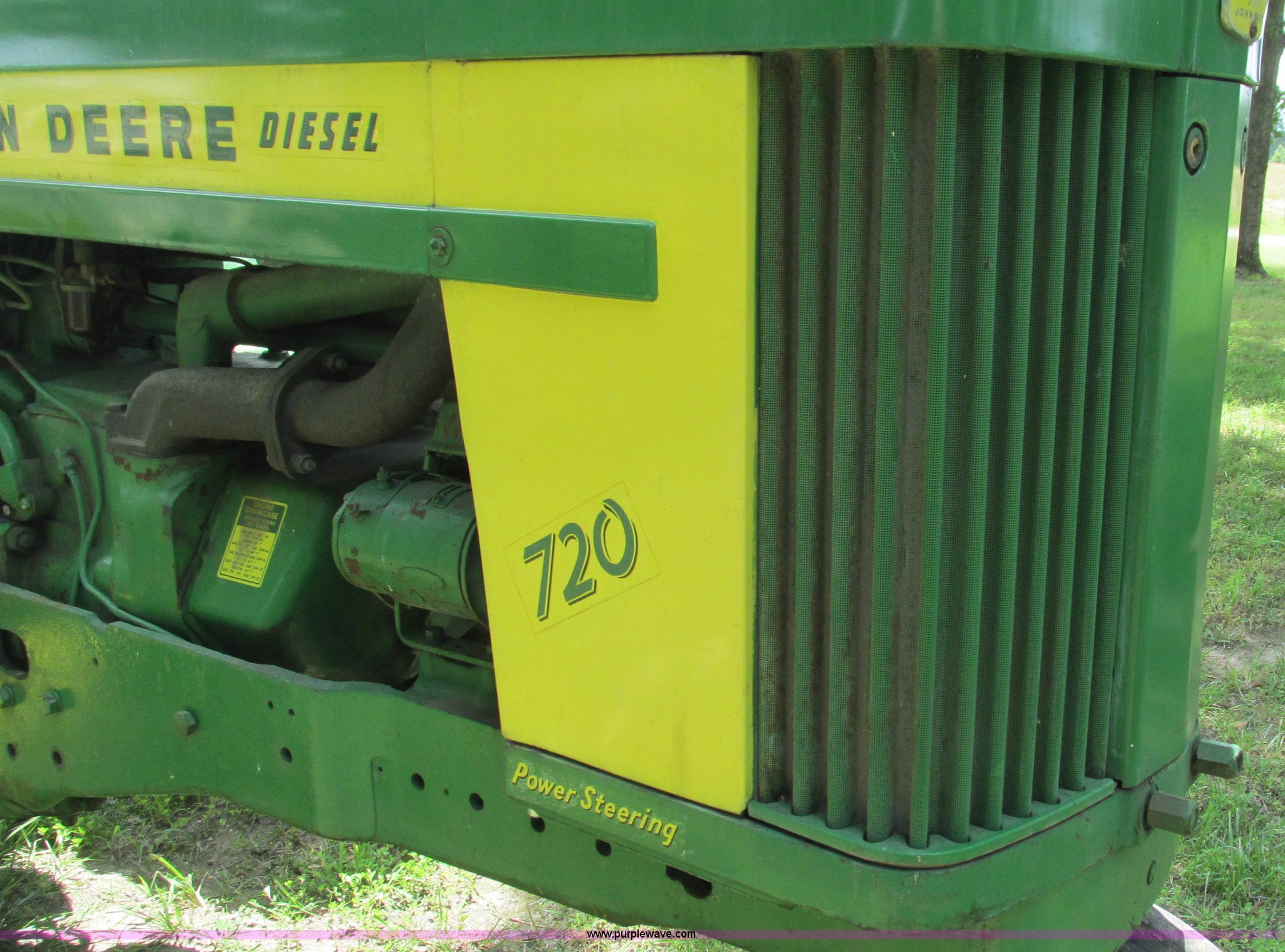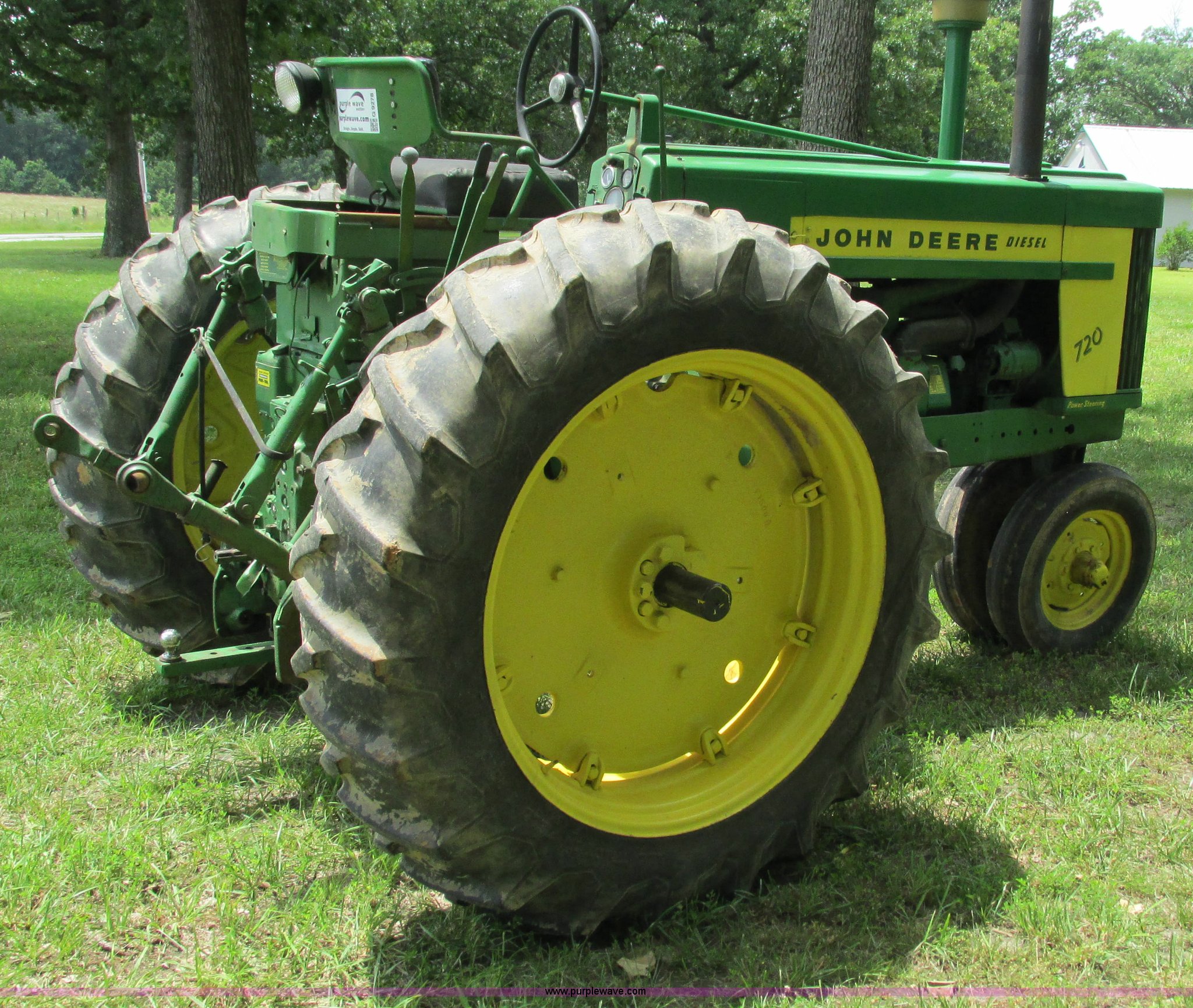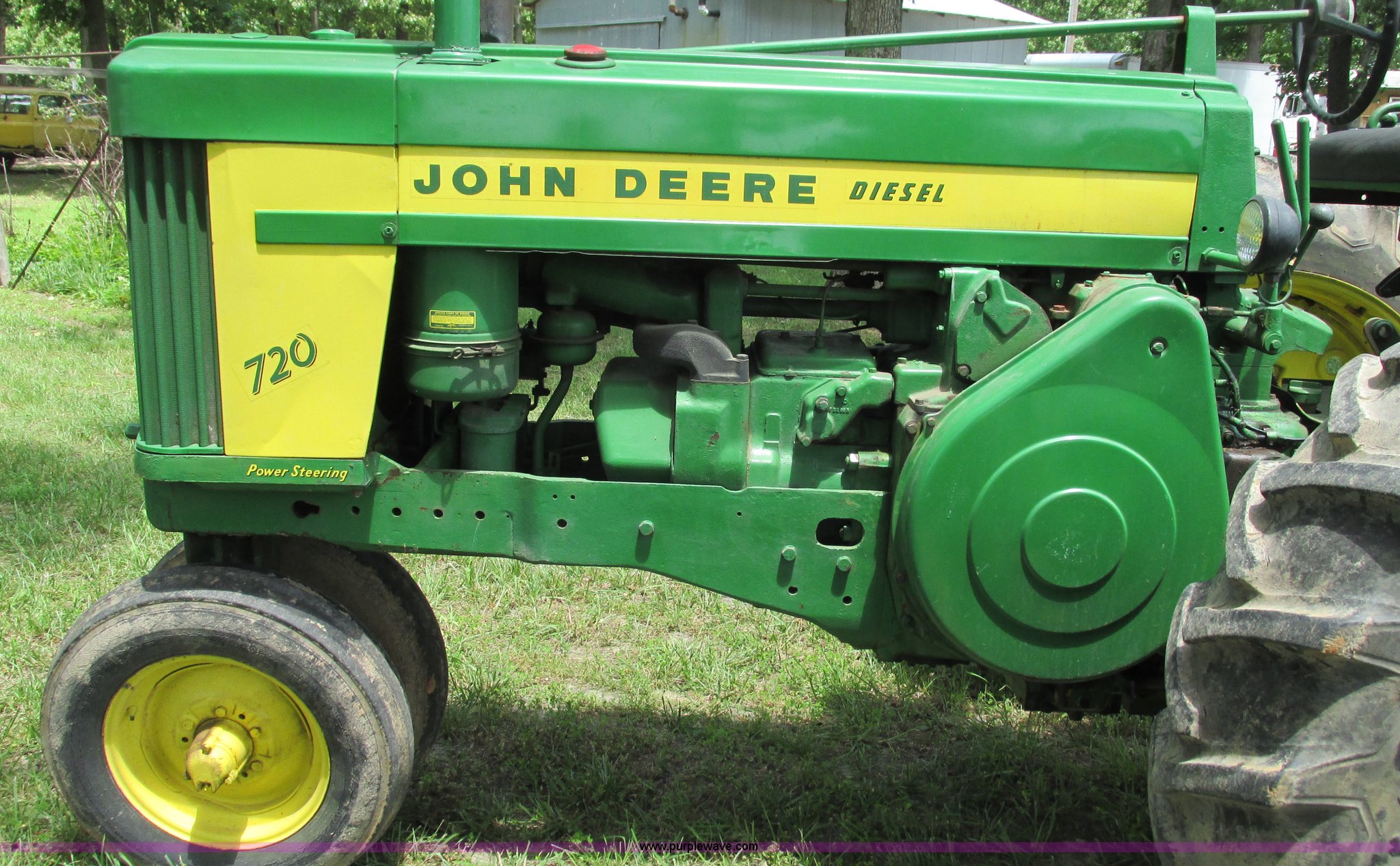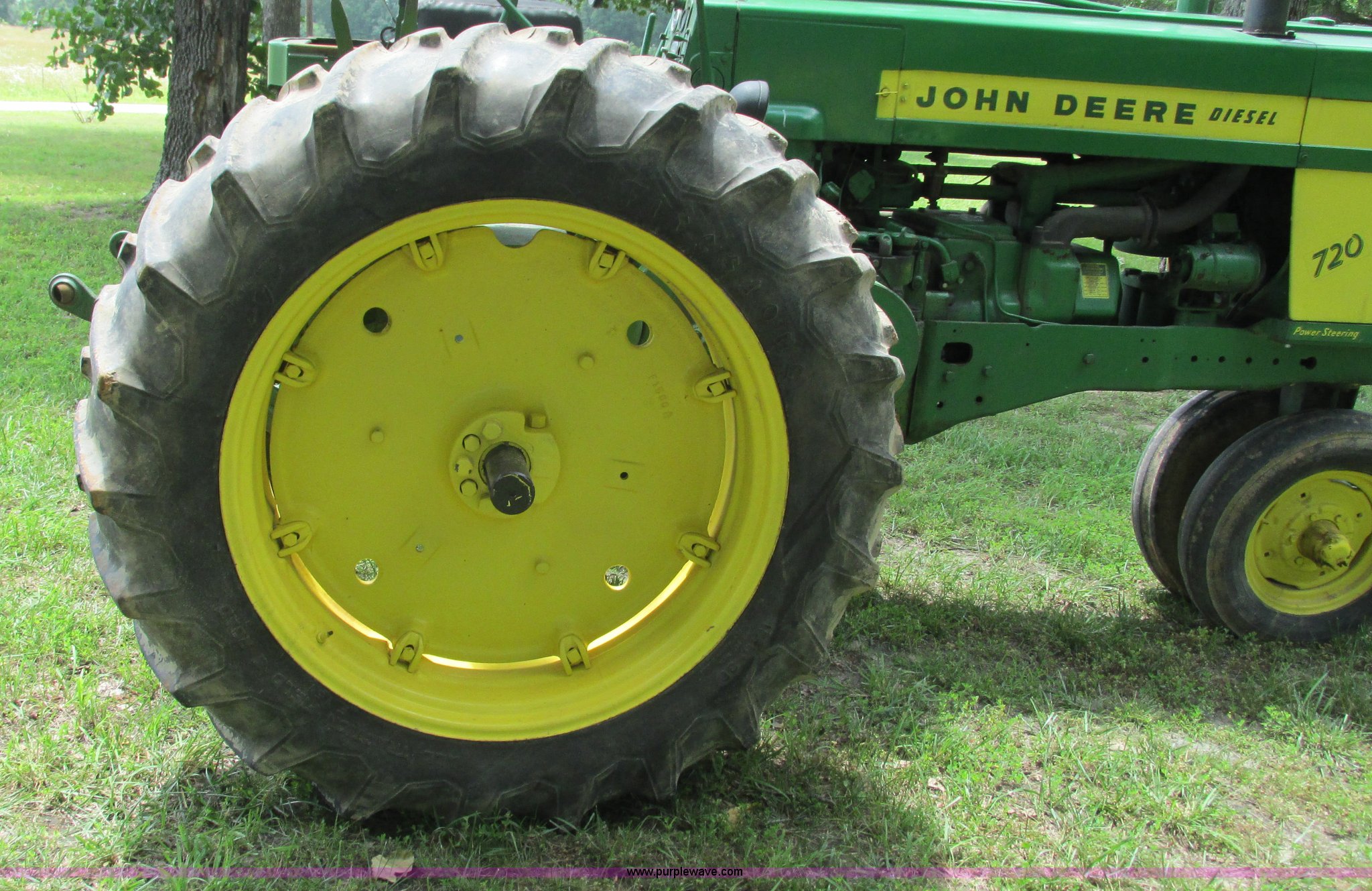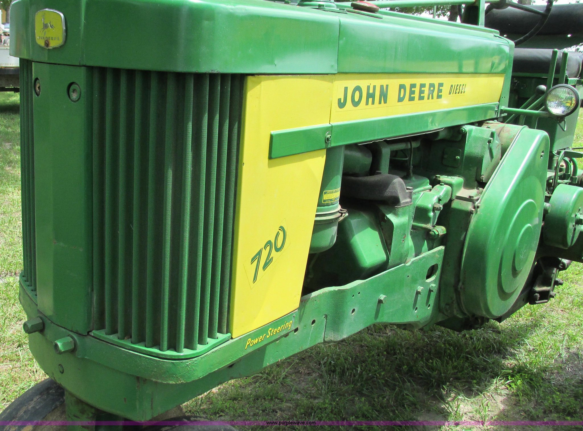 Purple Wave is selling a used Tractor in Missouri. This item is a 1957 John Deere 720 tractor with the following: 3,195 hours on meter, John Deere two cylinder diesel engine, Six speed transmission, Four cylinder gas pony engine, Power steering, Three point, 540 PTO, Live PTO, (2) work lights, Tow bar, 6.0x16 front tires, Cracked, 15.5x38 rear tires, Serial 7226986