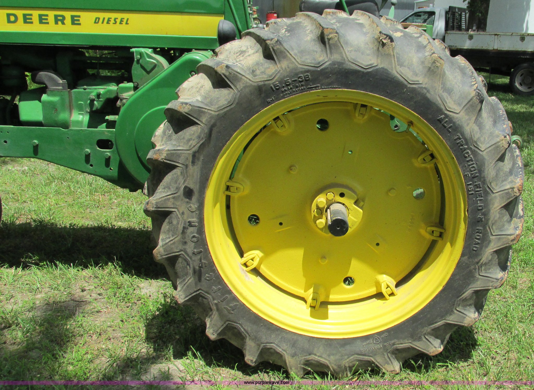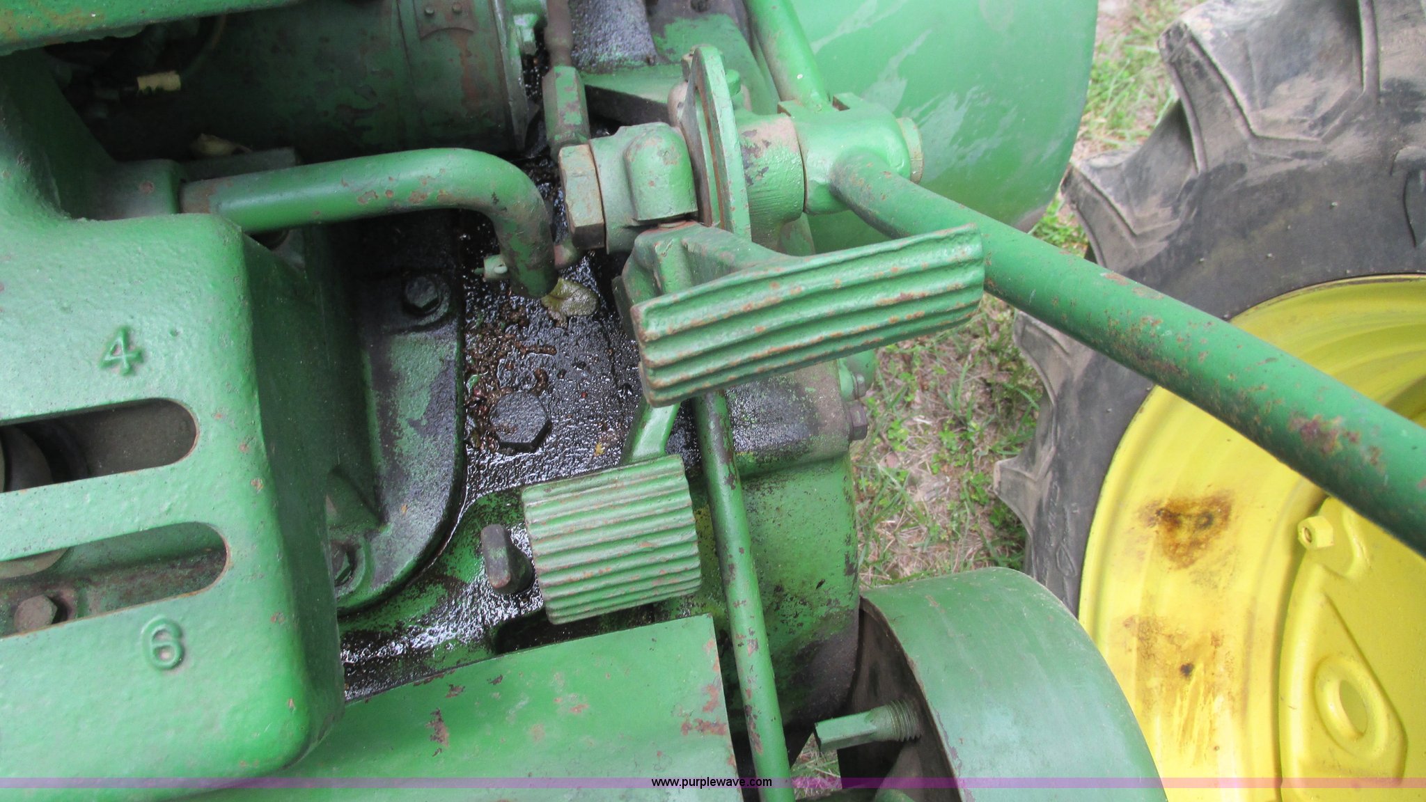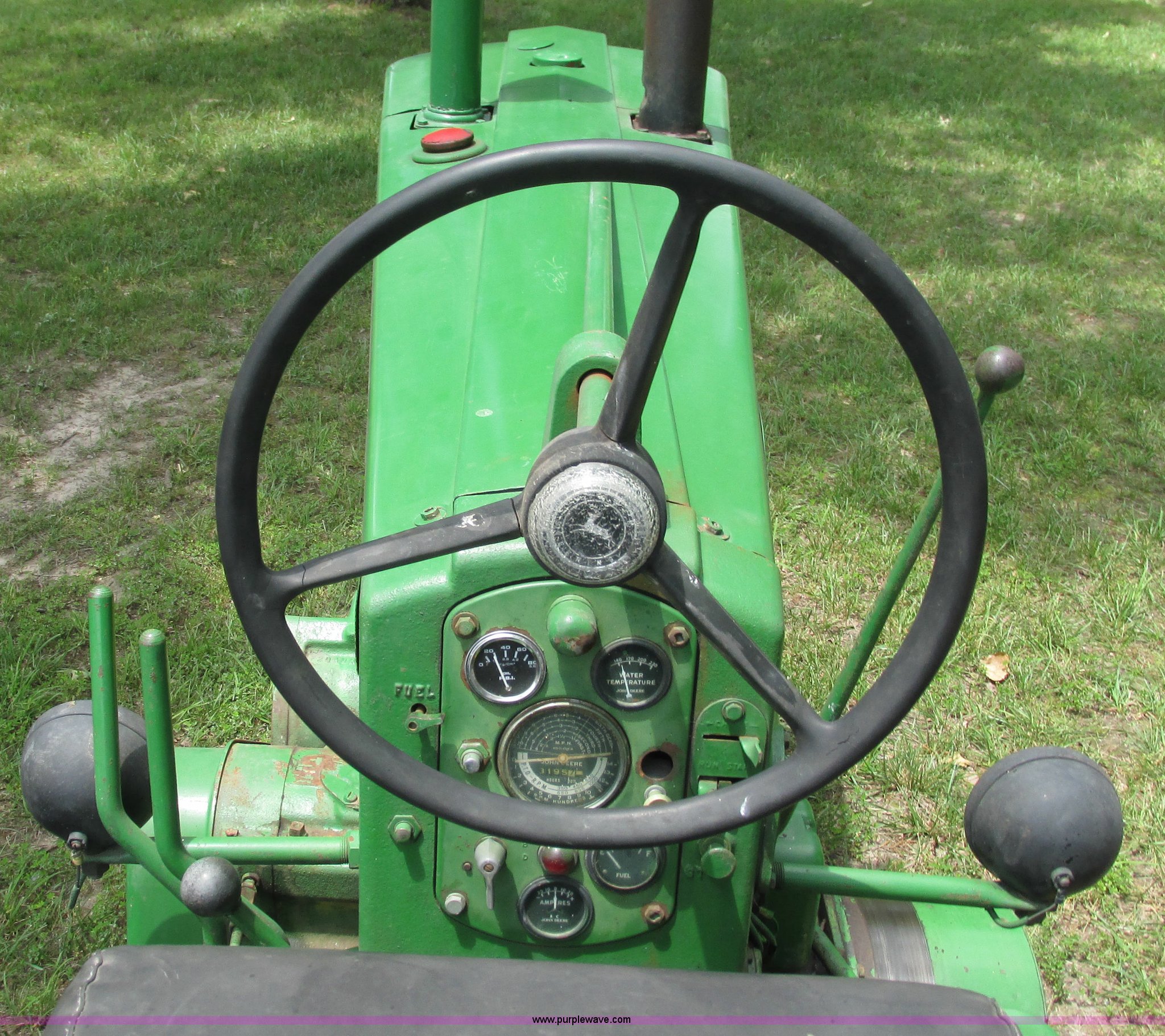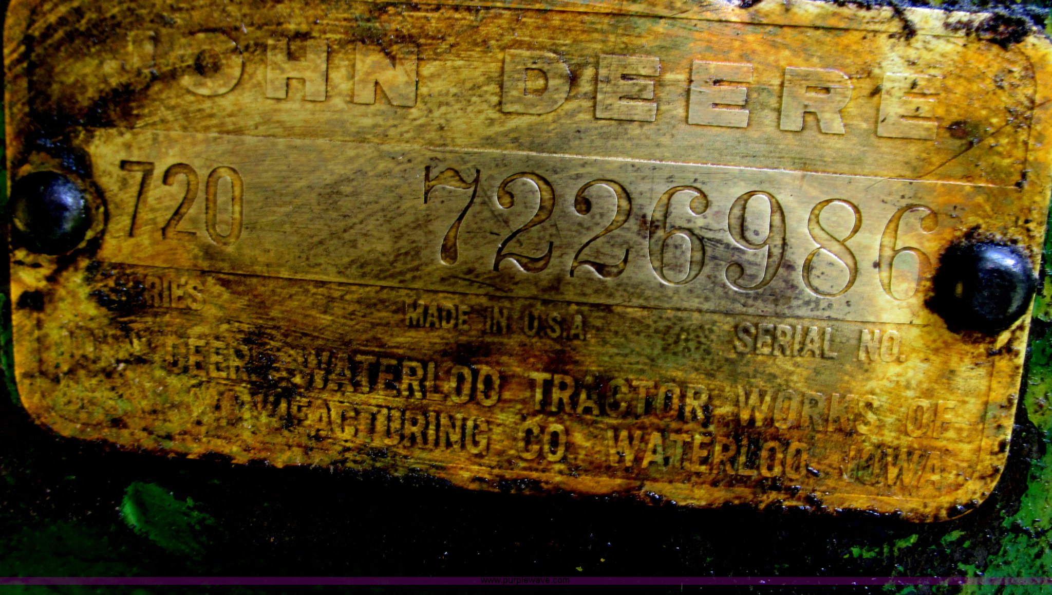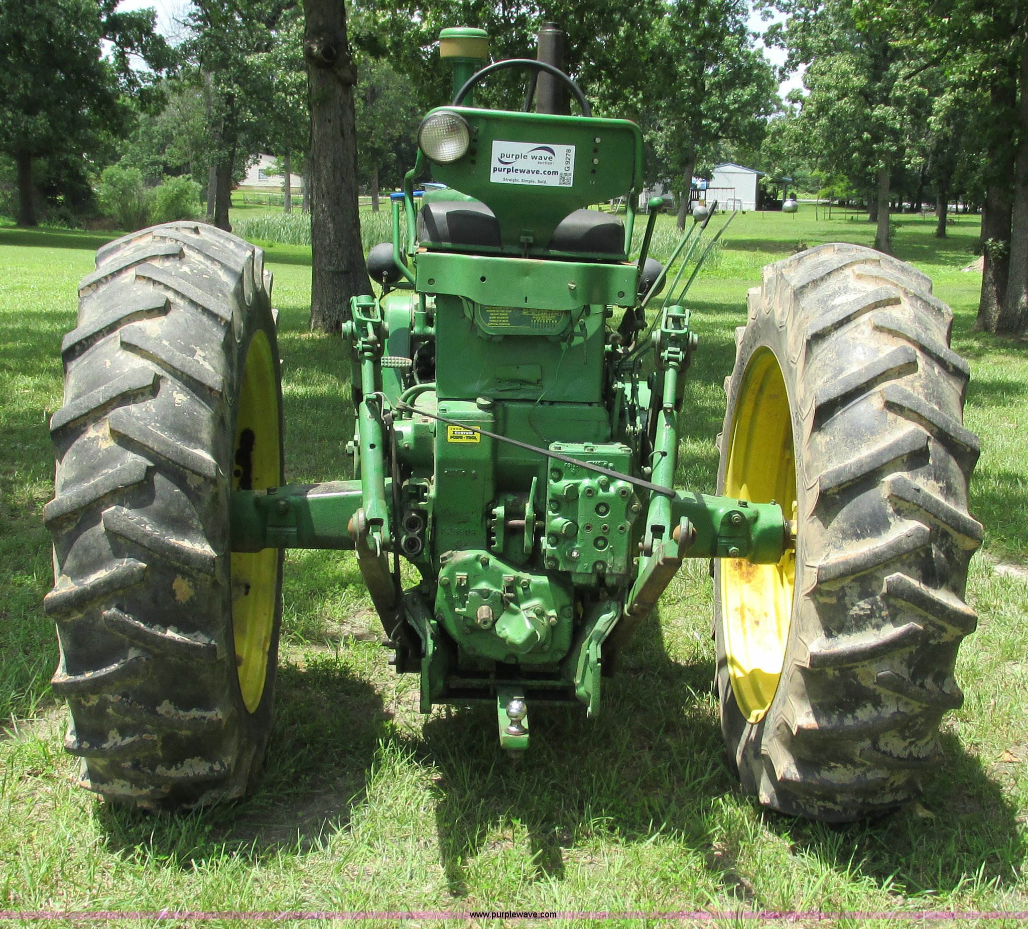 Purple Wave is selling a used Tractor in Missouri. This item is a 1957 John Deere 720 tractor with the following: 3,195 hours on meter, John Deere two cylinder diesel engine, Six speed transmission, Four cylinder gas pony engine, Power steering, Three point, 540 PTO, Live PTO, (2) work lights, Tow bar, 6.0x16 front tires, Cracked, 15.5x38 rear tires, Serial 7226986