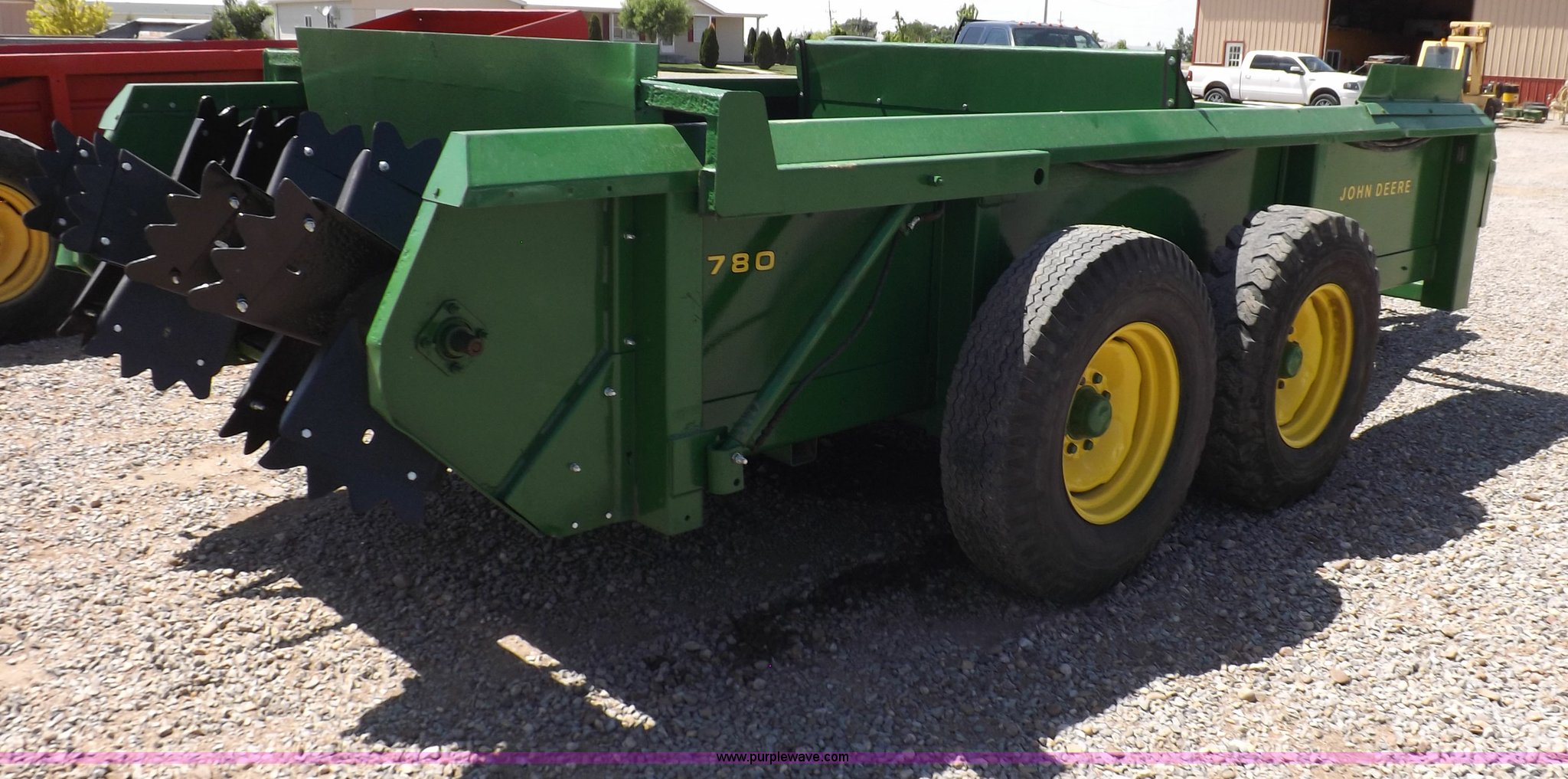 Purple Wave is selling a used Manure Spreader in Kansas. This item is a John Deere 780 manure spreader with the following: 15.5'L x 5'11"W box, Hydraulic tailgate, Pin hitch, 1000 PTO, 10.00-20 tires, Serial W00780X006475