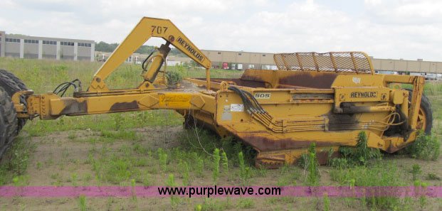 Purple Wave is selling a used Pull Type Scraper in Missouri. This item is a Reynolds C-14E10.5 pan scraper with the following: 10.5 cubic yard capacity, 17.5 x 25 tires, Serial 28841, Unit# 707B
