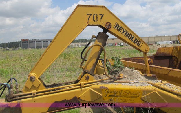 Reynolds C-14E10.5 pan scraper. 10.5 cubic yard capacity, 17.5 x 25 tires, Serial 28841, Unit# 707B. George Shaw Construction. 1601 Bellefontaine. Kansas City, MO 64127