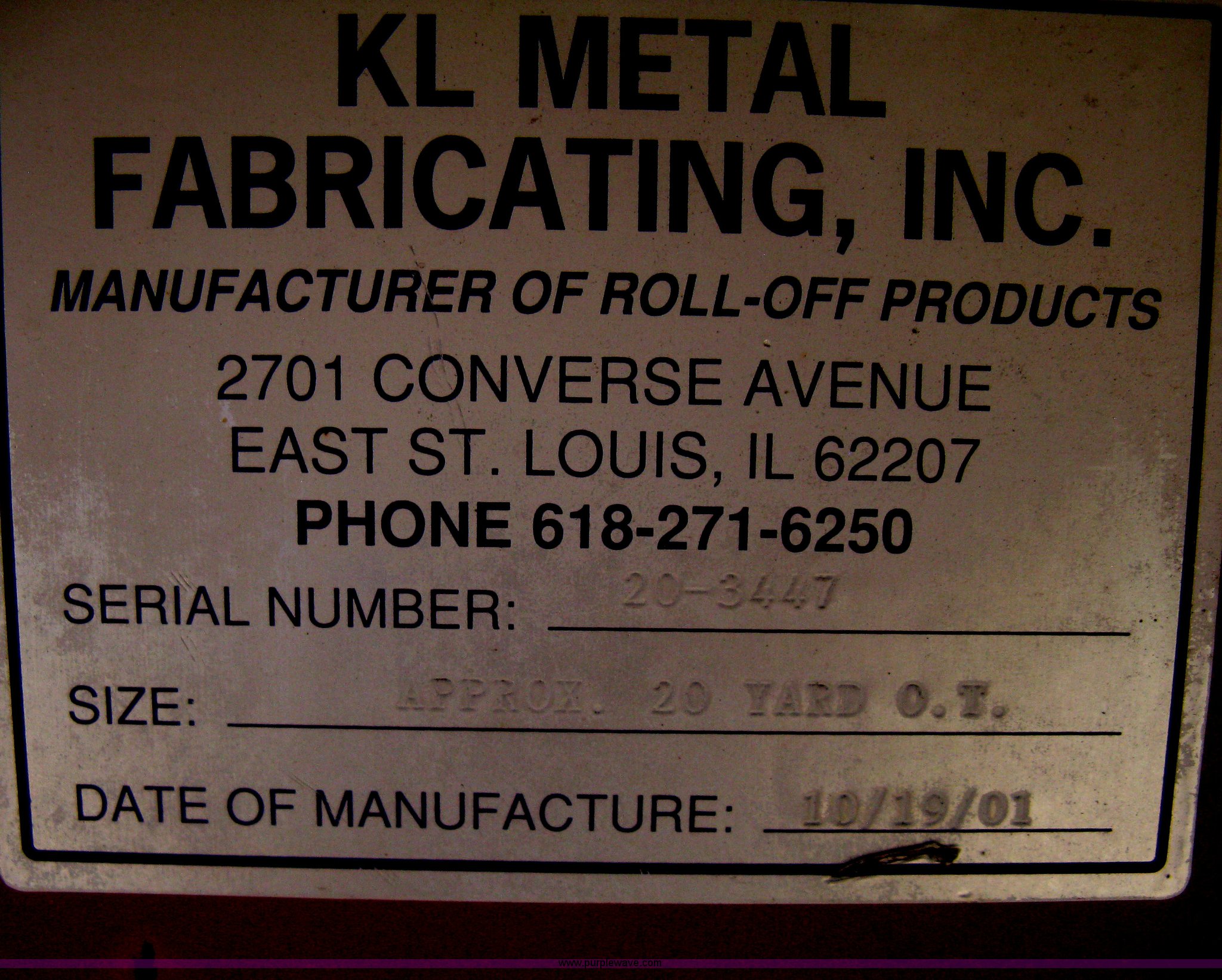 2001 KL Metal Fab roll off dumpster. Approximately 20 yard O.T., Steel construction, Full rear end gate, 30" centers on side wall frame, 20'L x 89"W, 42"H side walls, Serial 20-3447. Martin Roofing. 102 E Patterson. Wichita, KS 67216