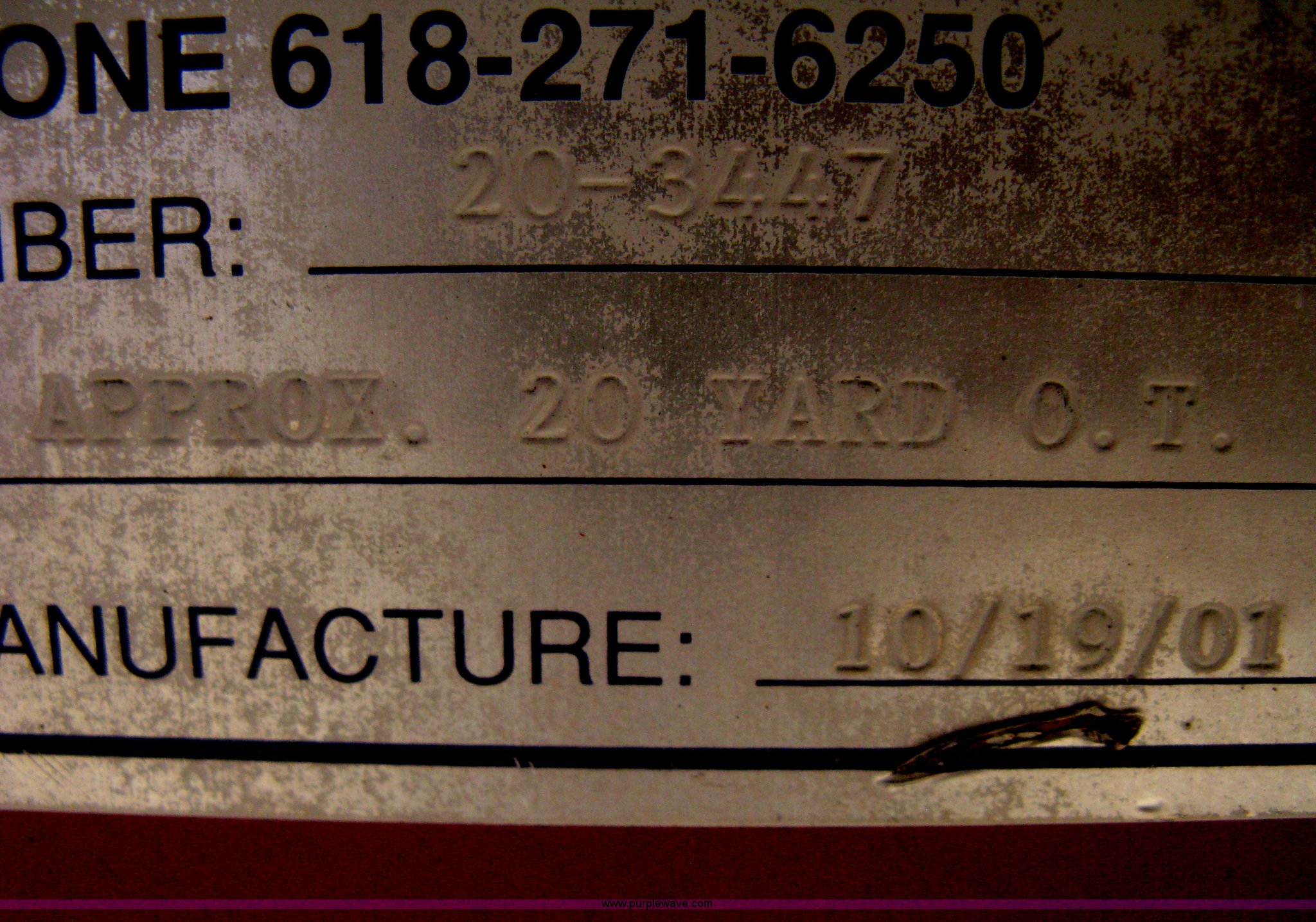 Purple Wave is selling a used Refuse or Compaction Equip. in Kansas. This item is a 2001 KL Metal Fab roll off dumpster with the following: Approximately 20 yard O.T., Steel construction, Full rear end gate, 30" centers on side wall frame, 20'L x 89"W, 42"H side walls, Serial 20-3447