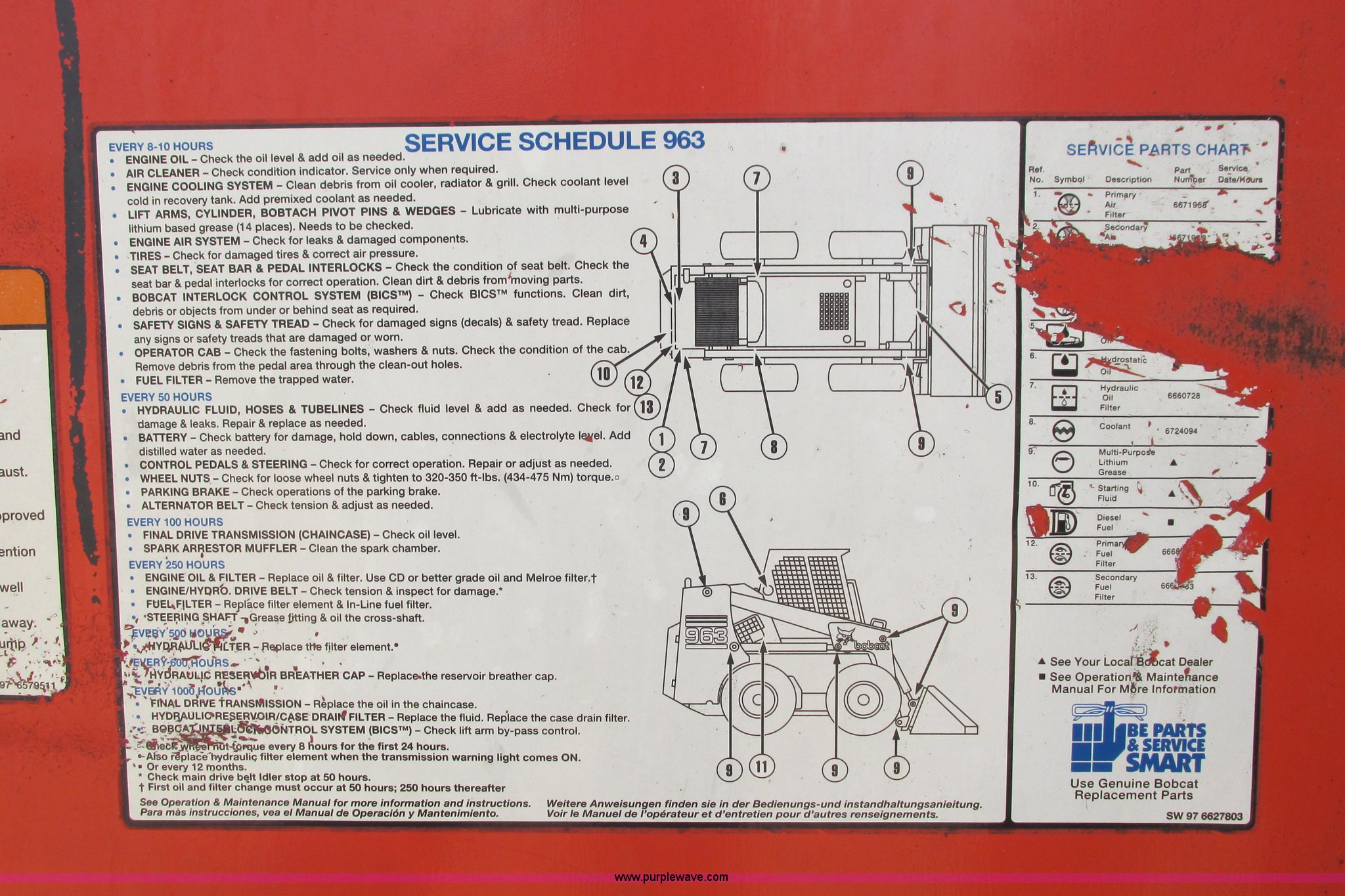 Purple Wave is selling a used Skid Steer Loader in Texas. This item is a 1998 Bobcat 963 skid steer with the following: 2,273 hours on meter, Perkins four cylinder diesel engine, Hydrostatic transmission, Hand and foot controls, Spring suspension seat, Front work lights, Bobcat 79"W bucket, 1/2 cubic yard capacity, Eight bolt-on teeth, Manual quick coupler, 5.2 mph maximum travel speed, 32.5 gallon fuel tank, 3,000 lbs rated operating capacity, 6,350 lbs tipping load, 9,900 lbs lbs. base operating weight, 14 x 17.5 foam filled tires, Headliner torn and sagging, Serial 562211020