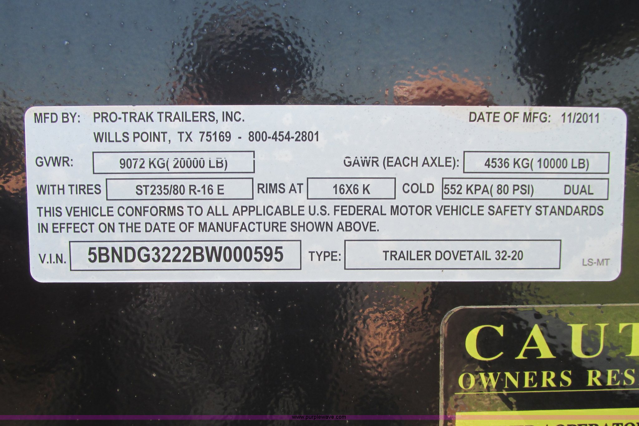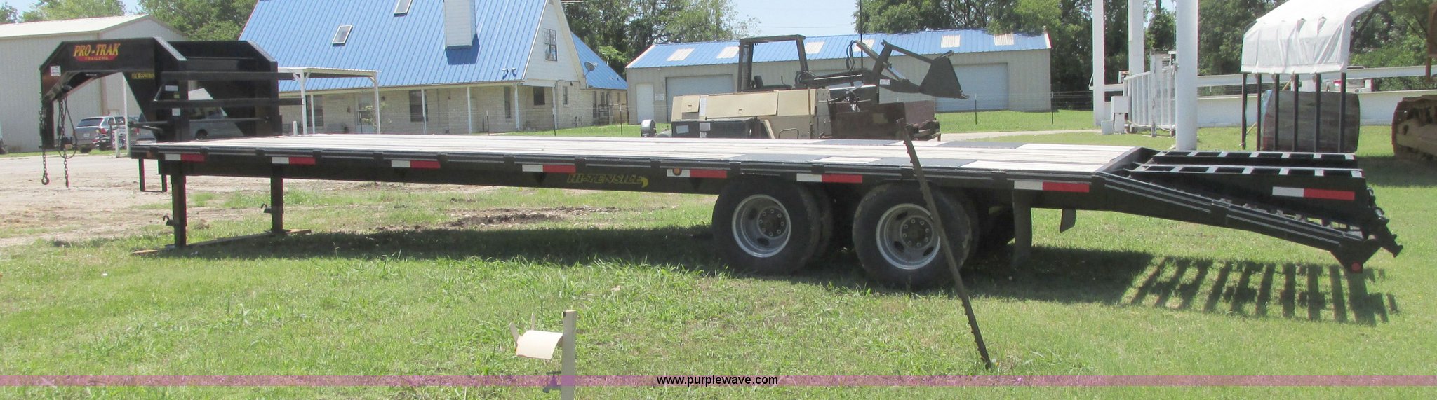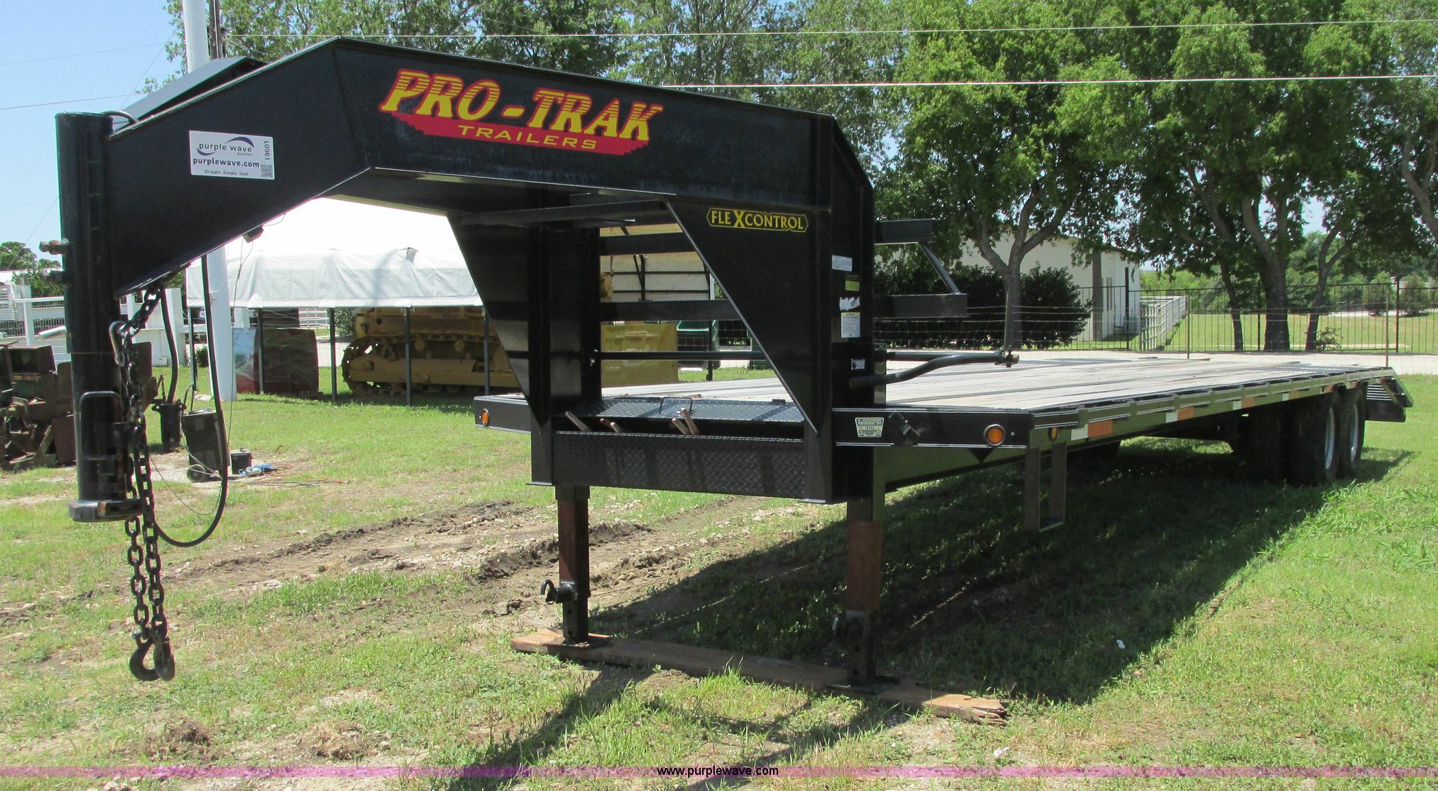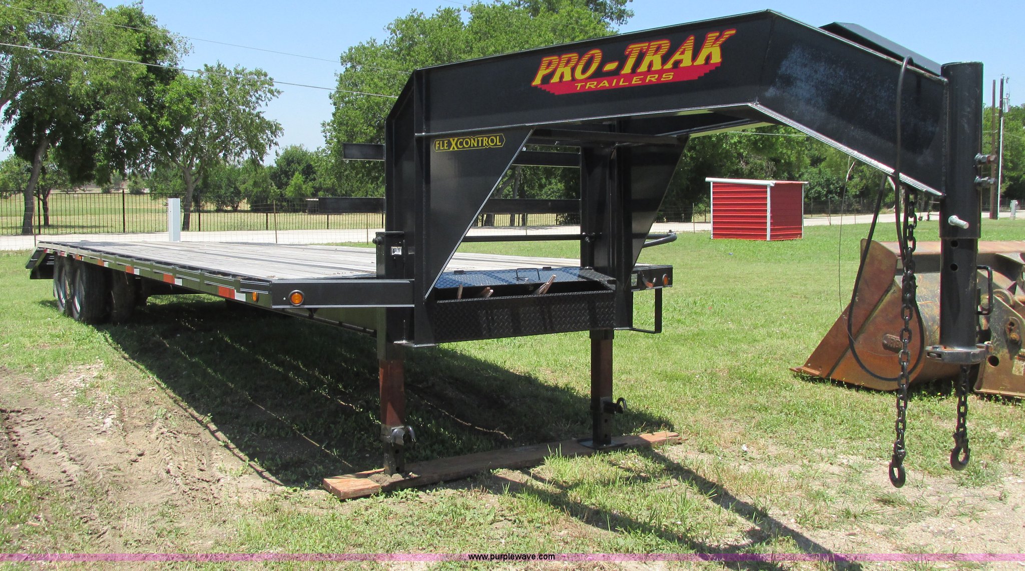 Purple Wave is selling a used Flat or Drop Deck Trailer in Texas. This item is a 2011 Pro-Trak gooseneck trailer with the following: 27'L x 8'W deck, 5'L x 8'W dovetail, 8'L neck, High tensile steel construction with flex control, 5'L x 24"W spring assisted ramps, Stake side pockets with rub rail, Locking storage box, 43"L x 24"W, Two speed dual leg landing gear, Safety brake away system, Spring suspension, Electric brakes, ST235/80R16 tires, GVWR 20,000 lbs, GAWR 10,000 lbs, Items in storage box are not included