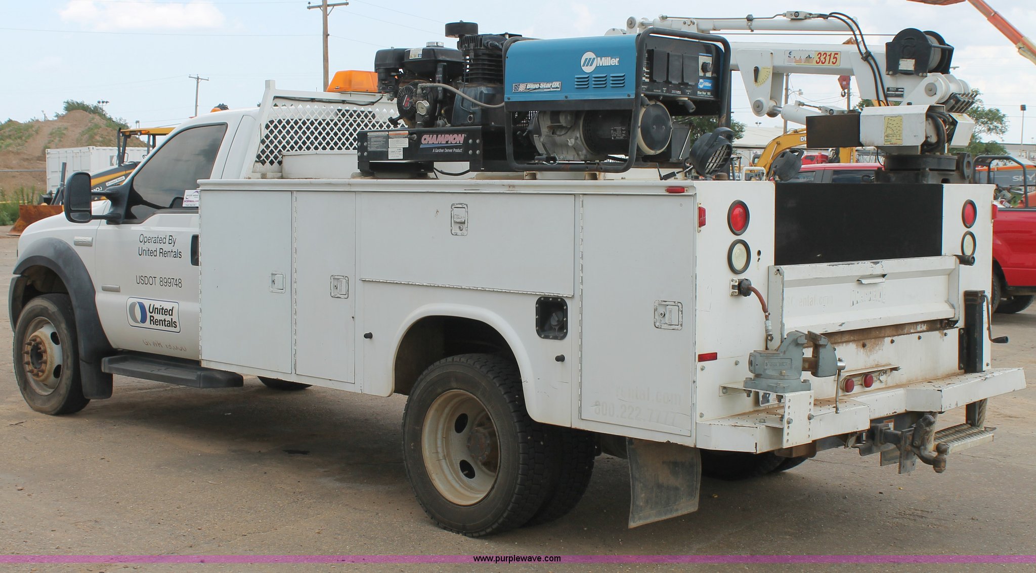 2006 Ford F550 service truck with crane. 132,162 actual miles, 6.0L V8 OHV 32V turbo diesel engine 325 HP, Automatic transmission, AC and heat, Tilt, Cruise, AM/FM/CD, Manual windows and locks, Vinyl interior, Rear work lights, Vise, Utility bed (8) storage compartments, Six drawer toolbox, (3) oil hose reels, Air hose reel, Miller BlueStar 185 welder 54 hours on meter, Kohler 12.75 HP engine, Electric start, Leads, Champion AS2-SH09-CHP air compressor Honda GX270 engine, Electric start, Serial 20077676, 2006 Stellar 3315 crane Extends to 16'9", 3,200 lbs capacity, Amber strobe light, Receiver hitch, Trailer wiring, 225/70R19.5 tires, GVWR 19,000 lbs, FAWR 6,000 lbs, RAWR 13,660 lbs, EIN 631271RA. View item removal requirement and like-kind exchange information. 1FDAF56P76EB73428. United Rentals - Amarillo. 3900 I-40 East. Amarillo, TX 79103