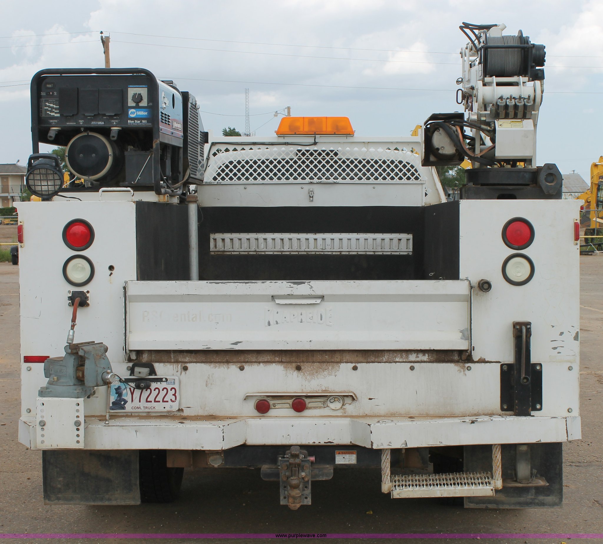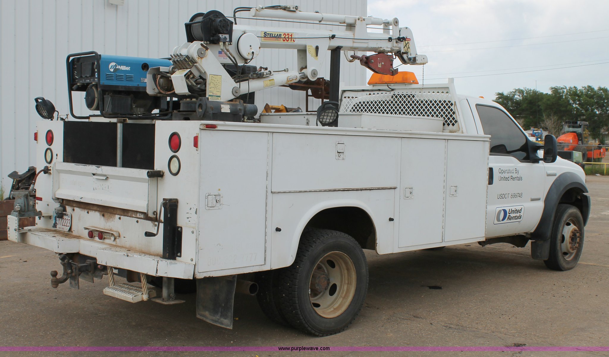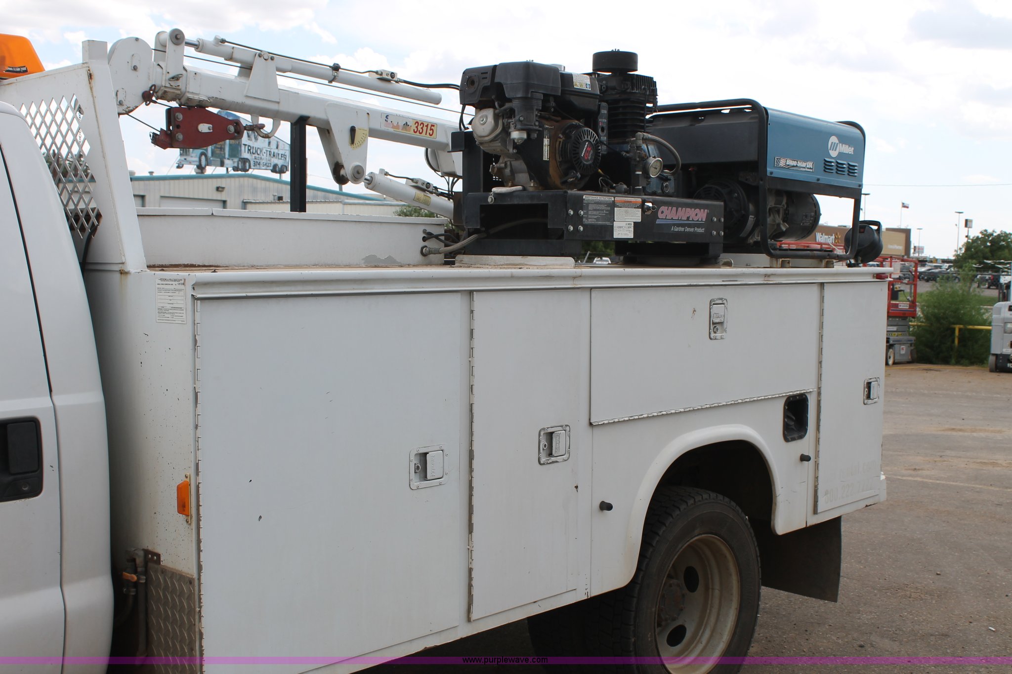Purple Wave is selling a used Service Truck in Texas. This item is a 2006 Ford F550 service truck with crane with the following: 132,162 actual miles, 6.0L V8 OHV 32V turbo diesel engine, 325 HP, Automatic transmission, AC and heat, Tilt, Cruise, AM/FM/CD, Manual windows and locks, Vinyl interior, Rear work lights, Vise, Utility bed, (8) storage compartments, Six drawer toolbox, (3) oil hose reels, Air hose reel, Miller BlueStar 185 welder, 54 hours on meter, Kohler 12.75 HP engine, Electric start, Leads, Champion AS2-SH09-CHP air compressor, Honda GX270 engine, Electric start, Serial 20077676, 2006 Stellar 3315 crane, Extends to 16'9", 3,200 lbs capacity,, Amber strobe light, Receiver hitch, Trailer wiring, 225/70R19.5 tires, GVWR 19,000 lbs, FAWR 6,000 lbs, RAWR 13,660 lbs, EIN 631271RA