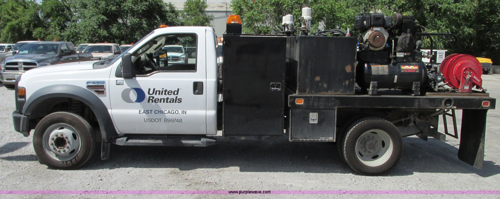 2008 Ford F550 XL service truck. 43,760 miles on odometer Miles may vary, still in use, 6.4L V8 OHV 32V turbo diesel engine, Automatic transmission, AC and heat, Tilt, Cruise, AM/FM/CD, Manual windows and locks, Vinyl interior, Running boards, Strobe light, Knapheide 9'4"L flatbed (4) storage bins, Three piece 112 gallon lube tanks 336 gallons total capacity, Hoses and reels, Air compressor, Rear boarding ladder and hand rails, Receiver hitch, Trailer wiring, 225/70R19.5 tires, Recently replaced tires and mud flaps, Interior/exterior cosmetic damage, Contents in tool bins and cab not included, EIN 708011RA. View item removal requirement and like-kind exchange information. 1FDAF56RX8EB77123. United Rentals - East Chicago. 300 W Chicago Ave. East Chicago, IN 46312