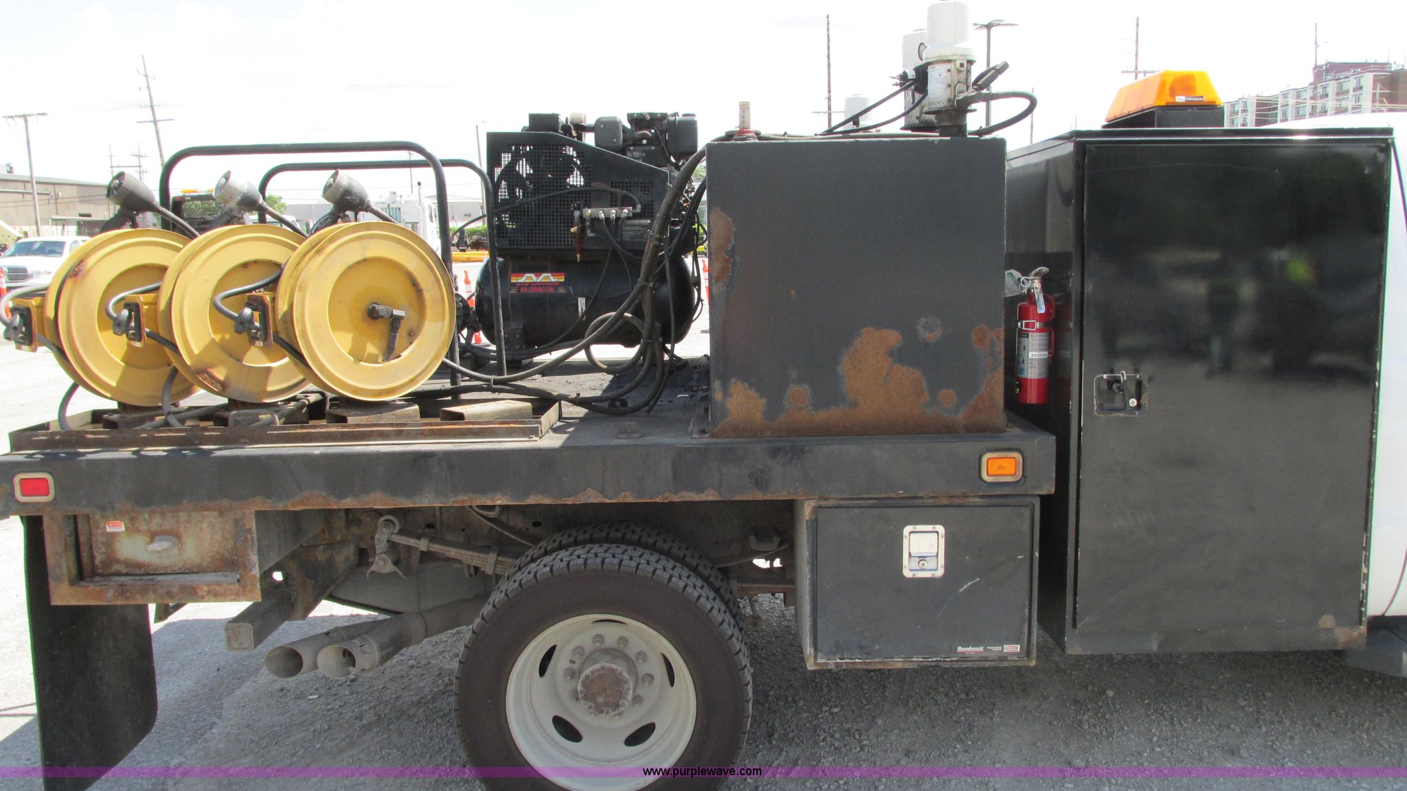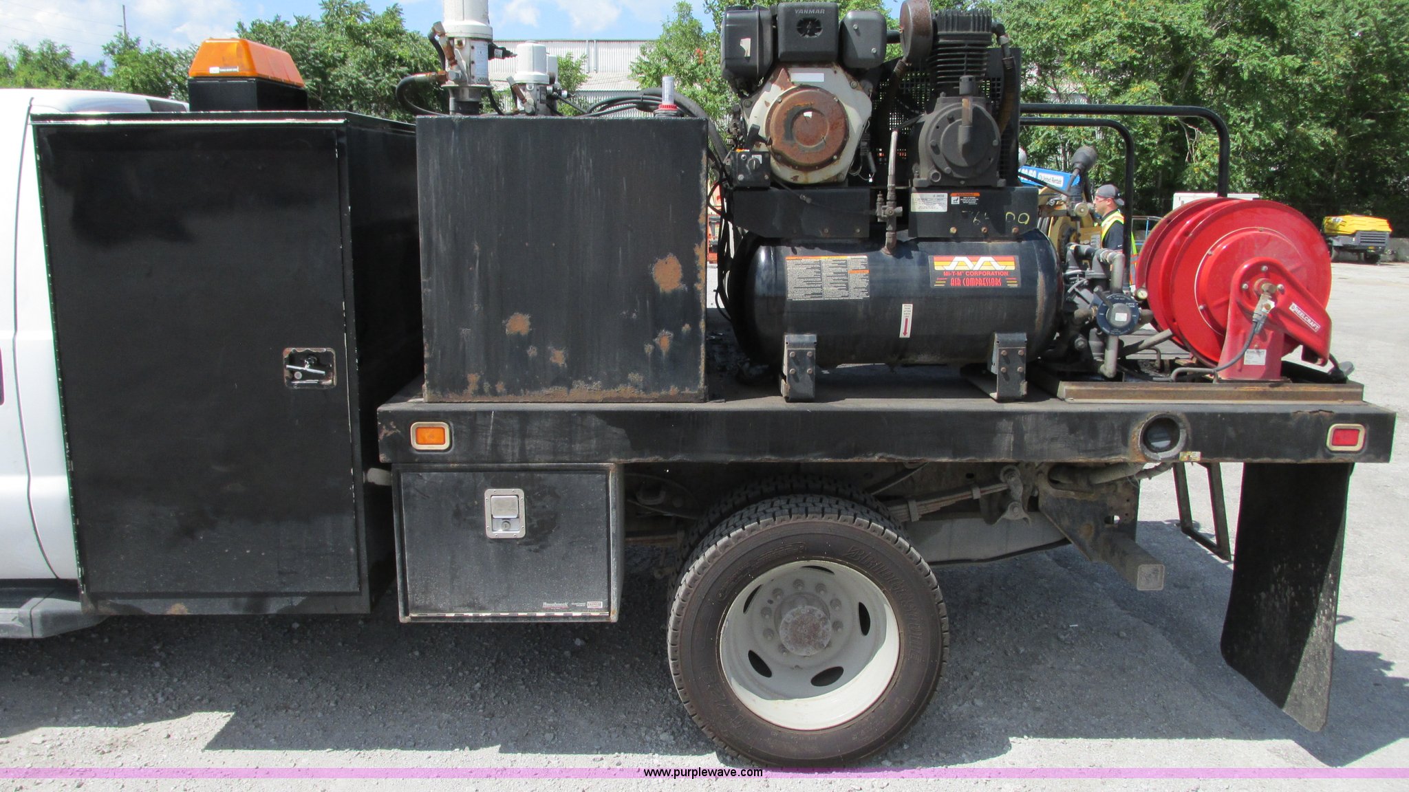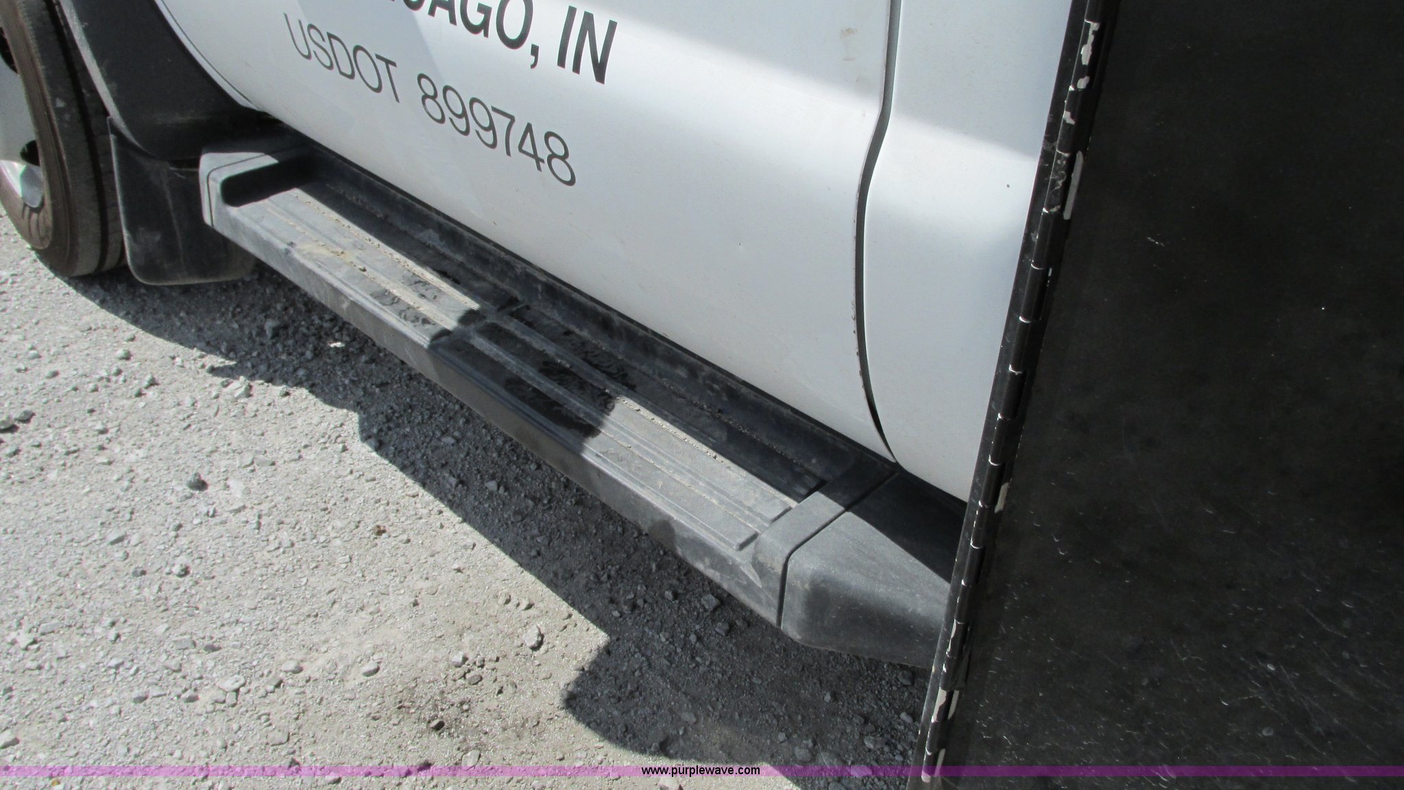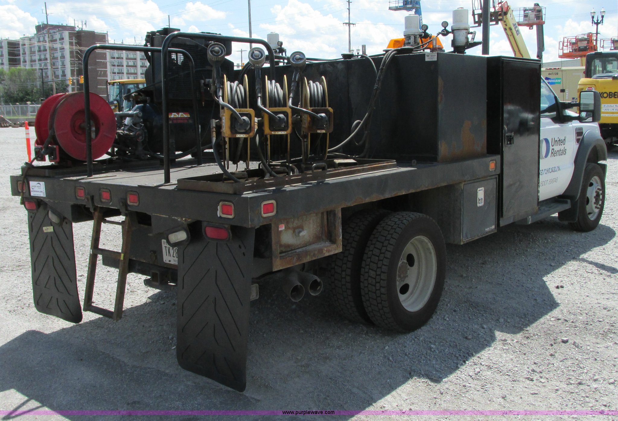 Purple Wave is selling a used Service Truck in Indiana. This item is a 2008 Ford F550 XL service truck with the following: 43,760 miles on odometer, Miles may vary, still in use, 6.4L V8 OHV 32V turbo diesel engine, Automatic transmission, AC and heat, Tilt, Cruise, AM/FM/CD, Manual windows and locks, Vinyl interior, Running boards, Strobe light, Knapheide 9'4"L flatbed, (4) storage bins, Three piece 112 gallon lube tanks, 336 gallons total capacity, Hoses and reels, Air compressor,, Rear boarding ladder and hand rails, Receiver hitch, Trailer wiring, 225/70R19.5 tires, Recently replaced tires and mud flaps, Interior/exterior cosmetic damage, Contents in tool bins and cab not included, EIN 708011RA